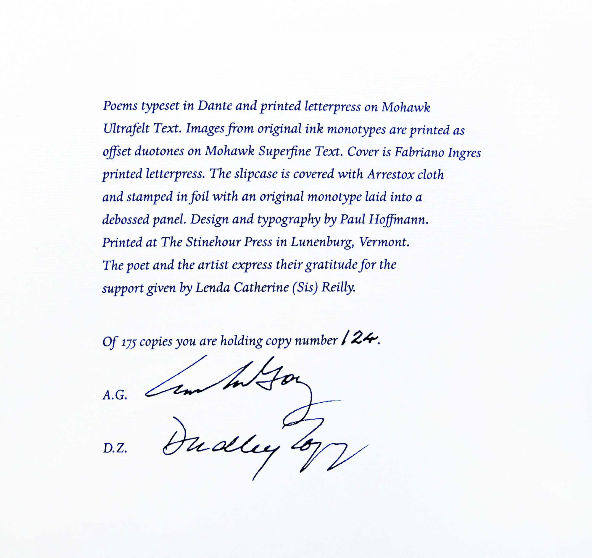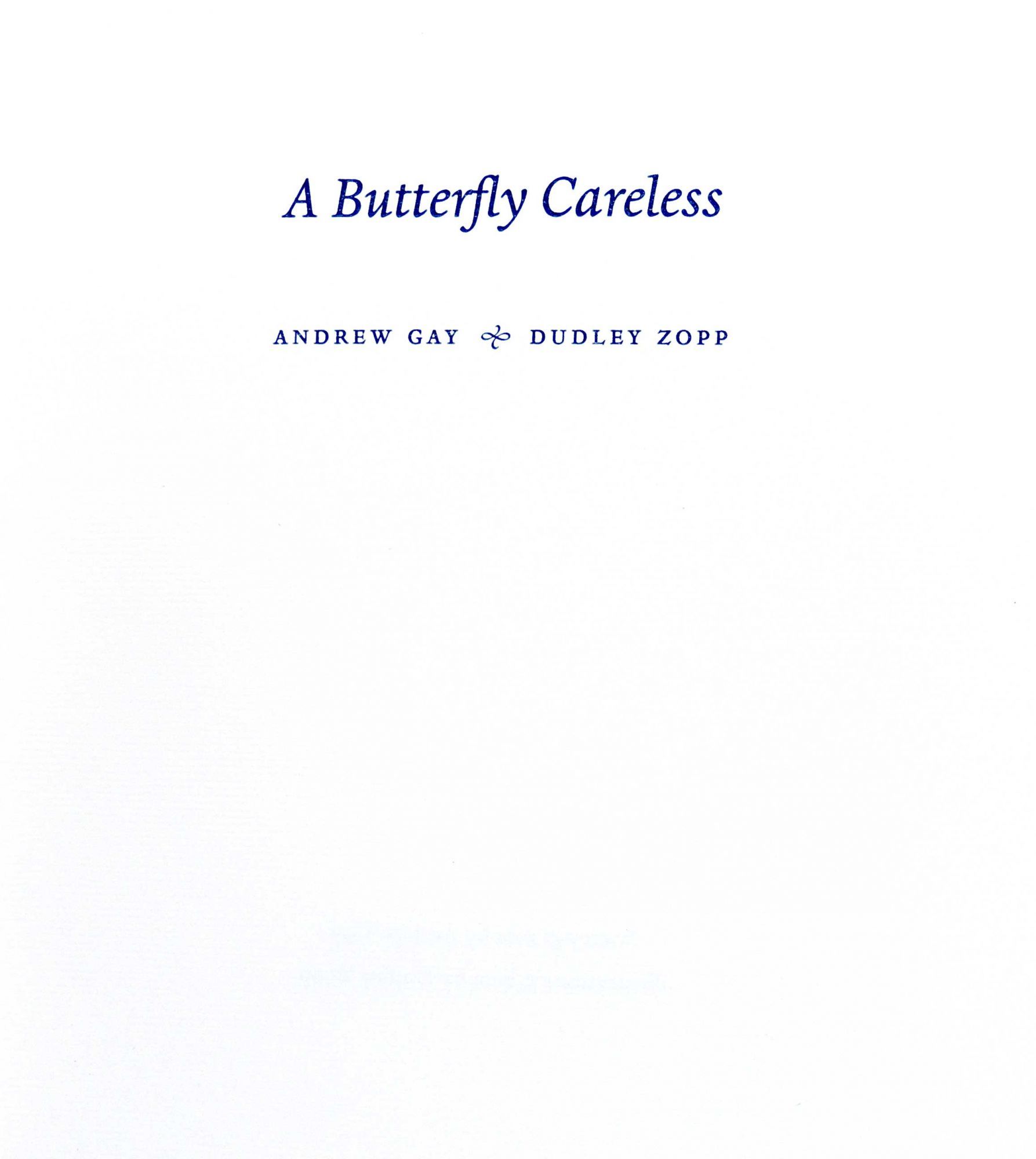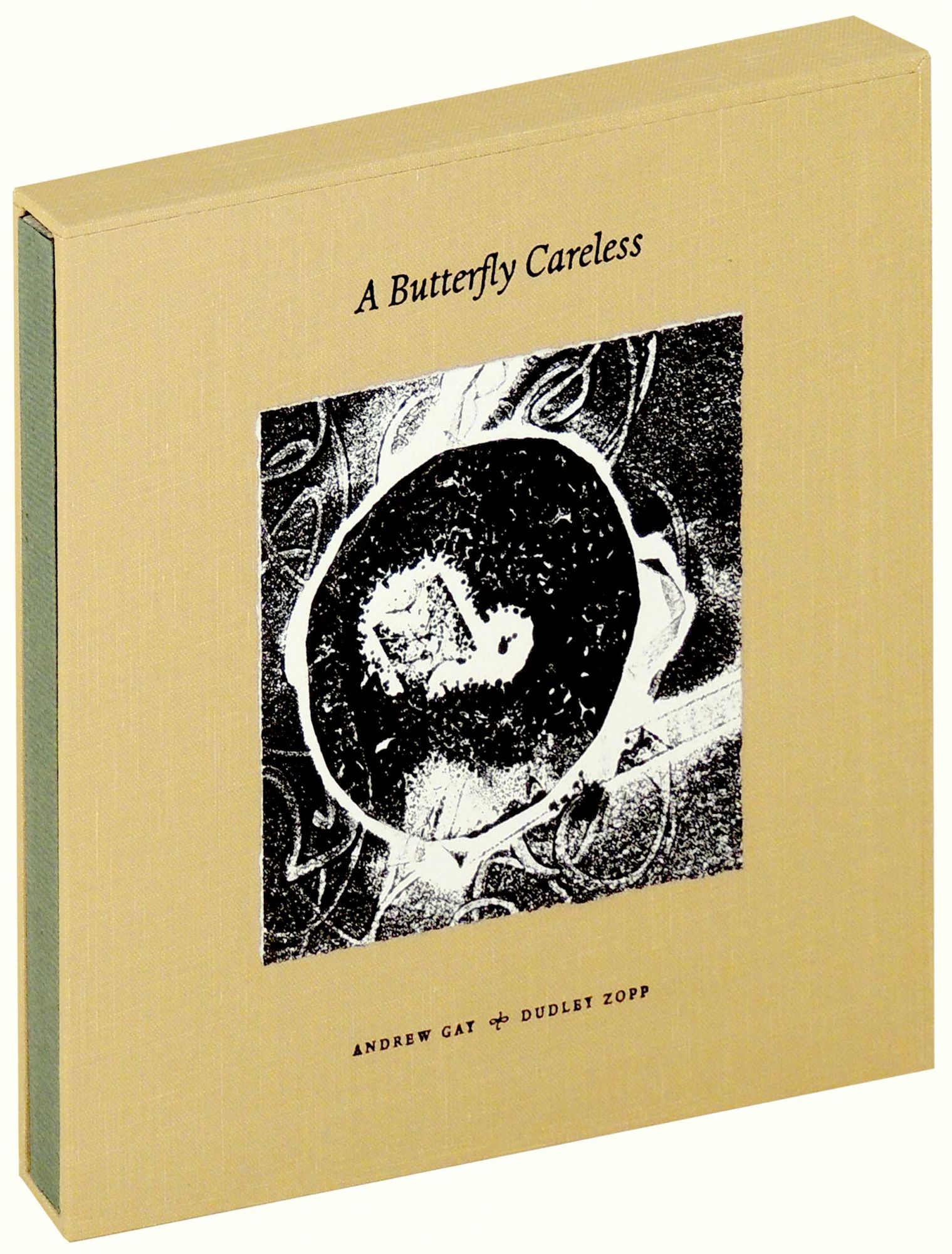 Belfast, ME: Dudley Zopp, 2001. Fine. Number 124 of 175 copies. Signed by the author and artist. "A Butterfly Careless" includes 37 haiku-like poems by Andrew Gay and four monotypes by artist Dudley Zopp. The two met during meetings of a local writers' group, and discovered they had similar artistic interests. "I think he wanted to talk to me about doing the book because my sensibilities about the natural world were similar to his," Zopp said. "He was just so very intensely involved with people and with the natural world." Gay, both a physician and poet, died in 2004 and Zopp's words are taken from his obituary. Ms. Zopp graduated from the University of Kentucky with a B.A. and M.A. and completed postgraduate studies in Drawing and Painting at the Hite Art Institute, University of Louisville. She now lives in Lincolnville, Maine. Zopp finds inspiration in geological processes and cultural histories of place. Her engagement with restoring habitat where she lives feeds directly into her work, which ranges from site specific installations to paintings, woodcuts and limited edition books. Poems typeset in Dante and printed on Mohawk Ultrafelt Text paper. Images from original ink monotypes are printed as offset duotones. Printed at the renowned Stinehower Press in Lunenburg, VT. Bound in a green Fabriano Ingres paper with title in black. Housed in a tan cloth slipcase with an original monotype laid into a debossed panel. A lovely book in fine condition. 7 x 7 inches. Unpaginated. PRI/111517.