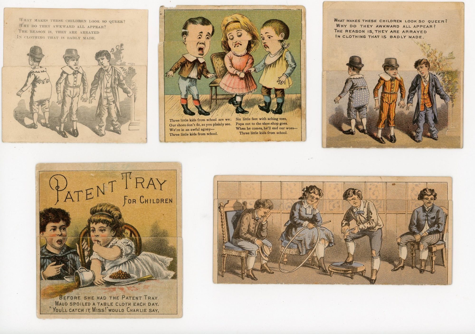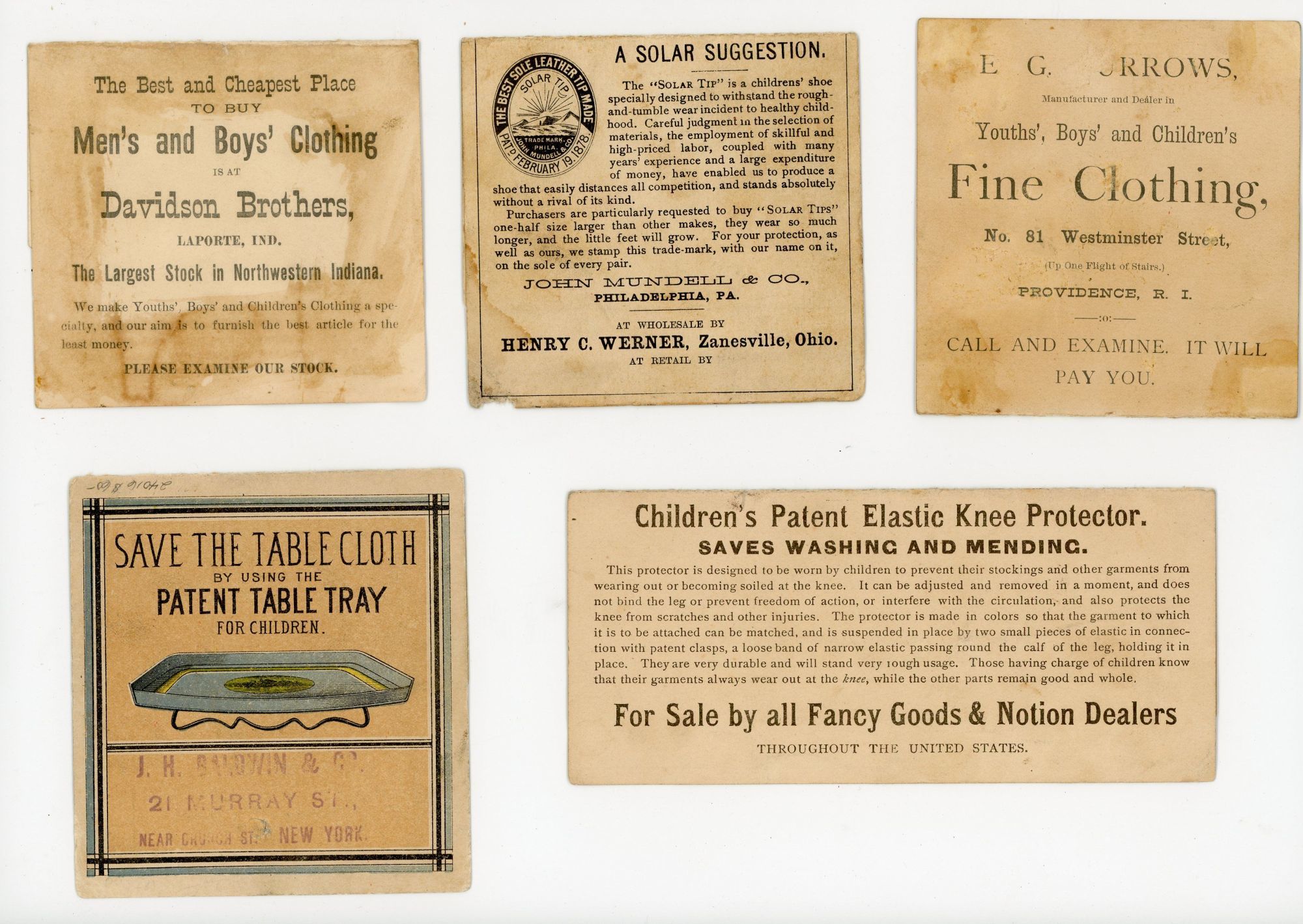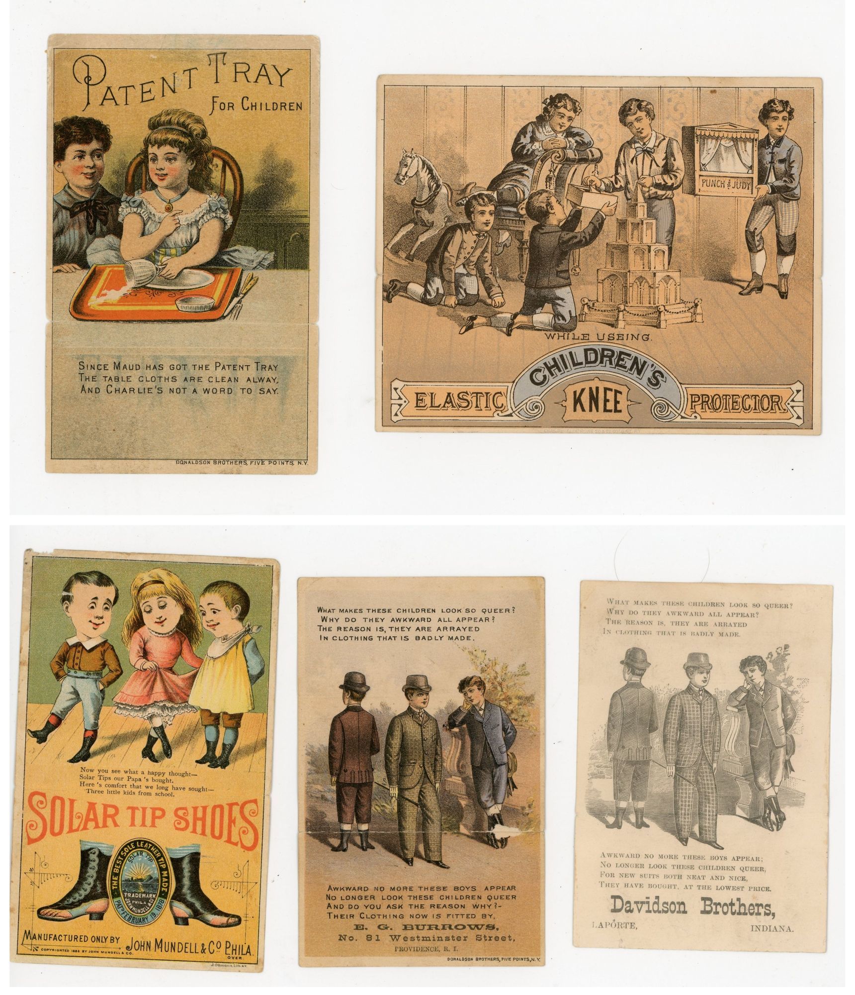 1880. Moderate wear.. A grouping of five (5) metamorphic trade cards that depict before and after views of awkward children turning bright, attractive and well behaved children -- just by using a product. Products include Patent Tray for Children, Children's Patent Elastic Knee Protector, Solar Shoes, Davidson Brothers (Mens and Boys Clothing) and E. G. Burrows (Youths, Boys and Children's Fine Clothing). Each measures 3" x 5" when open flat.