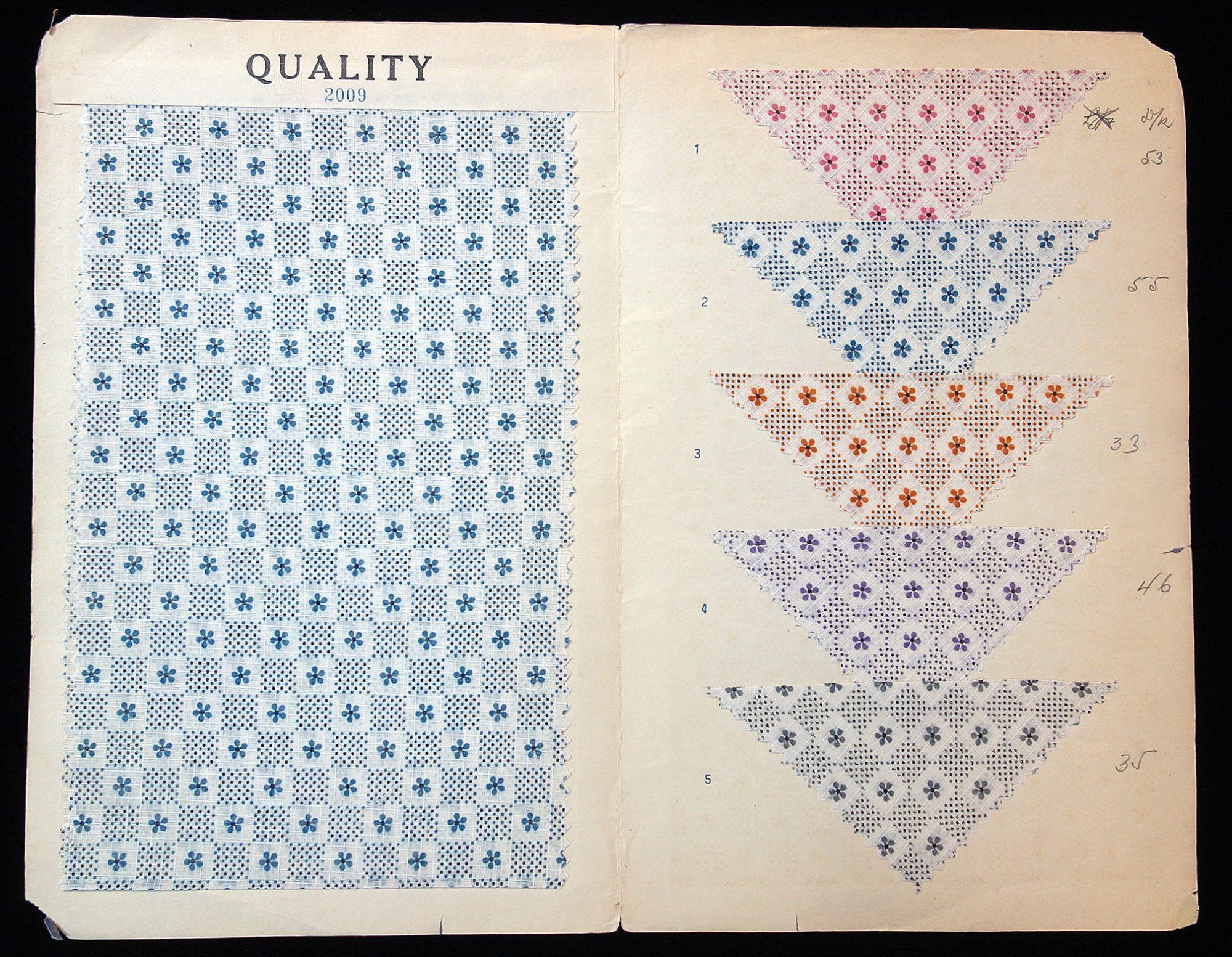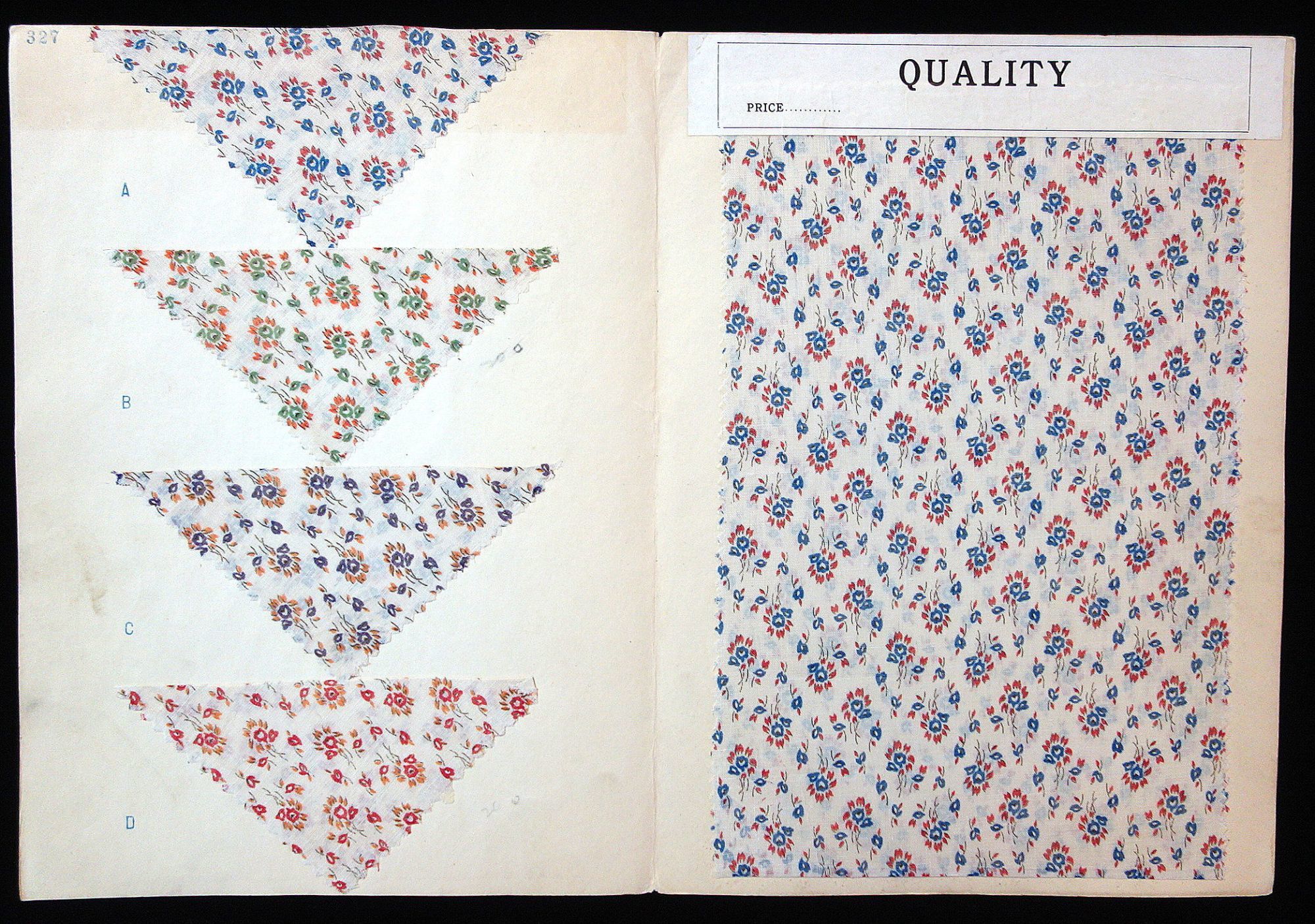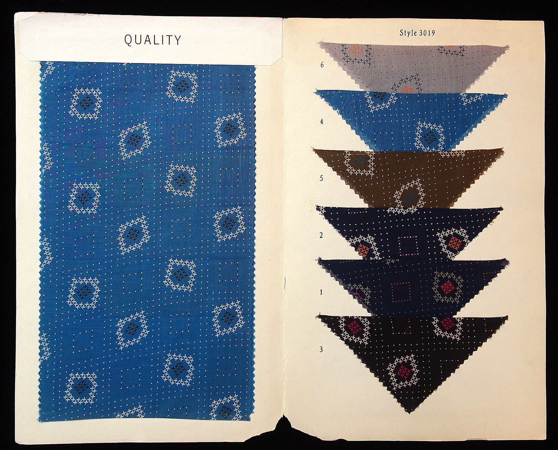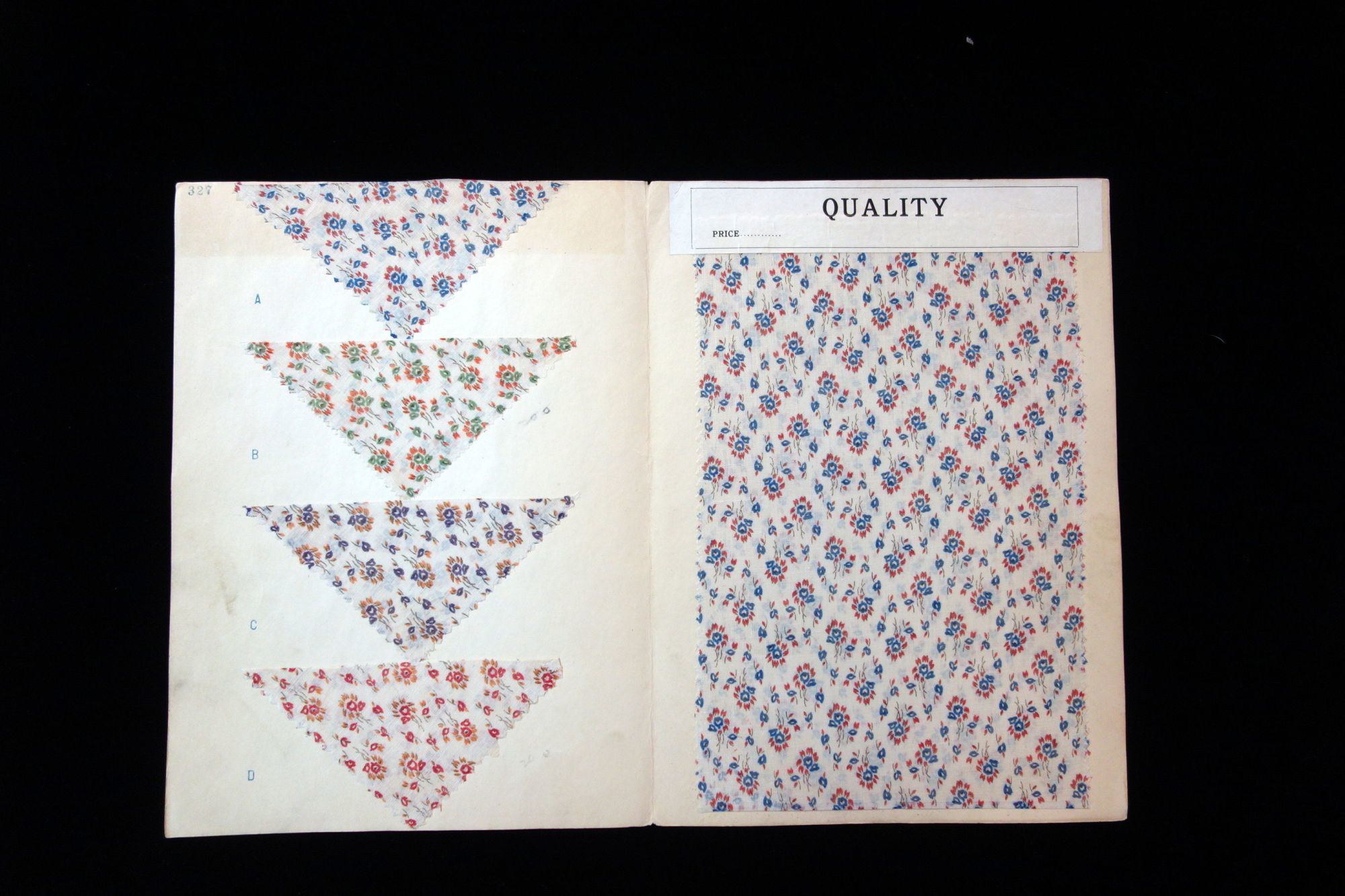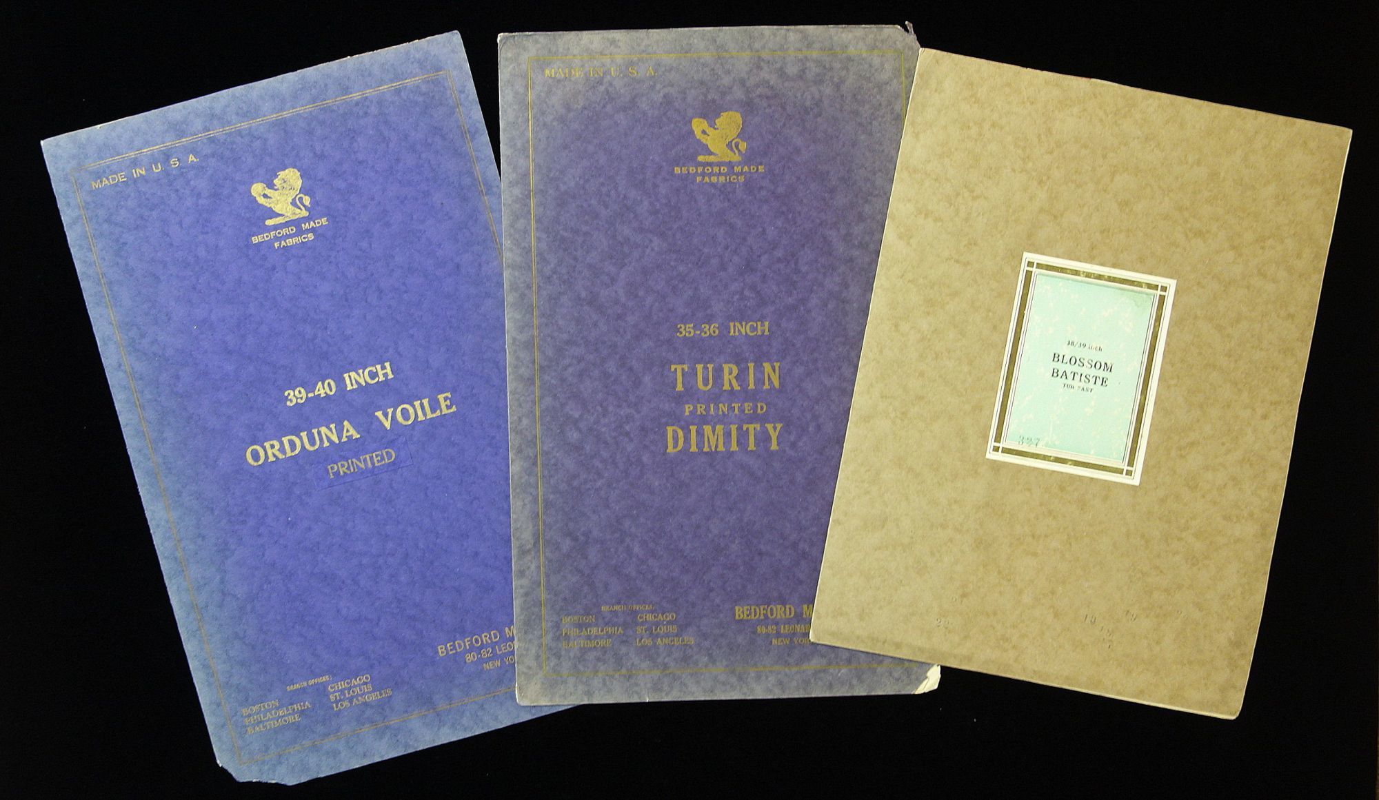 New York: Bedford Mills, 1920. 3 single-fold cards with fabric swatches or sampled of various types of fine weave cotton. The larger two are from Bedford Mills and include 35-36 Inch Turin printed Dimity (2009) and 34-40 Inch Orduna Viole Printed (3019), each with a 12" x 7 1/2" sample and five smaller triangles of the fabric in various colors. The third is from an unidentified company and is 38-39 inch Blossom Batiste Tub Fast (327) with a slightly smaller rectangular smaple and 4 triangles in various colors. The larger measure 13 3/4" x 8 1/2" Fading and corner chips on Bedford covers.