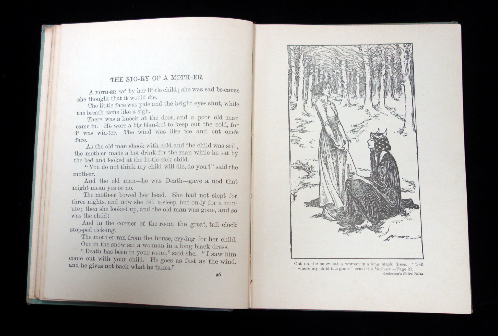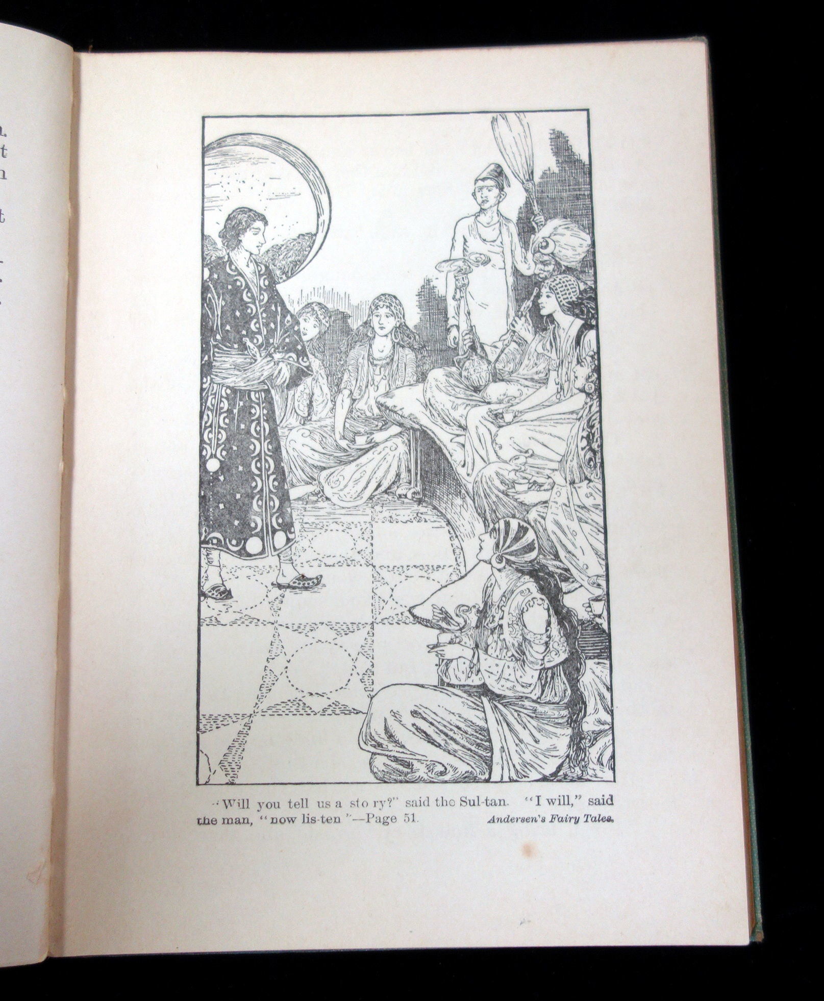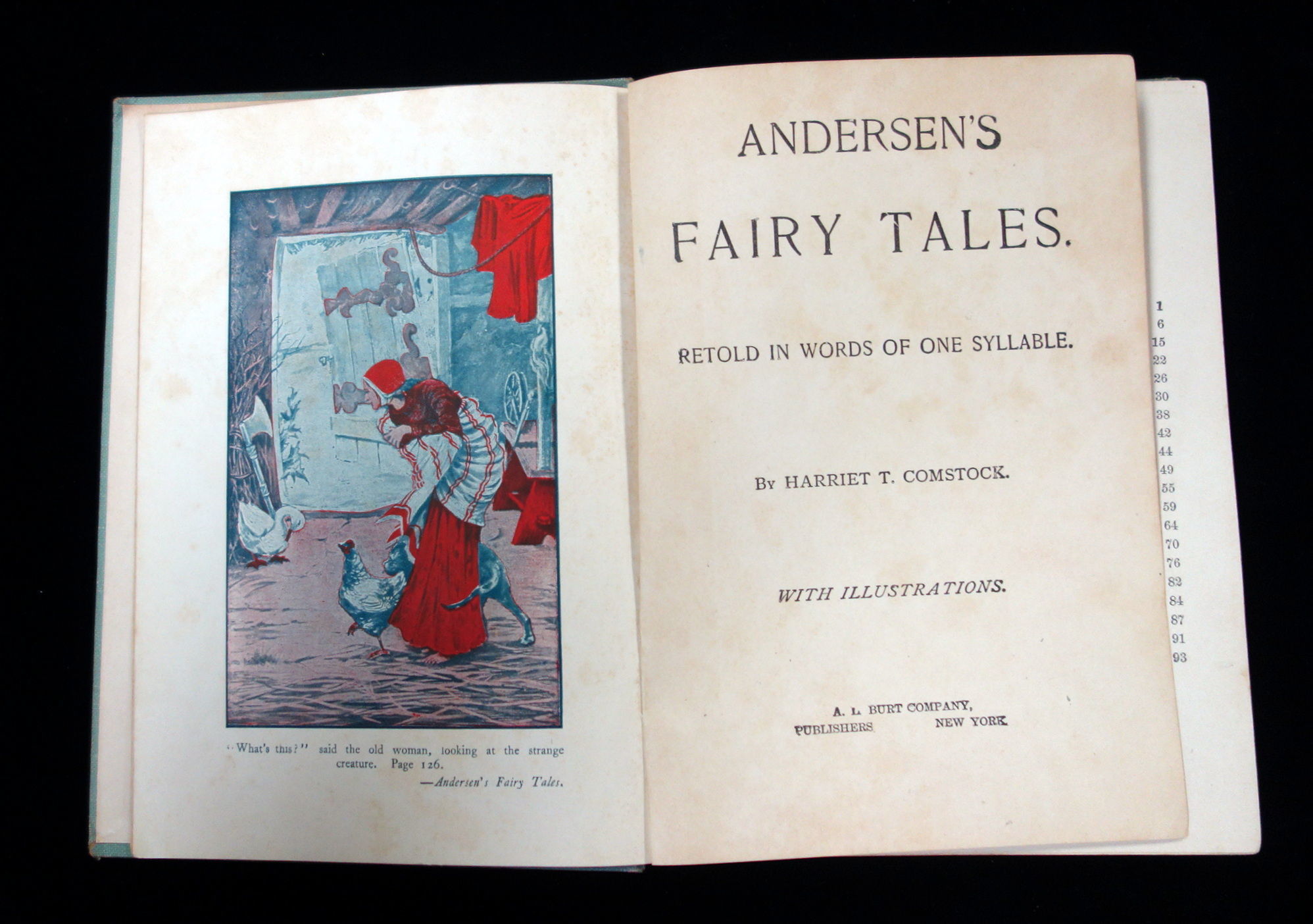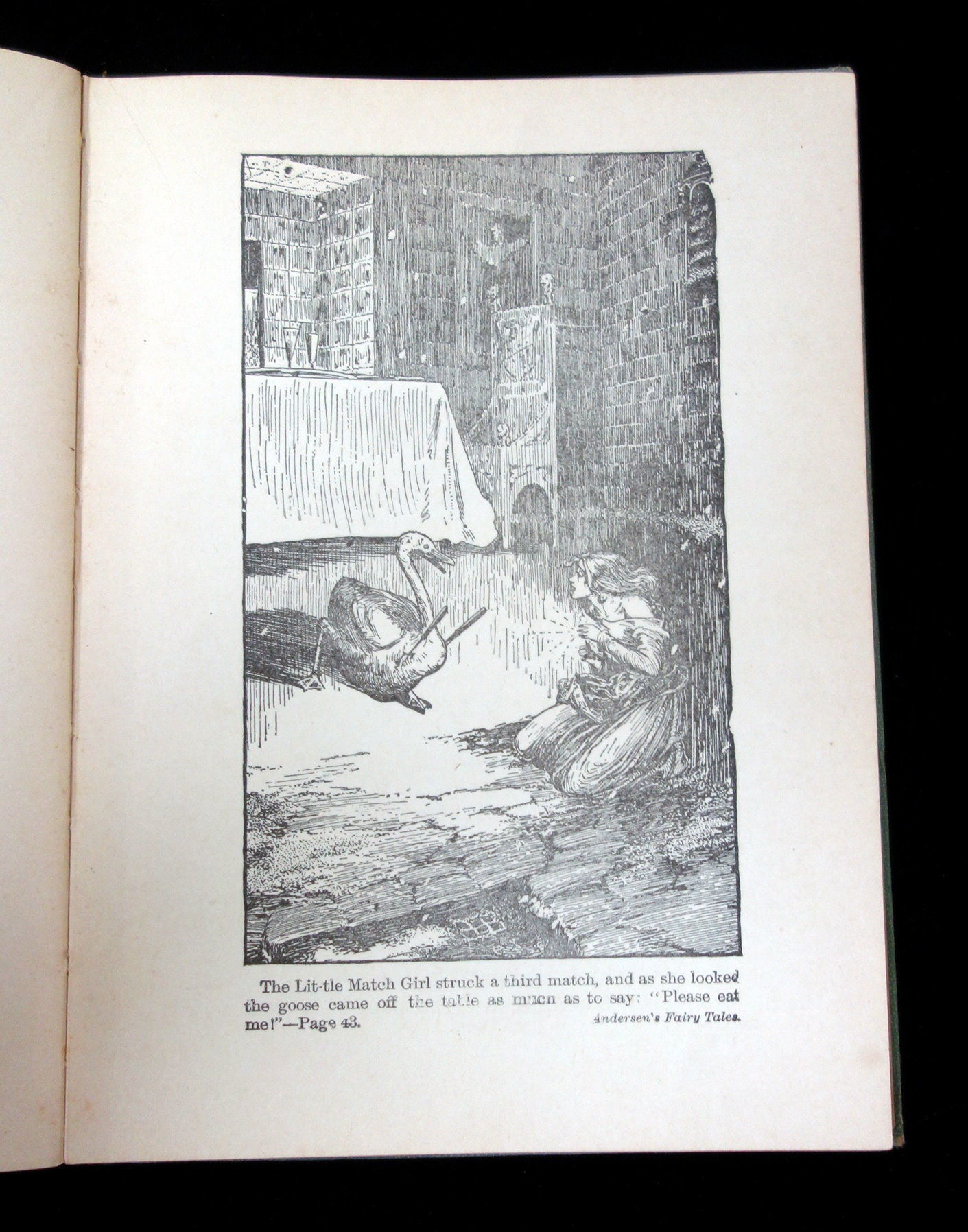 New York: A L Burt Company, 1900. 97 pp. green cloth covers with a stamped illustration of man and cat standing in front of door. A retelling of some of Hans Christian Andersen classic fairy tales, such as 'The Fir-Tree' and 'The Little Match Girl'. Illustrated with numerous black and white as well as color plates.