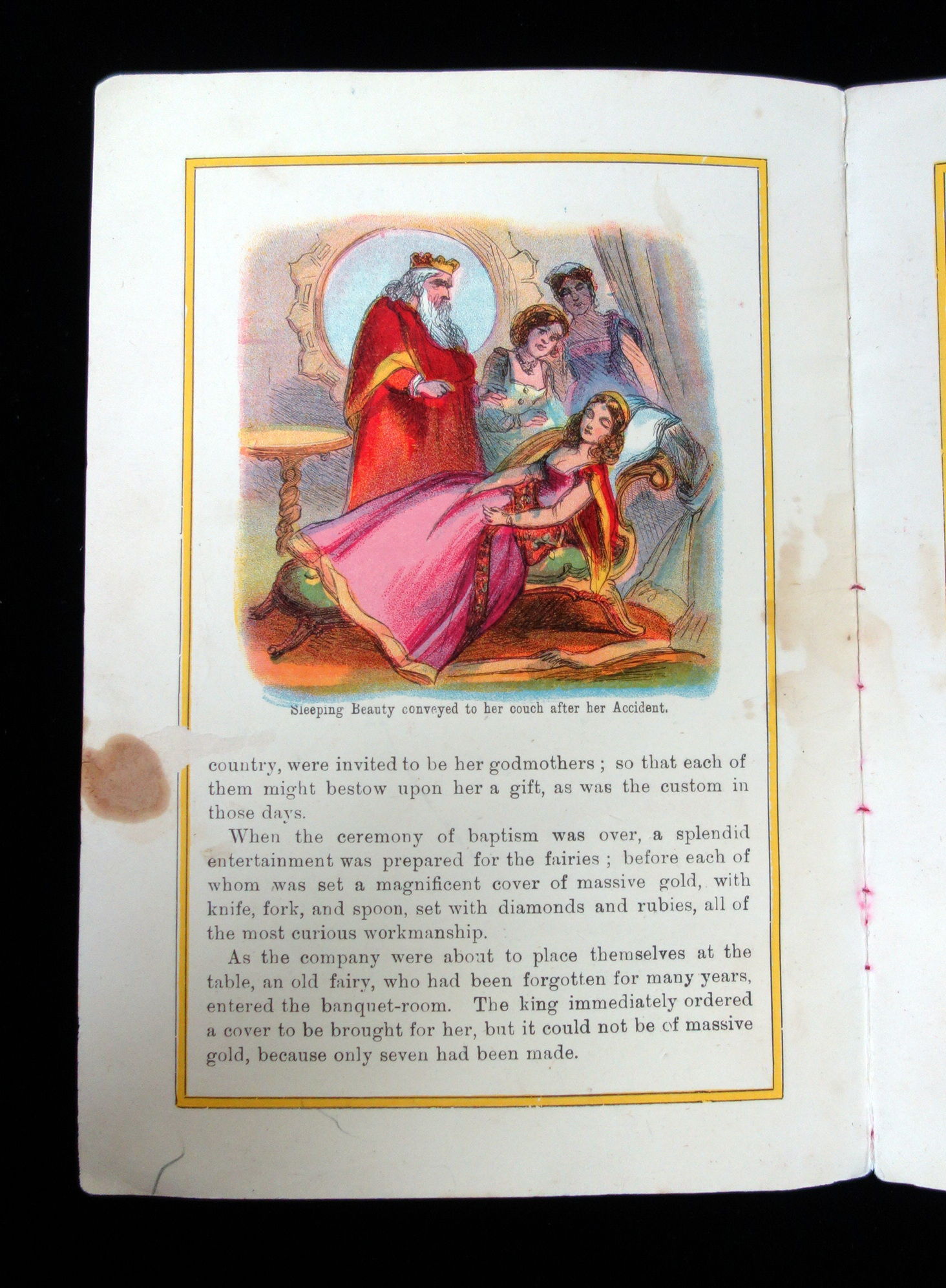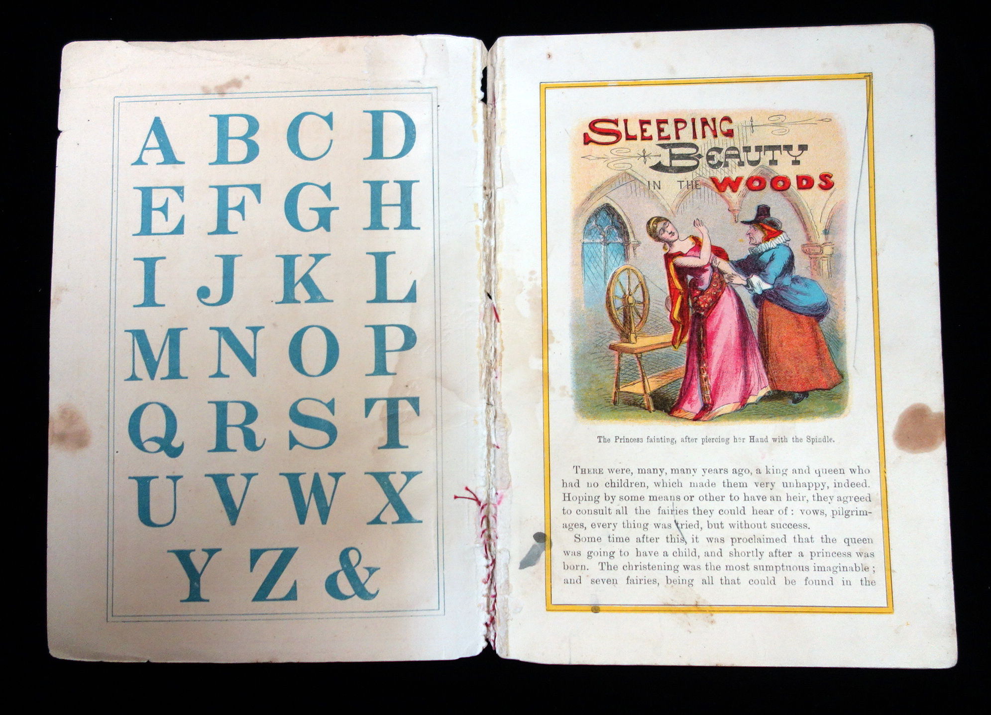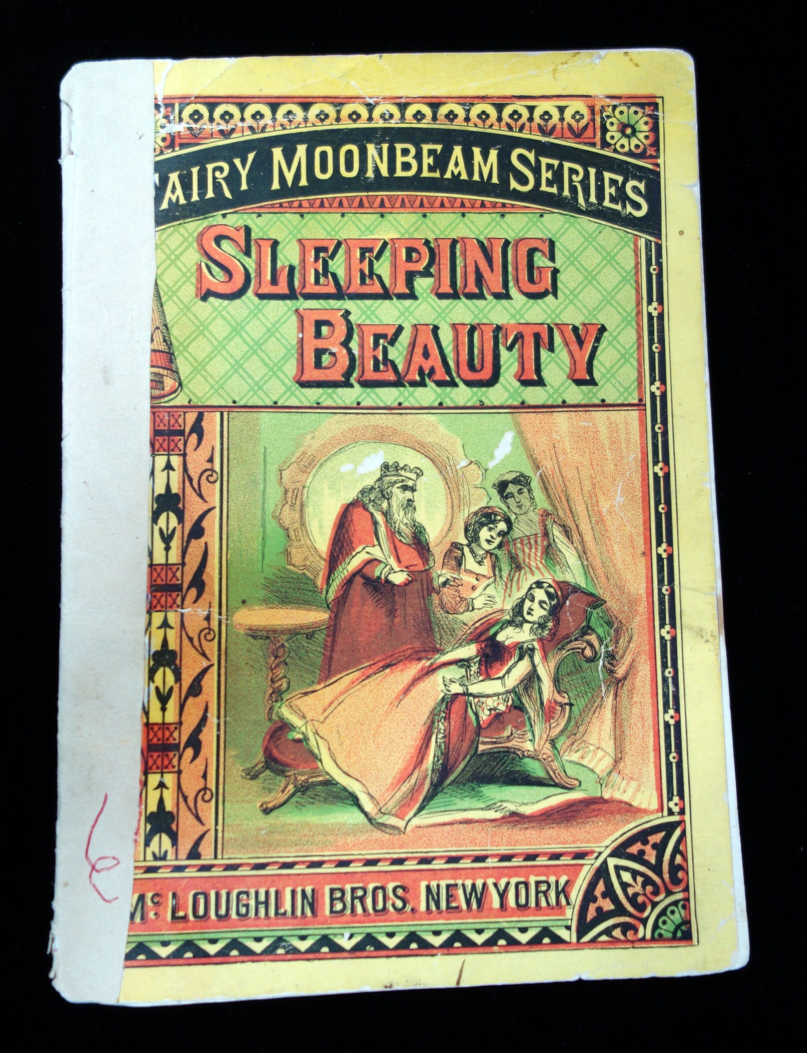 New York: McLoughin Brothers, c1870. Edge wear. Missing surface litho on front cover. Tape repair on binding. Sewing repair with red string, the dye in the string has caused some minor staining. There is a small circular brown stain that continues through several pages.. 12 pp (including wrappers). The cover depicts the sleeping princess after she is cursed. Cover printed in green, red, and black ink. The title page of the book has the full title as 'Sleeping Beauty in the Woods'. The alphabet is printed on the front and back interior covers. There are six color illustrations in the book. On one illustration, the name of the engraver, Jackson, is featured. A part of the Fairy Moonbeam's Series, which are "little fairy stories that have been household joys for generations."Measures 71/2" x 5 1/4"