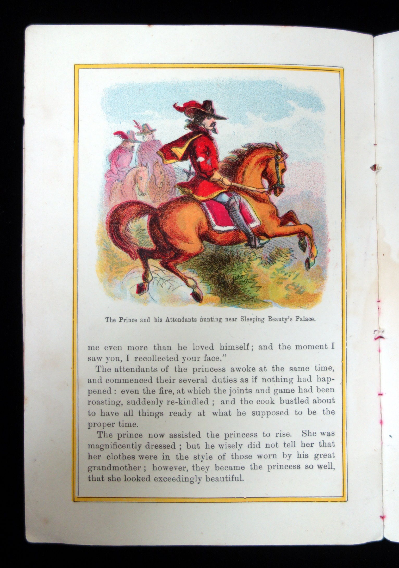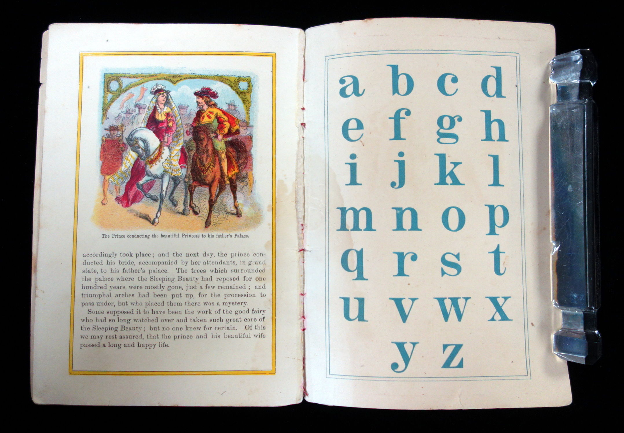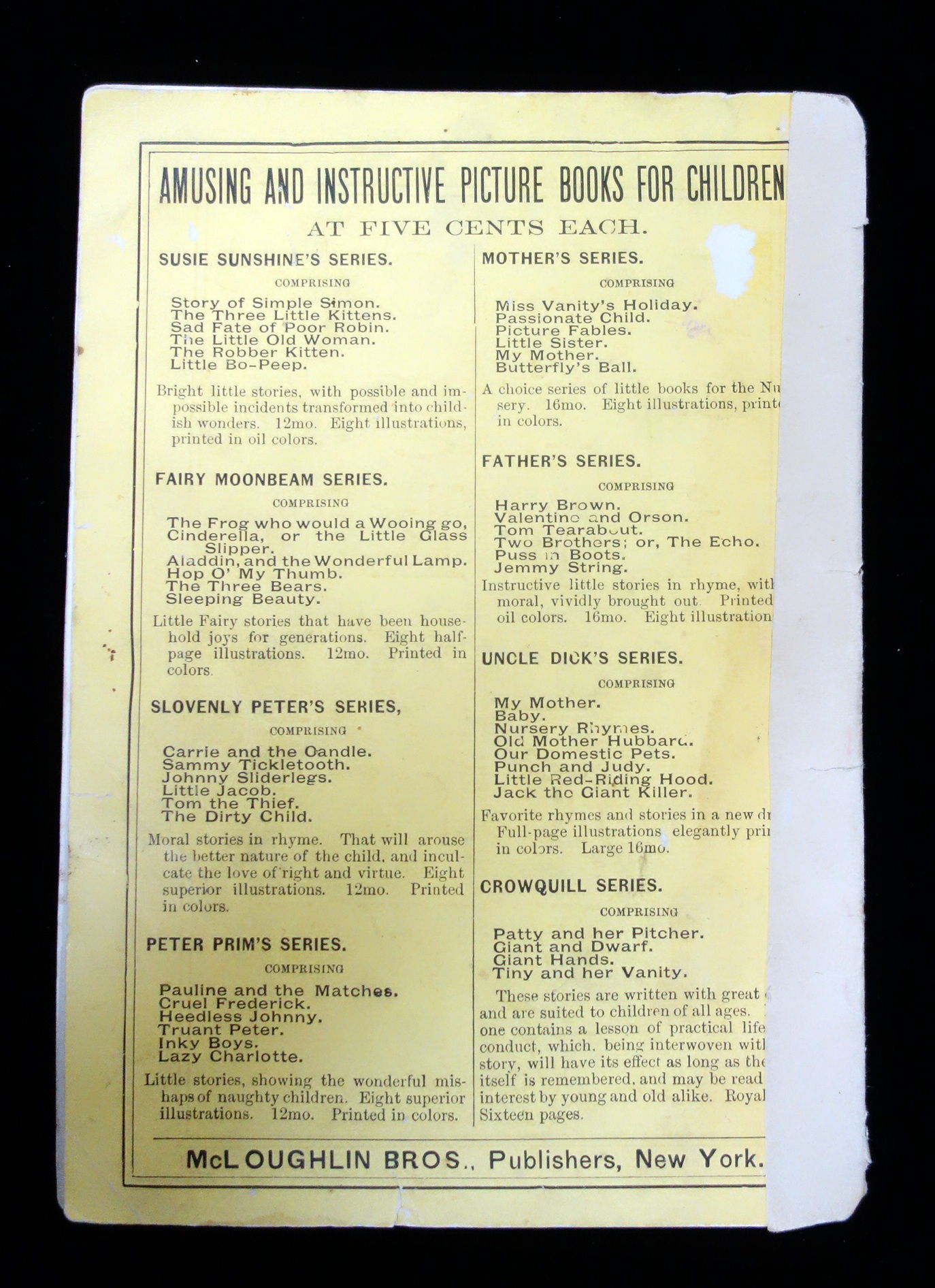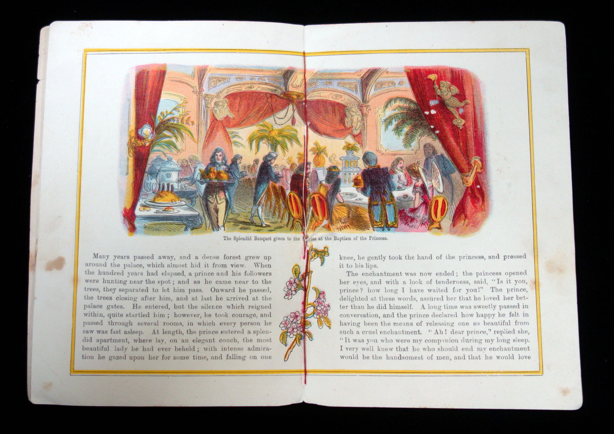 New York: McLoughin Brothers, c1870. Edge wear. Missing surface litho on front cover. Tape repair on binding. Sewing repair with red string, the dye in the string has caused some minor staining. There is a small circular brown stain that continues through several pages.. 12 pp (including wrappers). The cover depicts the sleeping princess after she is cursed. Cover printed in green, red, and black ink. The title page of the book has the full title as 'Sleeping Beauty in the Woods'. The alphabet is printed on the front and back interior covers. There are six color illustrations in the book. On one illustration, the name of the engraver, Jackson, is featured. A part of the Fairy Moonbeam's Series, which are "little fairy stories that have been household joys for generations."Measures 71/2" x 5 1/4"