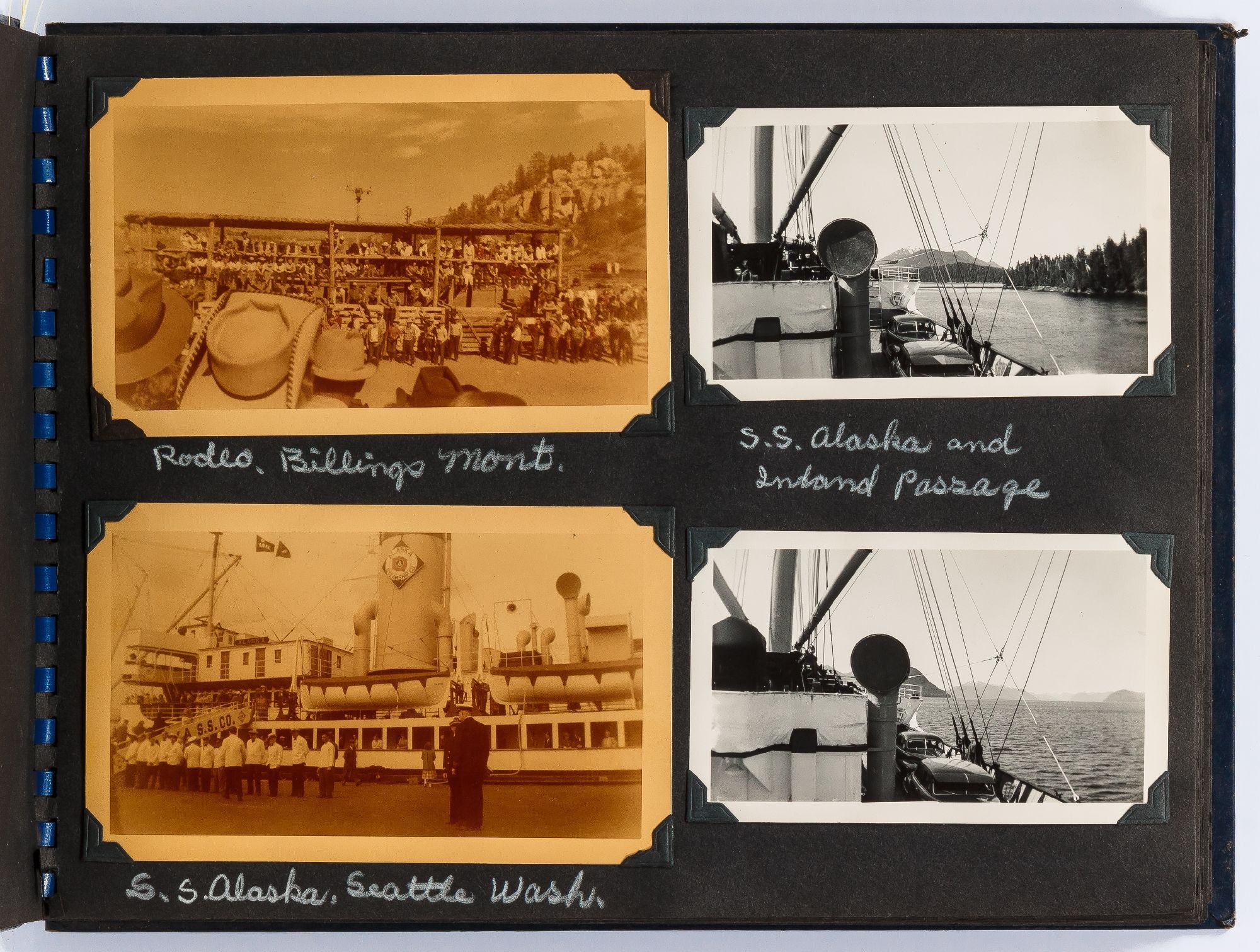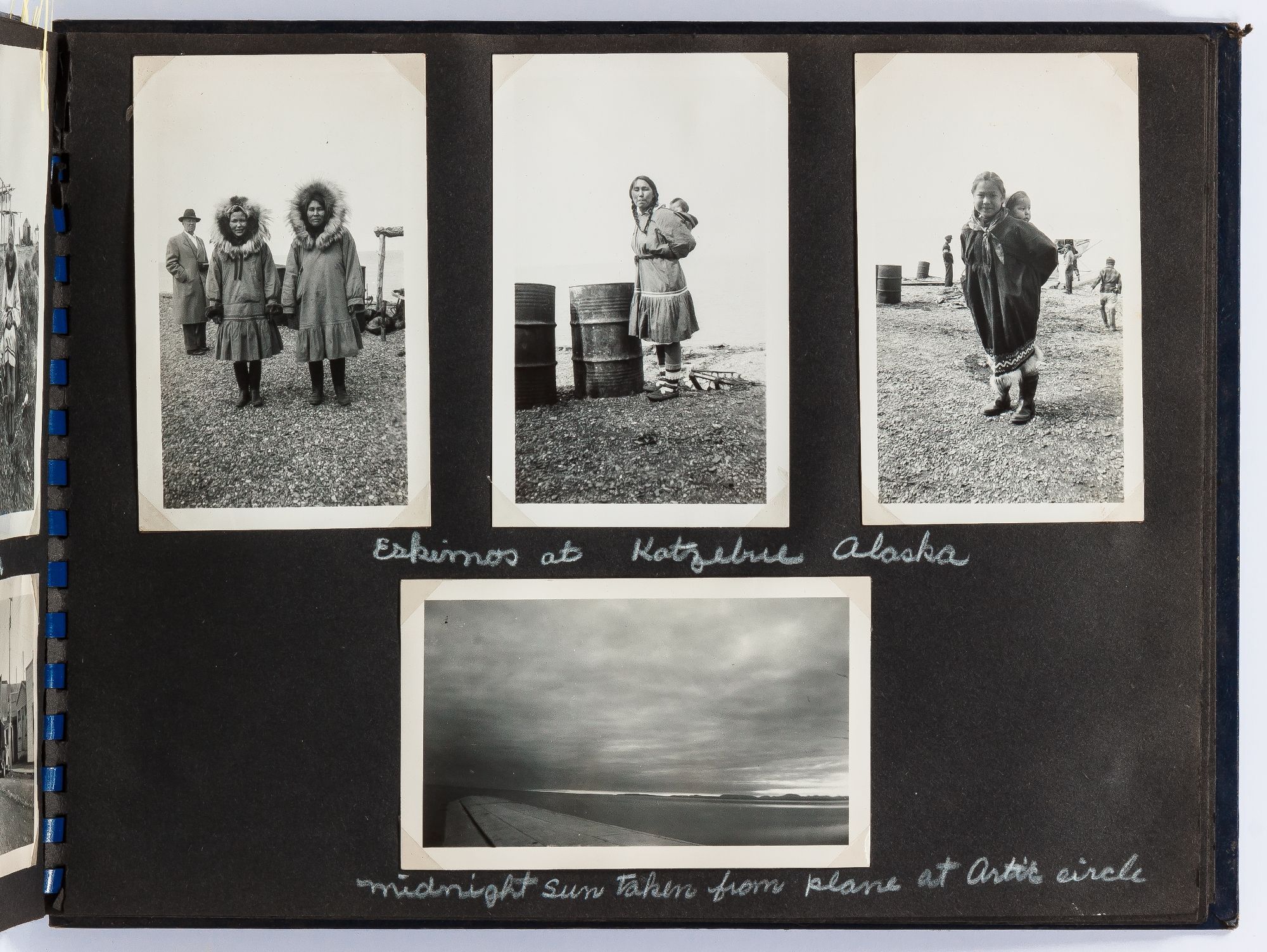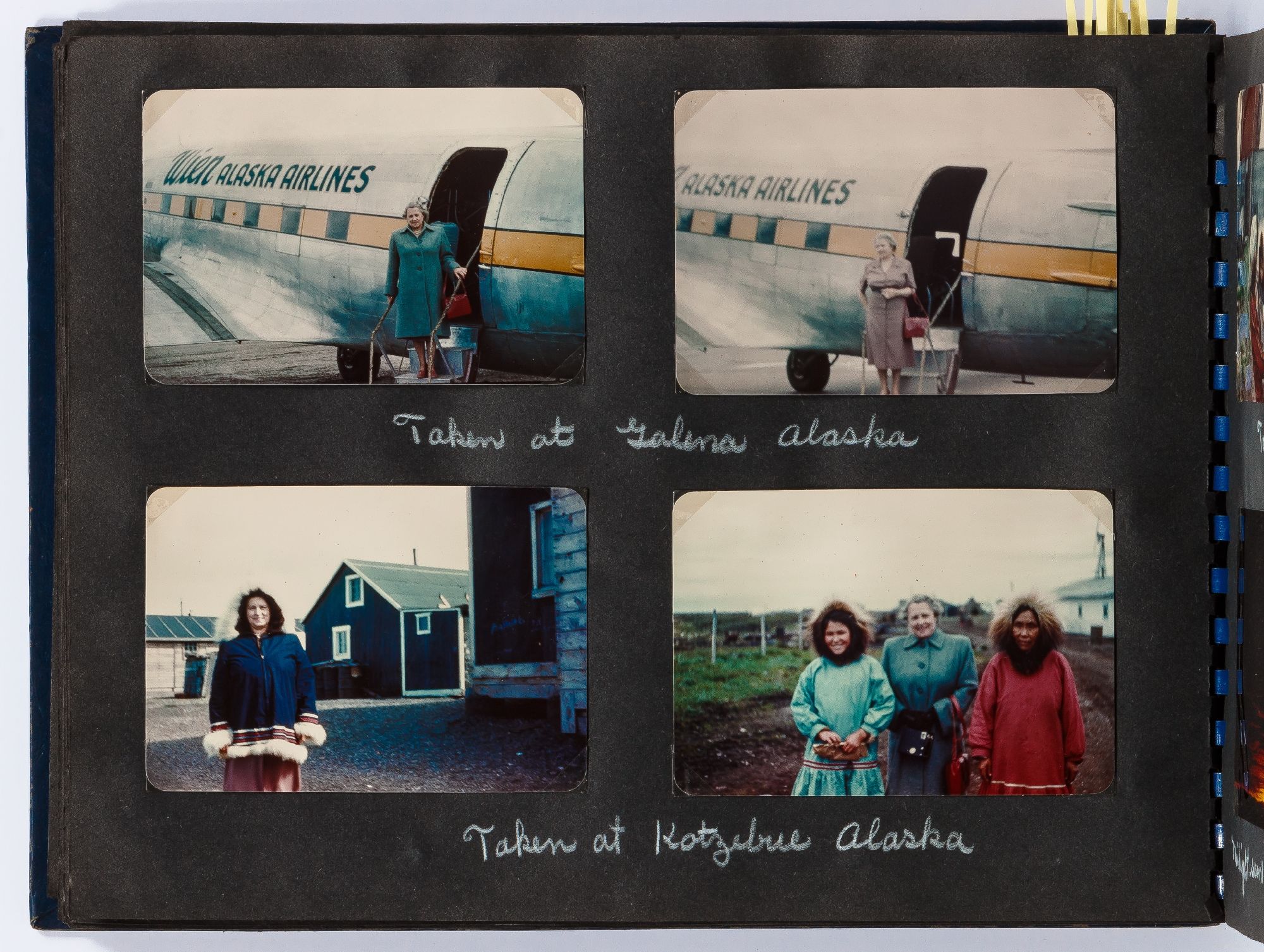 A photo album kept by a couple traveling to Alaska in the 1940s. The trip begins in the Badlands of South Dakota with photos of the landscape and travels. They visited Rapid City, South Dakota and photographed Dinosaur Park and later Deadwood and included images of the town and saloons. Following this they went to Billings, Montana where they watched the rodeo parade through town and later the rodeo itself. After Montana they headed to Seattle where they boarded the S.S. Alaska where they took the Inside Passage route to Alaska. They stopped at Ketchikan and photographed totem poles, gold mines, and fisherman unloaded halibut. After this they made their way to Juneau where they visited Auke Lake and the Mendenhall Glacier. Other sites include Mt. McKinley Park, Paxson Lake, and Seward, Alaska. In Kotzebue they photographed "Eskimos" seen here in traditional dress with their families. The end of the album includes color photographs this time they flew using Alaska airlines. These photos show color images of the "Midnight sun taken from plane north of Arctic circle." Other images show the travelers with native Alaskans, who it appears they befriended on their trip as one photo shows a woman holding a small child. They continued on to Canada and photographed Jasper National Park , Lake Louise, and Glacier National Park, among other sites.