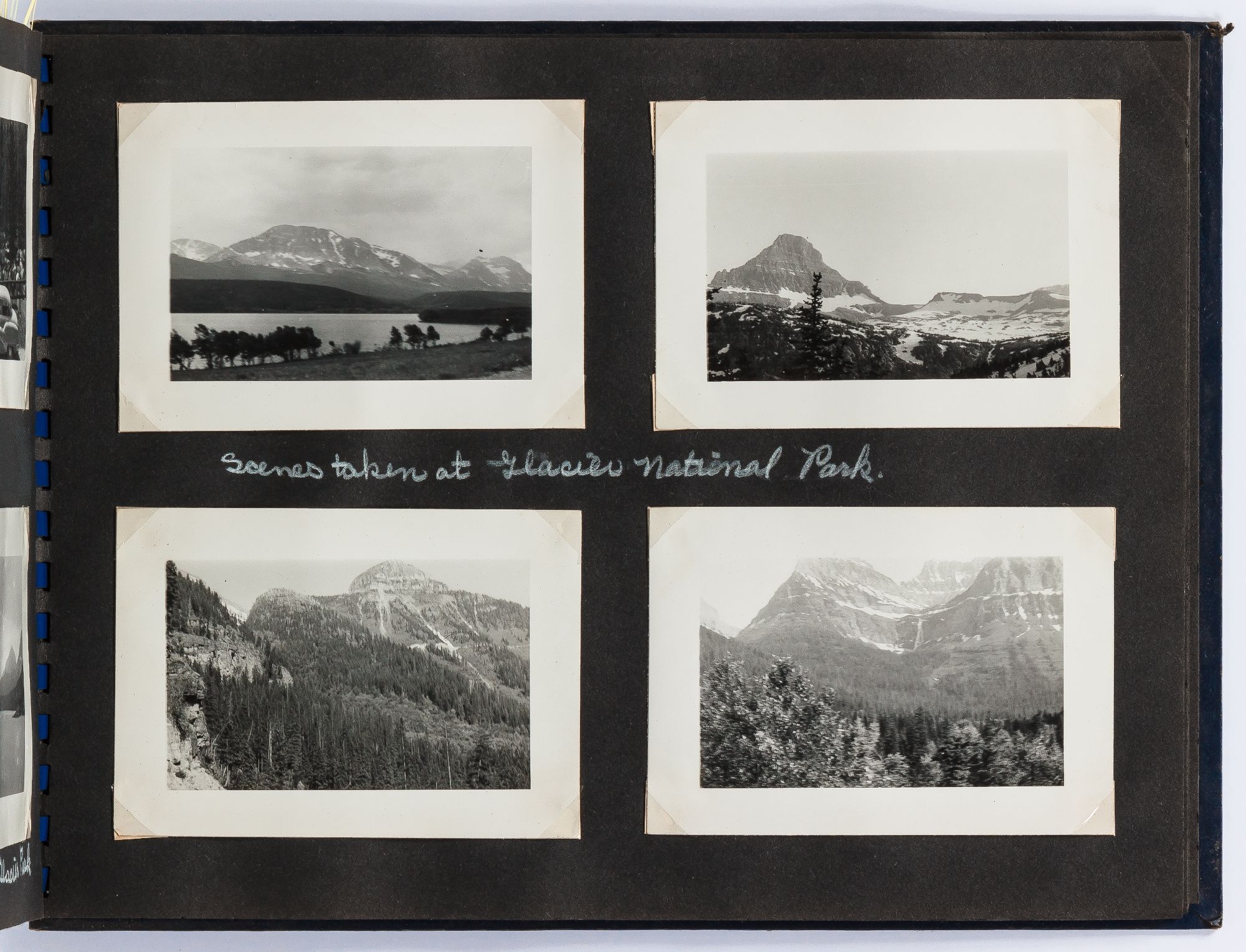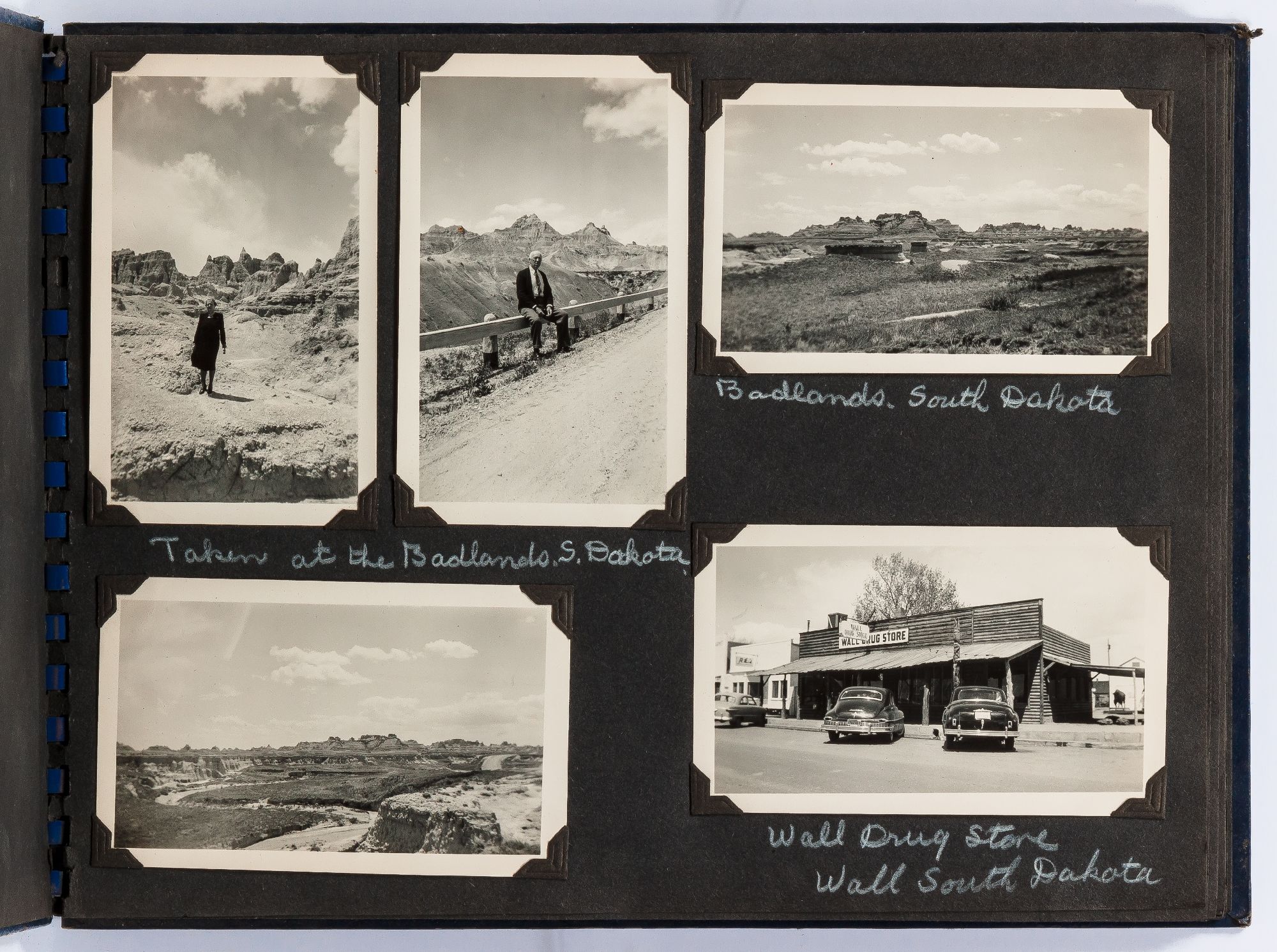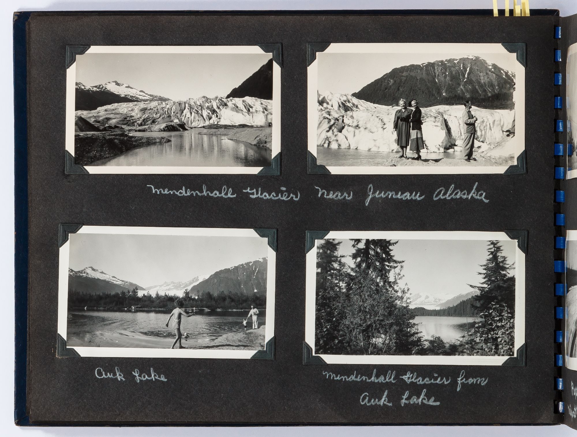 A photo album kept by a couple traveling to Alaska in the 1940s. The trip begins in the Badlands of South Dakota with photos of the landscape and travels. They visited Rapid City, South Dakota and photographed Dinosaur Park and later Deadwood and included images of the town and saloons. Following this they went to Billings, Montana where they watched the rodeo parade through town and later the rodeo itself. After Montana they headed to Seattle where they boarded the S.S. Alaska where they took the Inside Passage route to Alaska. They stopped at Ketchikan and photographed totem poles, gold mines, and fisherman unloaded halibut. After this they made their way to Juneau where they visited Auke Lake and the Mendenhall Glacier. Other sites include Mt. McKinley Park, Paxson Lake, and Seward, Alaska. In Kotzebue they photographed "Eskimos" seen here in traditional dress with their families. The end of the album includes color photographs this time they flew using Alaska airlines. These photos show color images of the "Midnight sun taken from plane north of Arctic circle." Other images show the travelers with native Alaskans, who it appears they befriended on their trip as one photo shows a woman holding a small child. They continued on to Canada and photographed Jasper National Park , Lake Louise, and Glacier National Park, among other sites.