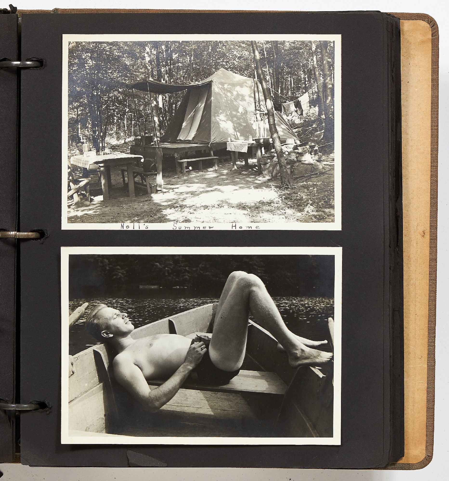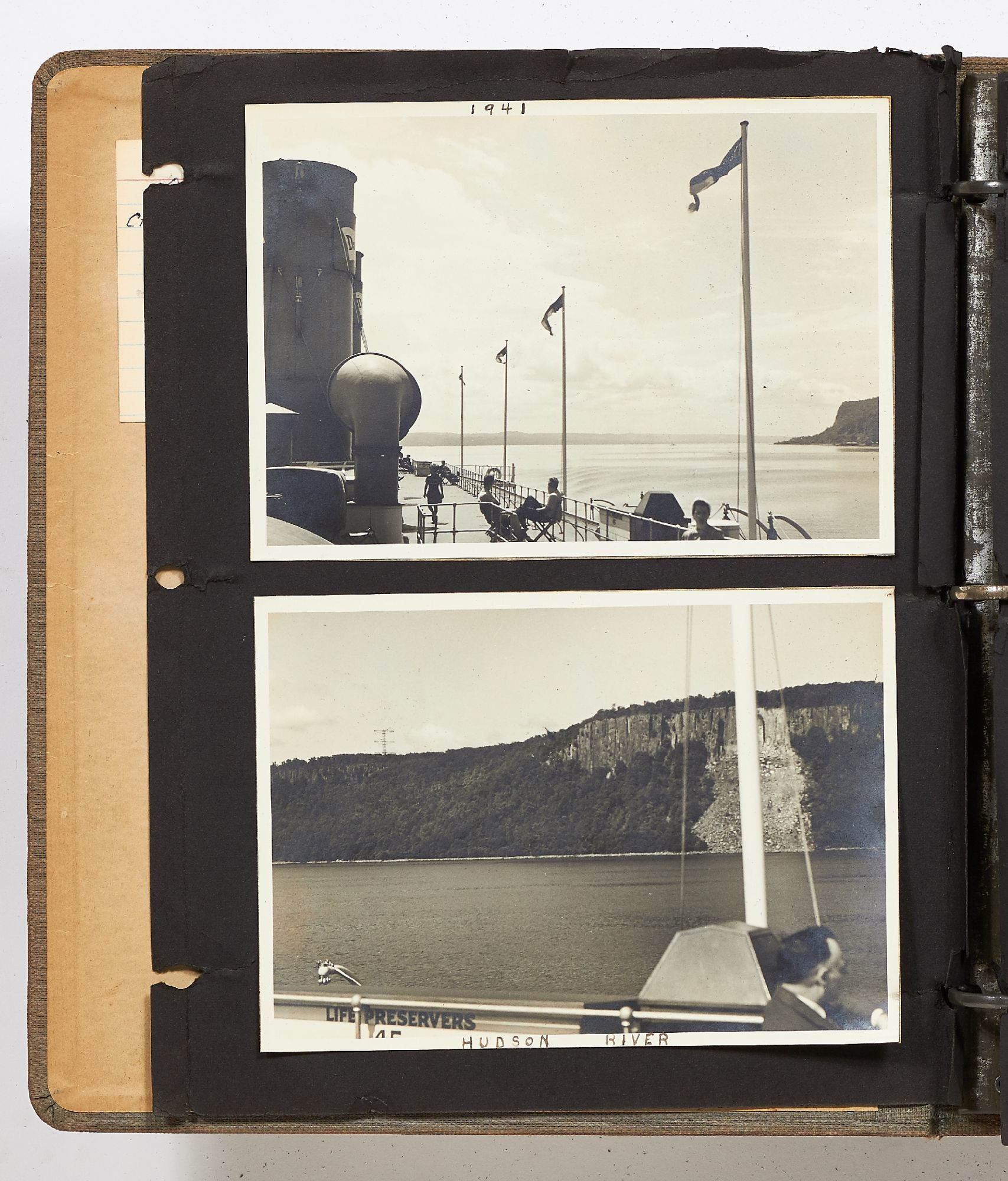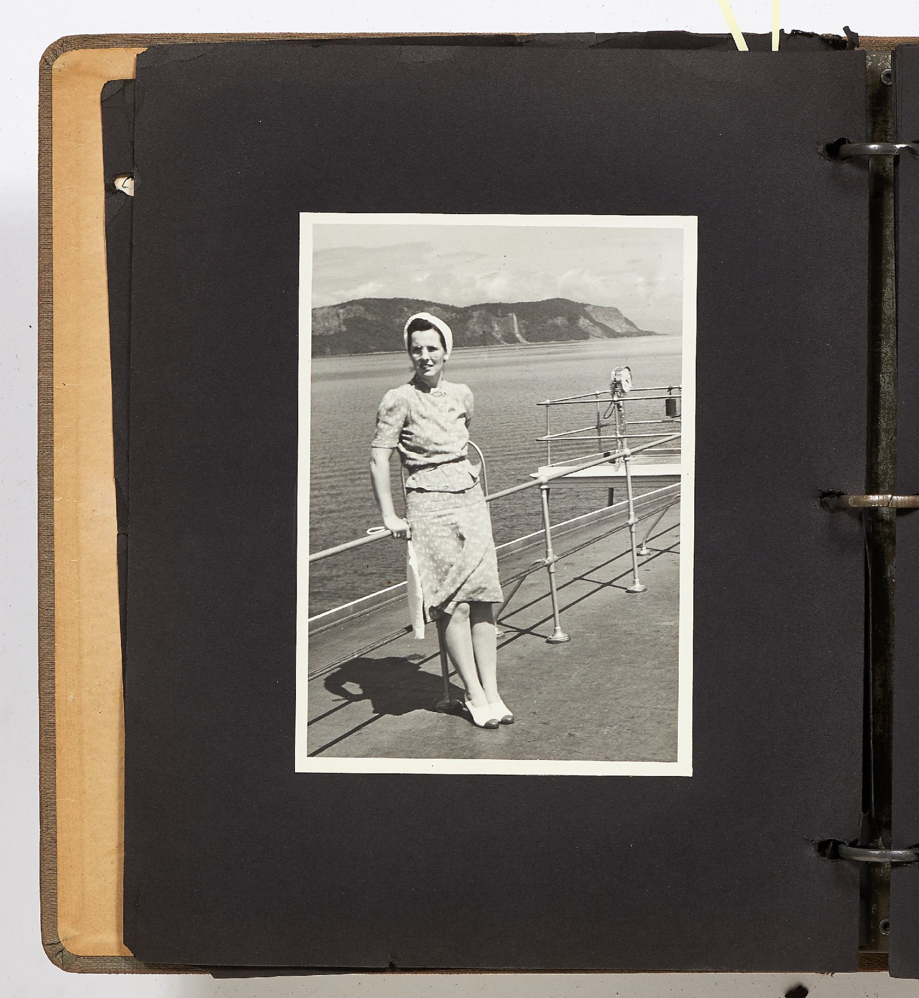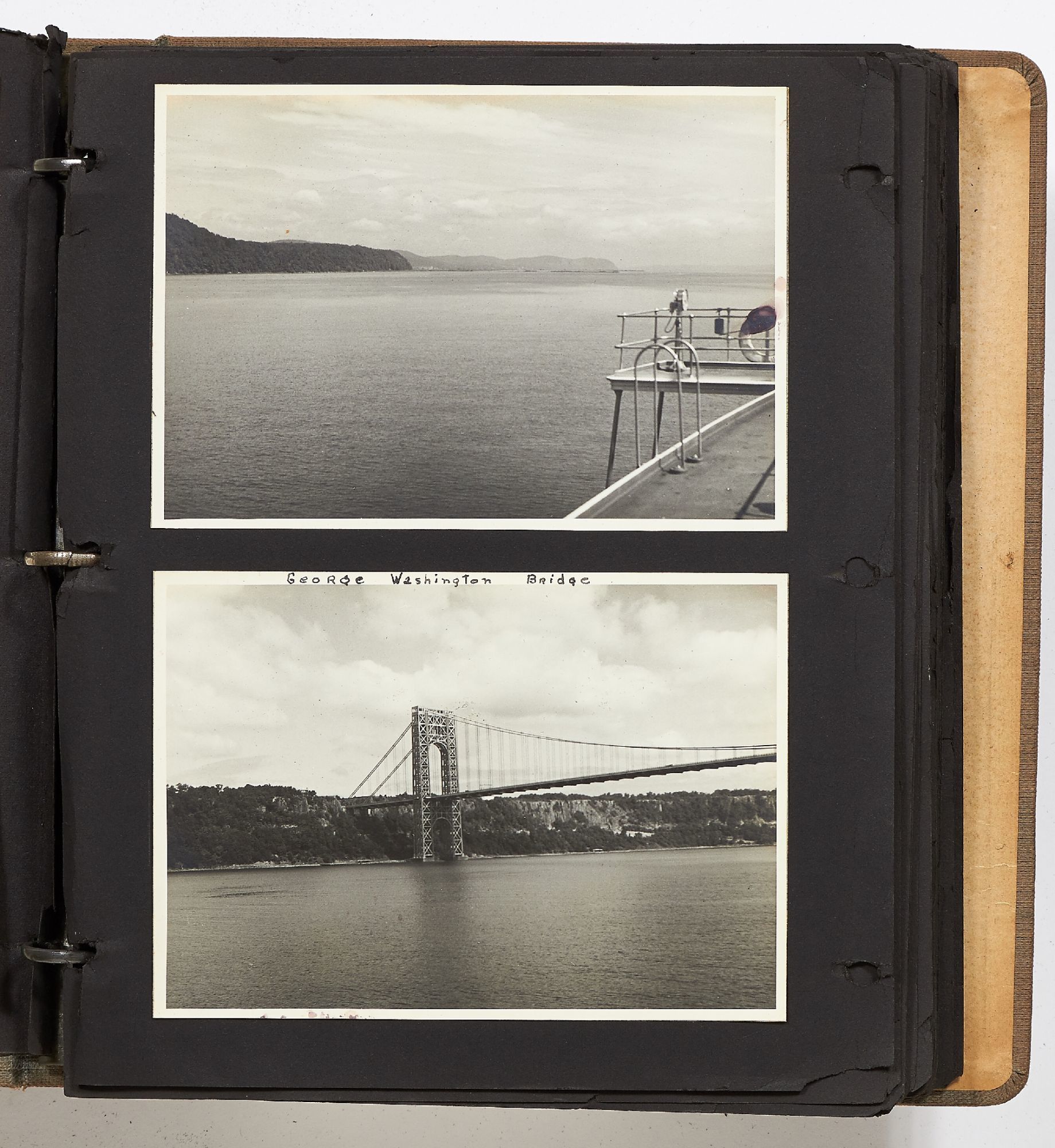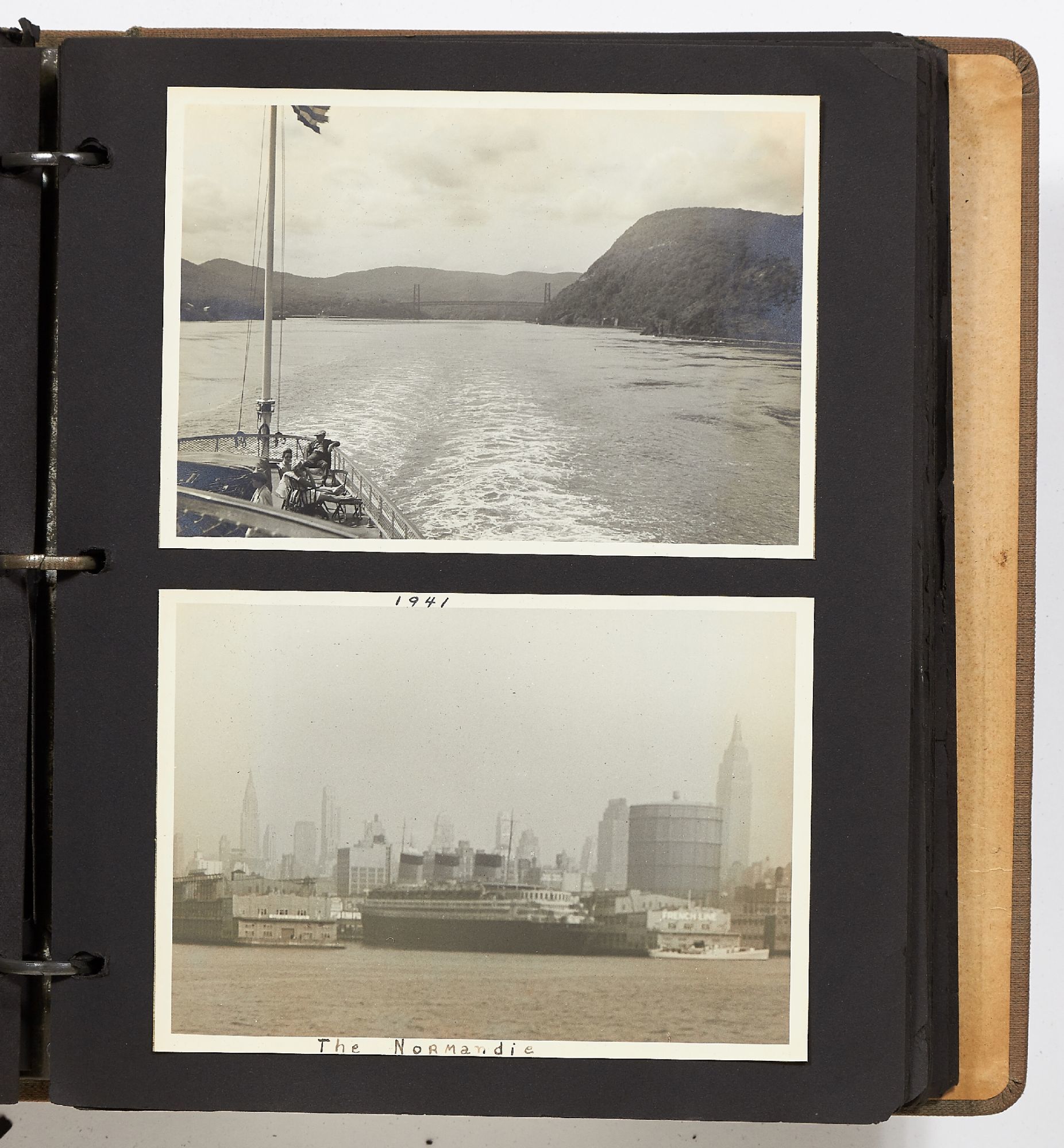 A photo album kept by a New York woman in the early 1940s. The album is filled with amateur photography from someone who was clearly trying to perfect her art. It begins with images of the Hudson River with photos of boats, water sports, and the George Washington Bridge. She also features portraits of travelers on a boat, fashionably dressed men and women in suits and women in turbans. The city of New York is seen in one photo with the ocean liner the S.S. Normandie in the foreground. Following this they attend a clam bake at Indian Head Club with photos of the beach, people in a row boat, and the crowd of the club leisurely hanging around the beach. A well-composed photo of a napping boater is seen here and "Noll's Summer Home" which is an elaborate tent. Other photos show landscape viewed on trips, wild animals, and animals at the zoo. One section of photos includes portrait style images of women in fancy dress, one of which is smoking a cigarette and looking very Hollywood starlet. One particularly beautiful photo shows a winter night on a street lit by a street lamp.