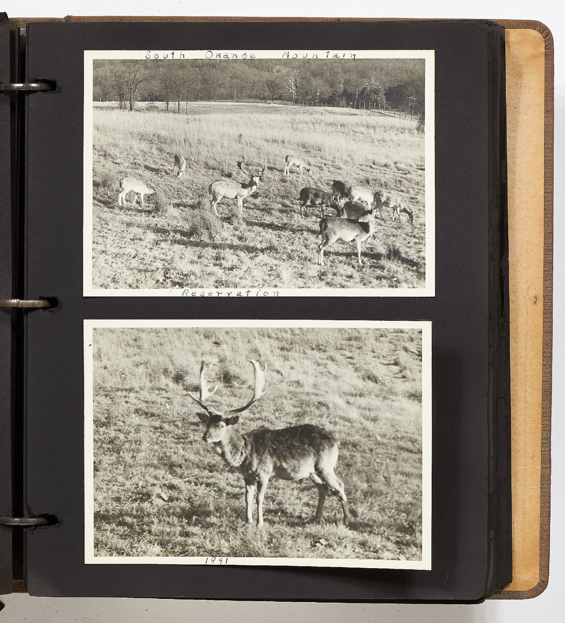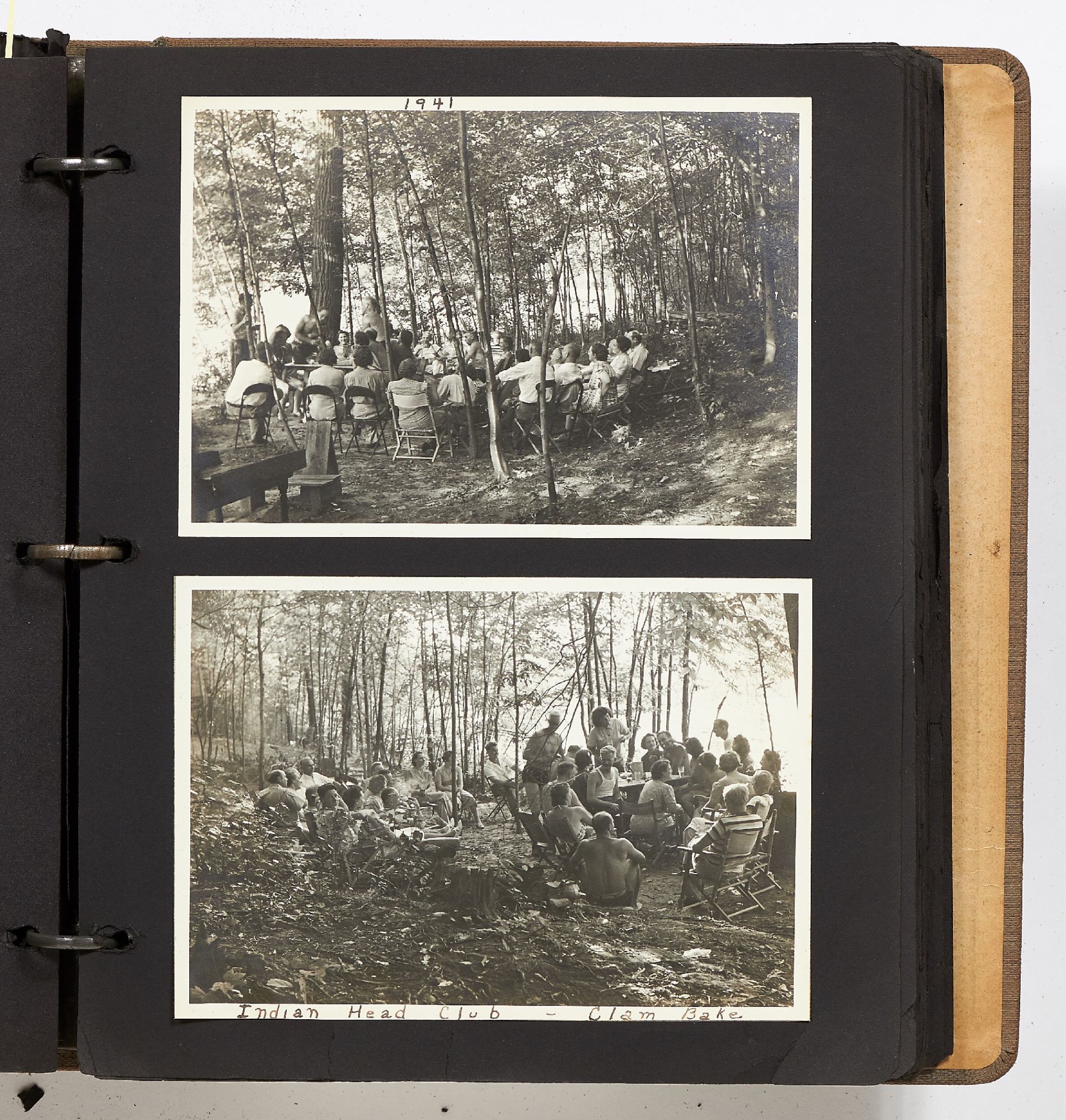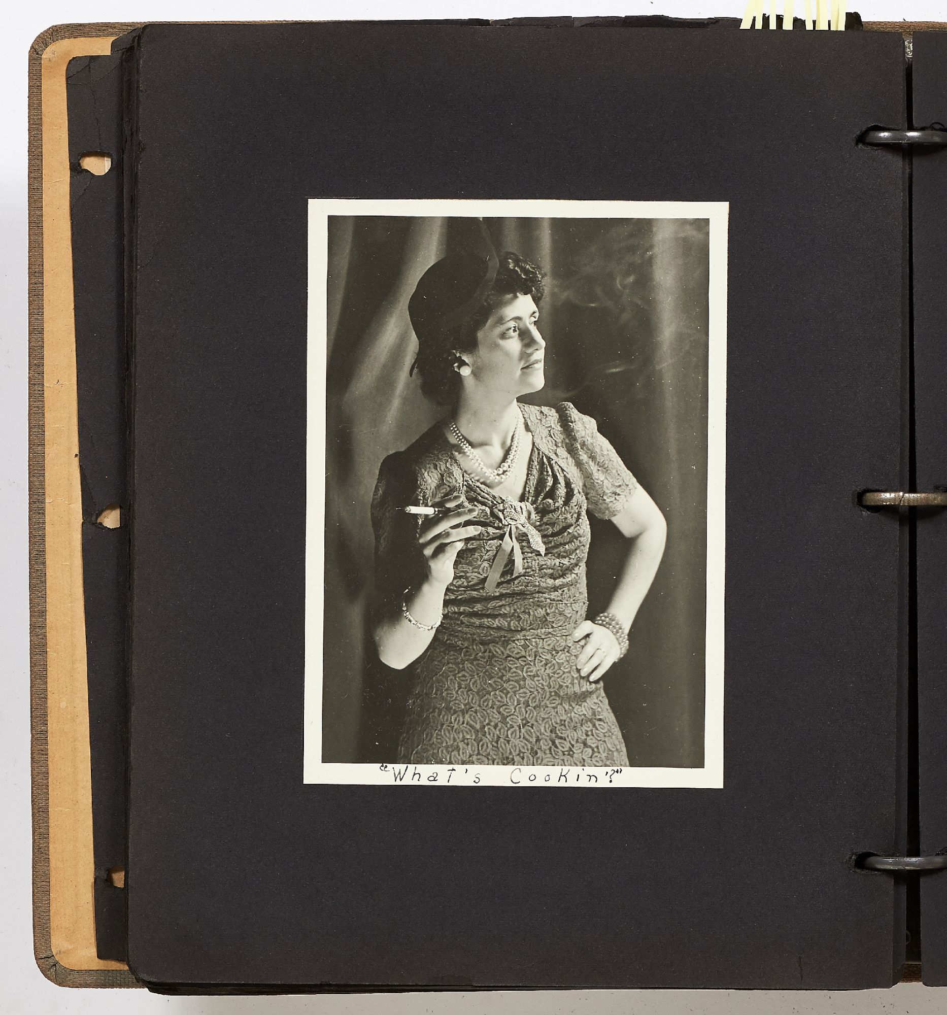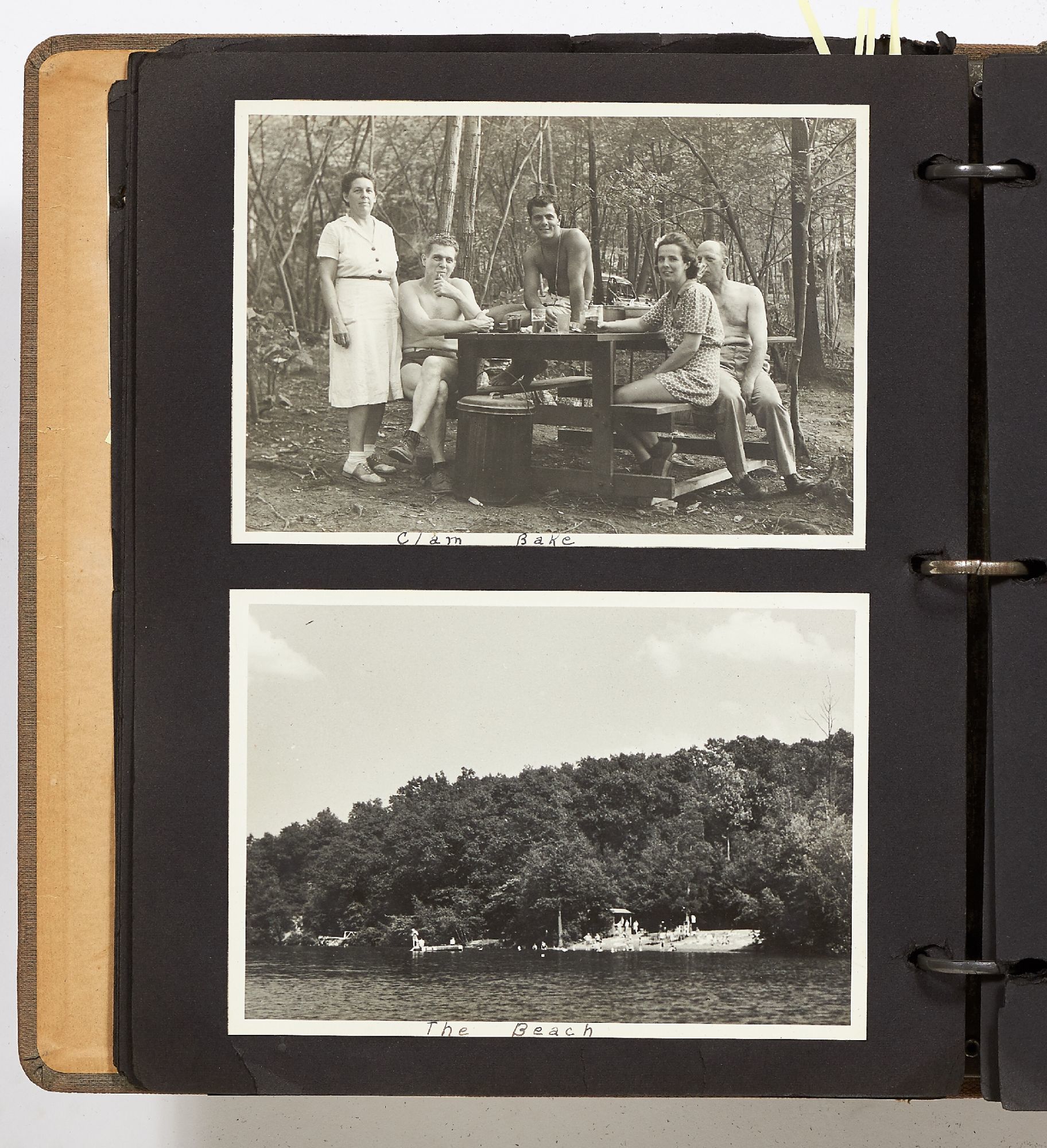 A photo album kept by a New York woman in the early 1940s. The album is filled with amateur photography from someone who was clearly trying to perfect her art. It begins with images of the Hudson River with photos of boats, water sports, and the George Washington Bridge. She also features portraits of travelers on a boat, fashionably dressed men and women in suits and women in turbans. The city of New York is seen in one photo with the ocean liner the S.S. Normandie in the foreground. Following this they attend a clam bake at Indian Head Club with photos of the beach, people in a row boat, and the crowd of the club leisurely hanging around the beach. A well-composed photo of a napping boater is seen here and "Noll's Summer Home" which is an elaborate tent. Other photos show landscape viewed on trips, wild animals, and animals at the zoo. One section of photos includes portrait style images of women in fancy dress, one of which is smoking a cigarette and looking very Hollywood starlet. One particularly beautiful photo shows a winter night on a street lit by a street lamp.