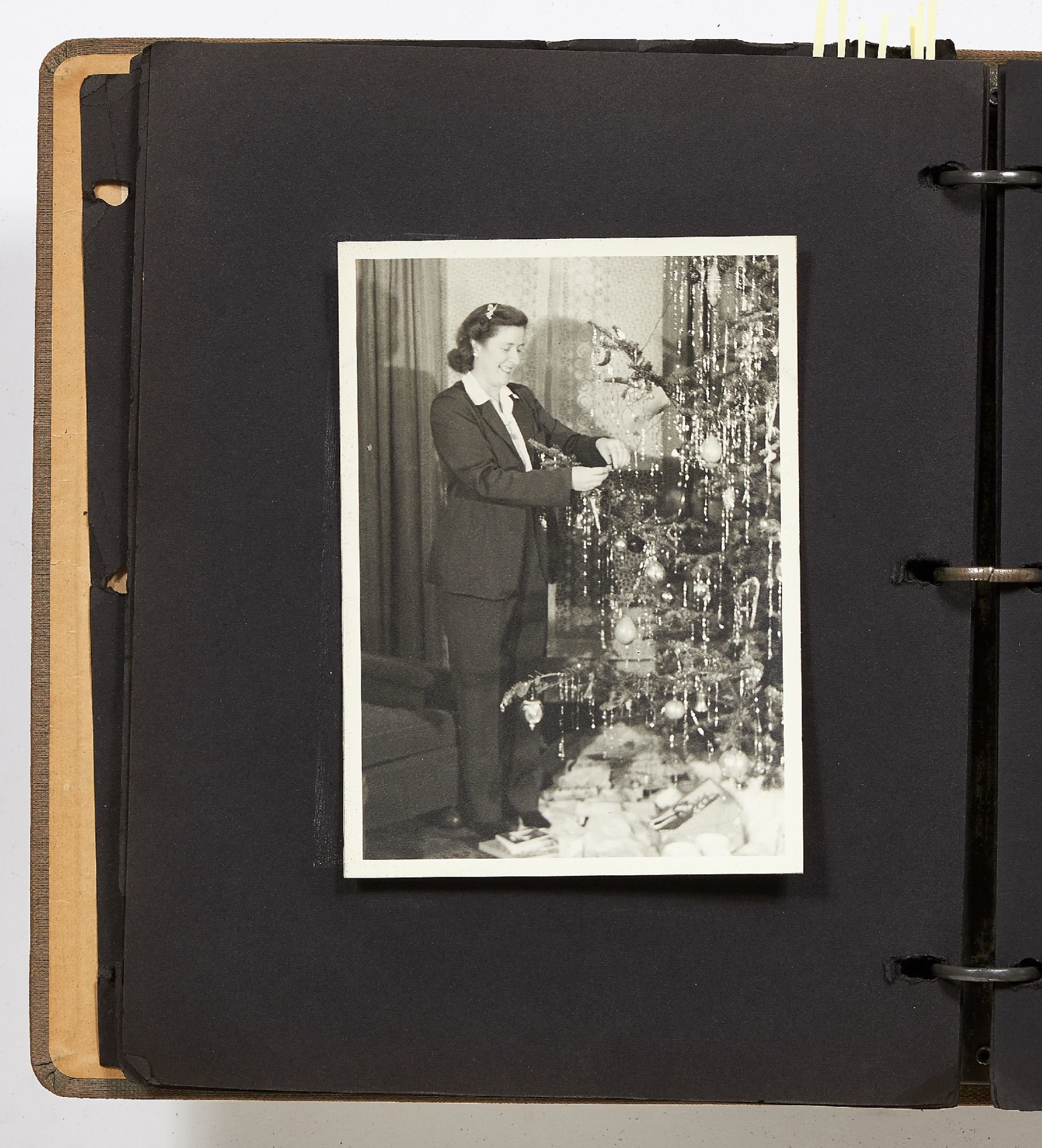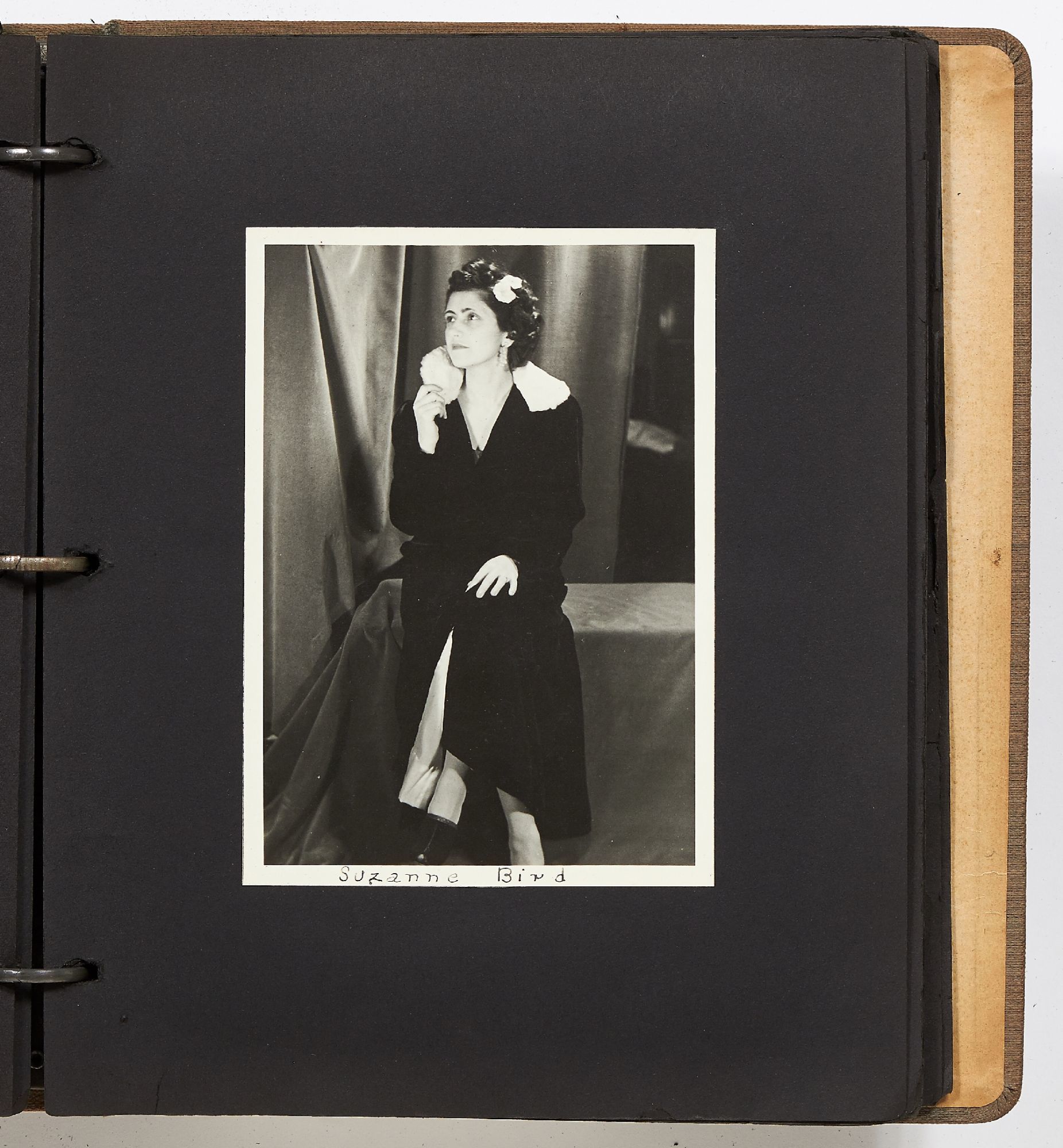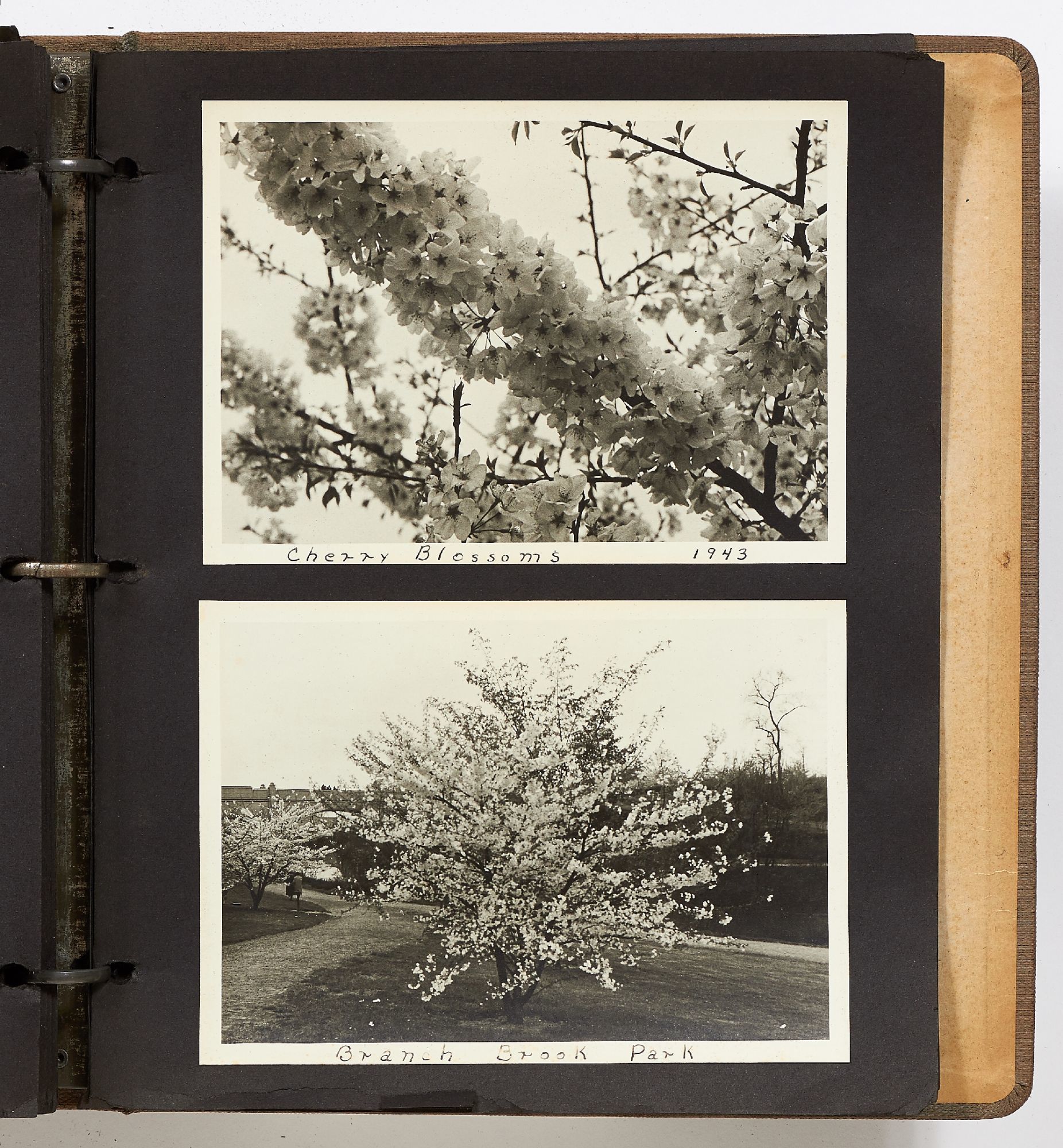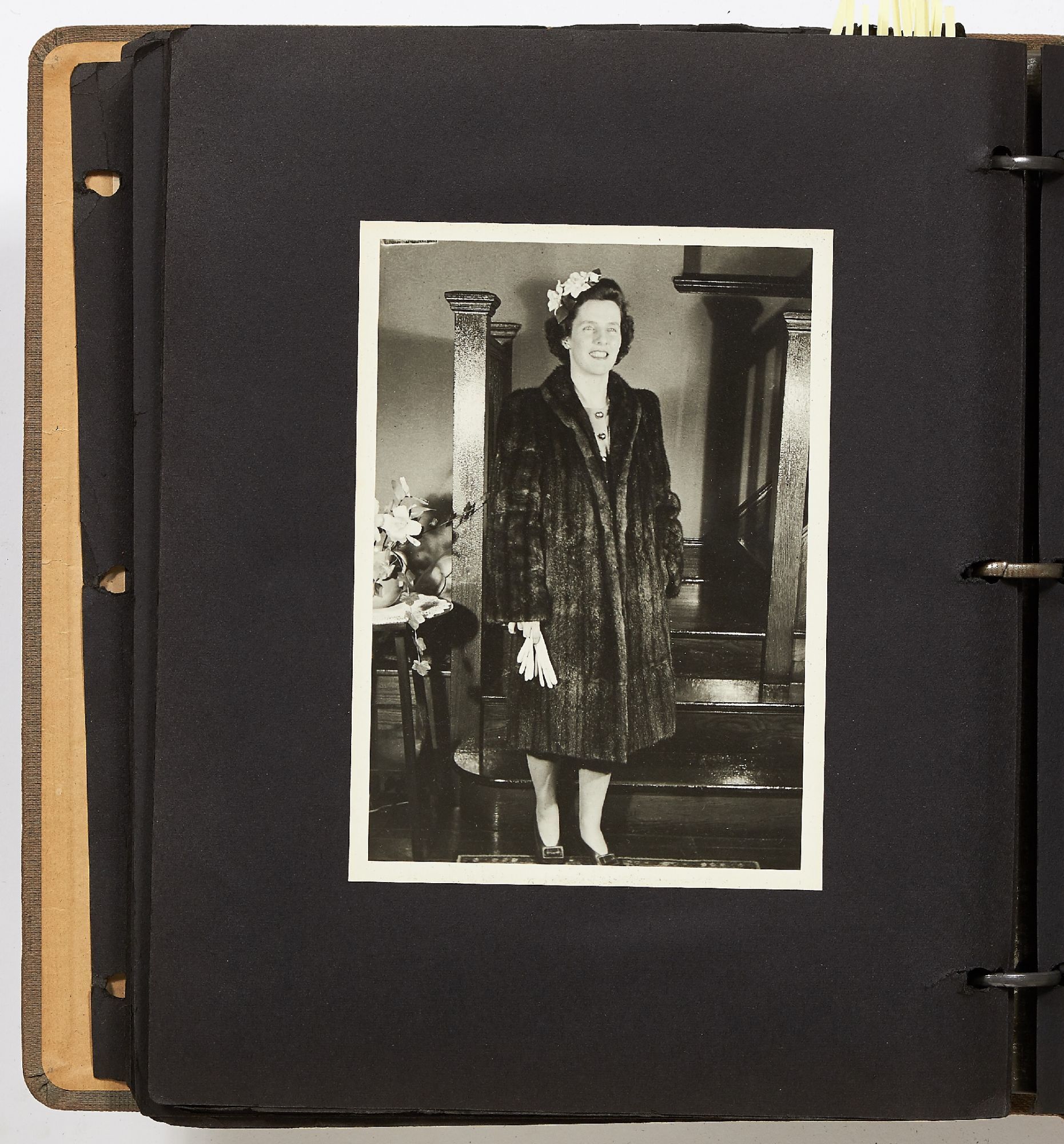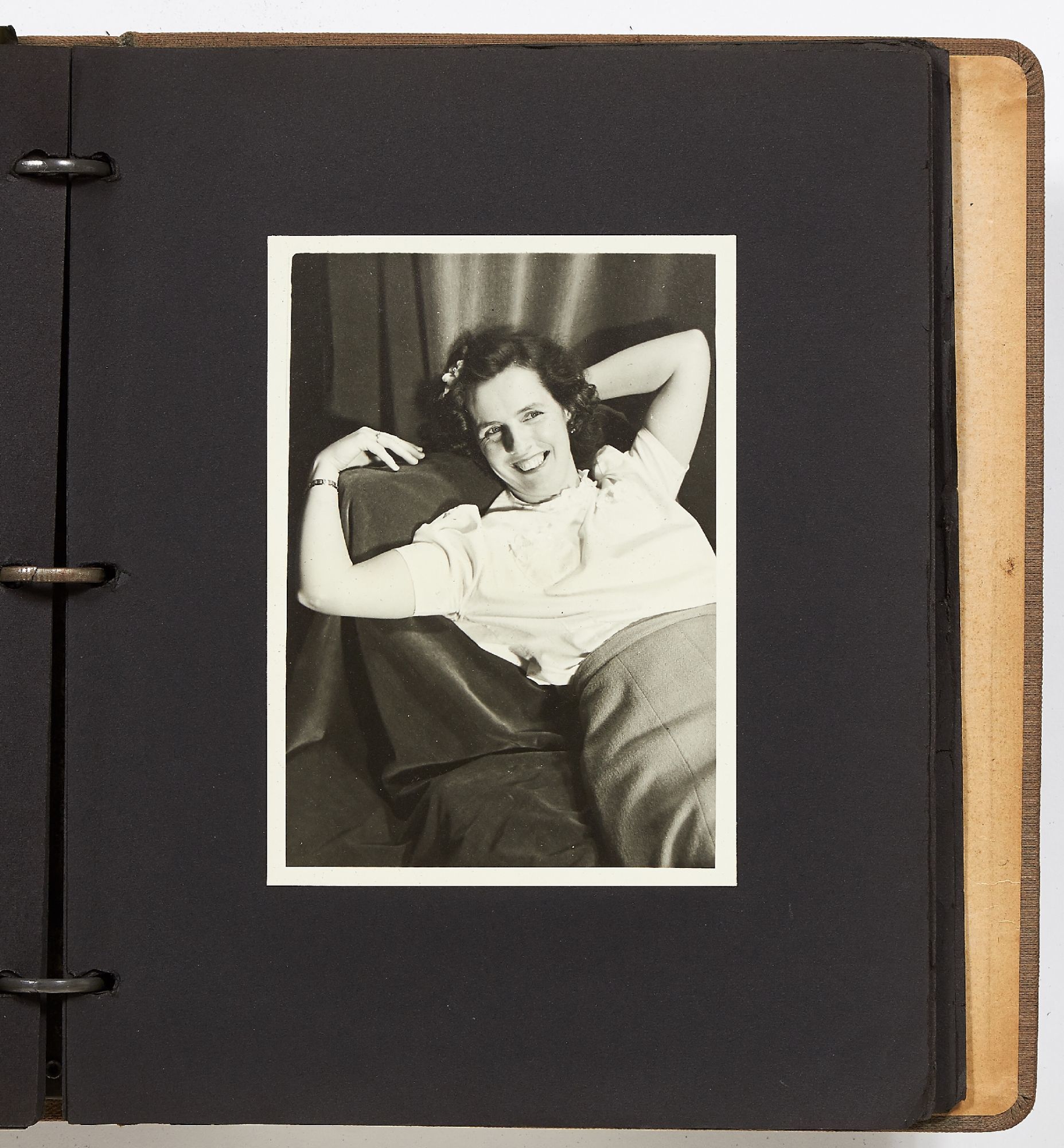 A photo album kept by a New York woman in the early 1940s. The album is filled with amateur photography from someone who was clearly trying to perfect her art. It begins with images of the Hudson River with photos of boats, water sports, and the George Washington Bridge. She also features portraits of travelers on a boat, fashionably dressed men and women in suits and women in turbans. The city of New York is seen in one photo with the ocean liner the S.S. Normandie in the foreground. Following this they attend a clam bake at Indian Head Club with photos of the beach, people in a row boat, and the crowd of the club leisurely hanging around the beach. A well-composed photo of a napping boater is seen here and "Noll's Summer Home" which is an elaborate tent. Other photos show landscape viewed on trips, wild animals, and animals at the zoo. One section of photos includes portrait style images of women in fancy dress, one of which is smoking a cigarette and looking very Hollywood starlet. One particularly beautiful photo shows a winter night on a street lit by a street lamp.