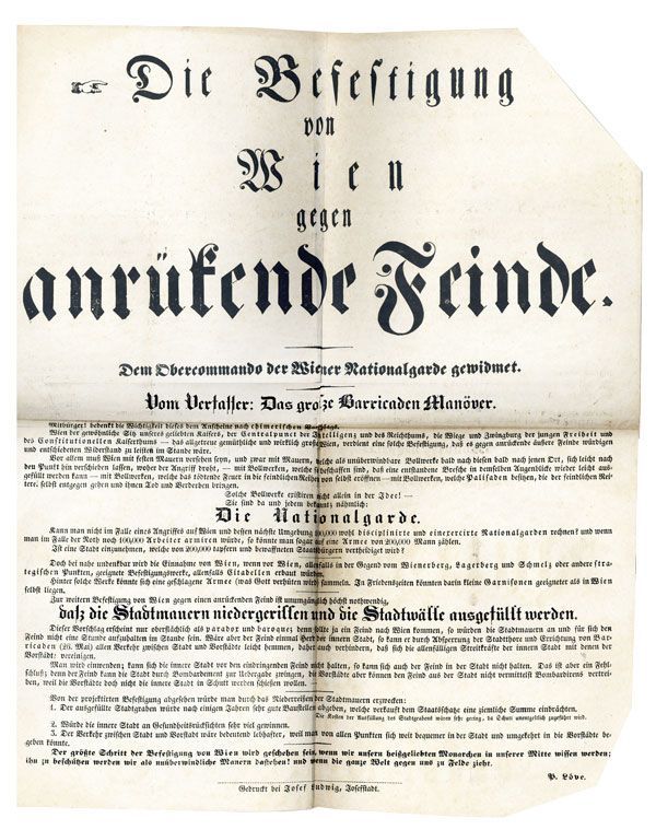 [Wien]: Gredruckt bei Joseph Ludwig, [1848]. First Edition. Broadside (50.75x42cm.) printed blackletter; previous folds, two corners neatly clipped not approaching text, else Very Good to Near Fine. Proposal issued shortly before the Vienna Uprising of October, 1848, during which violence broke out between the laboring class of the city and the Hapsburg army as the latter was trying to leave in order to quell the Hungarian Revolution. Löve, most likely a university student at the time, proposes that Vienna would best be defended if the walls surrounding the inner city were to be dismantled (they would be irreparable if damaged by enemy bombardment) and the moat filled in for building development. Unlocated in OCLC or KVK, though noted in James E. Walsh, 1848 Austrian Revolutionary Broadsides and Pamphlets (1976), p. 143, dating the broadside to June 31, 1848. Löve issued another five or six titles listed in Walsh, one signed in type "Redacteur [I] der Studentenzeitung," (editor of the student newspaper); another "Redakteur des Stürmers" (editor of "The Strikers").
