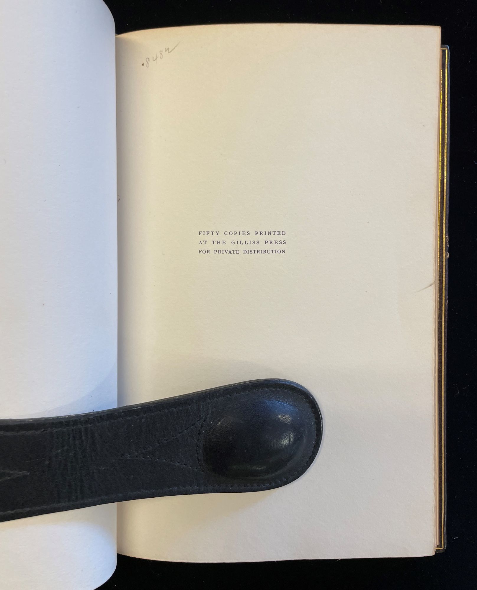 NY: The Gilliss Press, 1912. 1st Edition - Limited. Hardcover. Near Fine. Limited edition, only 50 copies, privately printed by The Gilliss Press for private distribution. The author, Edwin Babcock Holden, is identifed as E.B.H. on the author's note page (after the title page). Contents are Curtis's eulogy of (or address about) Lowell, delivered on Feb 22, 1892; poems written about Curtis written by Lowell in 1874 with an 1887 postscript, here entitled "Epistle to George William Curtis"; and, The Life and Character of George William Curtis" by Charles Eliot Norton, which reprints Norton's speech about Curtis from August 12, 1896 on the occasion of dedication of a bronze tablet honoring Curtis in Ashfield, MA. 8vo, 103 pp, handsomely bound in brown, full crush morocco, 5 raised bands, spine compartments doubled ruled in gilt, as are titles and 1902 date, and the author's initials (EBH) on spine. Covers with four gilt rules as are interior cover edges. Handmade marbleized endpapers. Rear cancel bears handwritten initials "F.S.S" (binder? owner?) Front cover lightly abraded, as are raised spines. Internals fine. Per OCLC, 15 institutions have copies, most with original paper covers.