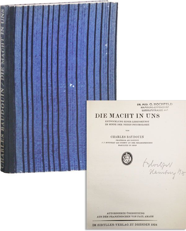 Dresden: Im Sibyllen, 1924. Fourth German Edition. Octavo (23.5cm.); publisher's cloth-backed papier-peint boards, gilt-lettered spine; 177,[3](ads)pp. Spine a bit cocked, boards slightly rubbed, contemporary pencil ownership inscription to title page, else Very Good and sound. German translation of the French-Swiss psychoanalyst's "La Force en Nous" (1923).