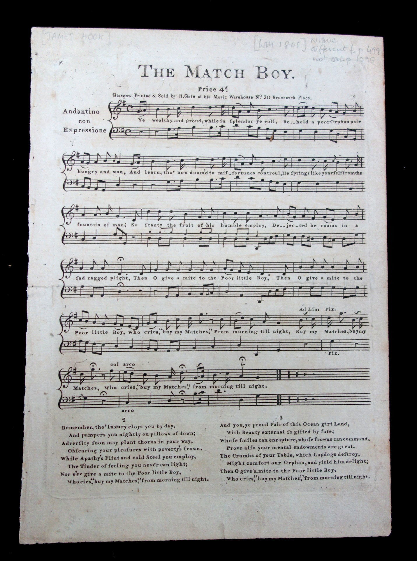Glasgow, Scotland: R Gale, 1805. 1 page, arranged on 2 staves for voice and harpsichord. The song is about an orphaned young boy who sells matches on the street, and the wealthy poplele who walk by him each day. Over three verses the song employs them to "Give a mite to the poor little boy."