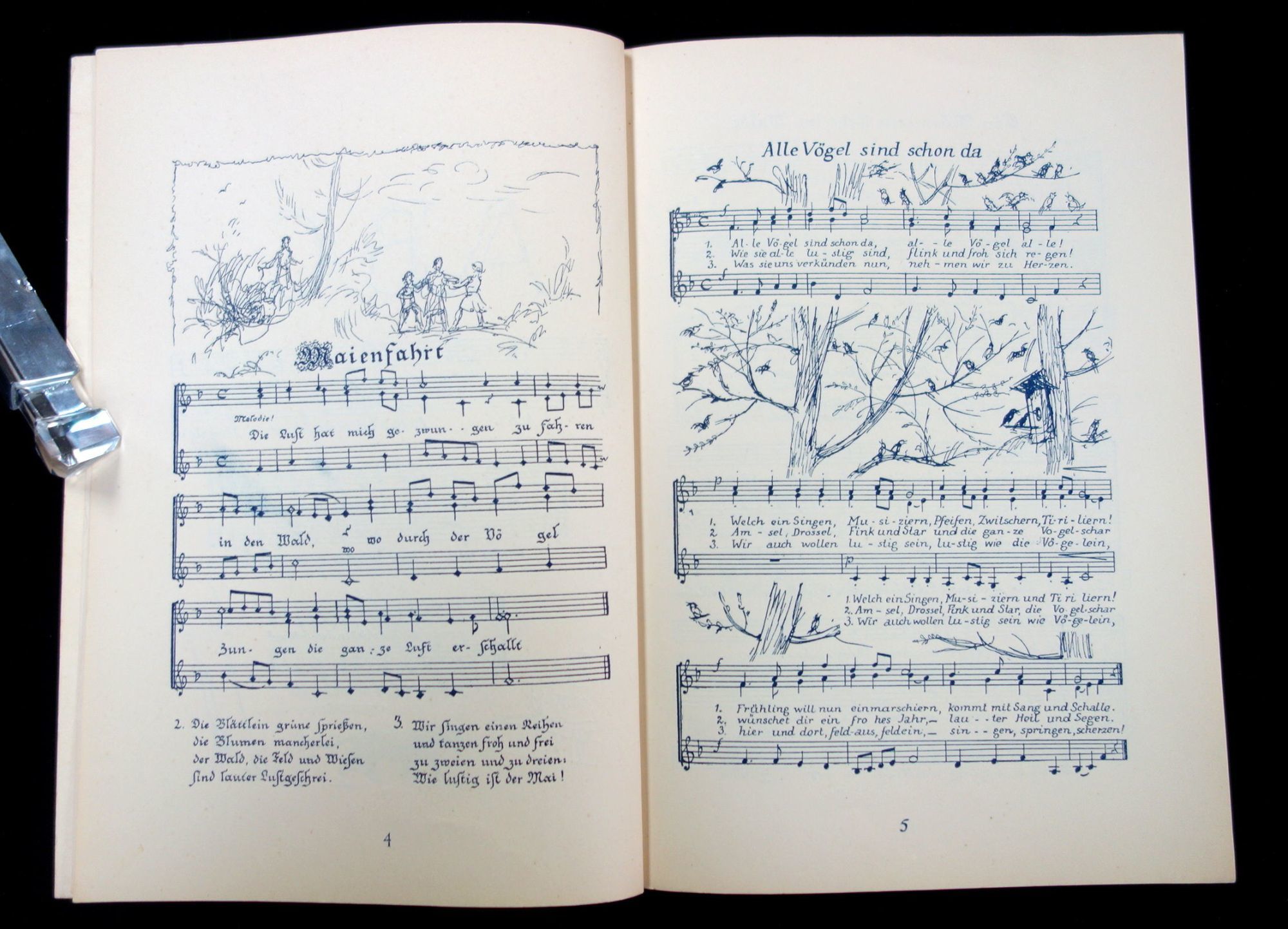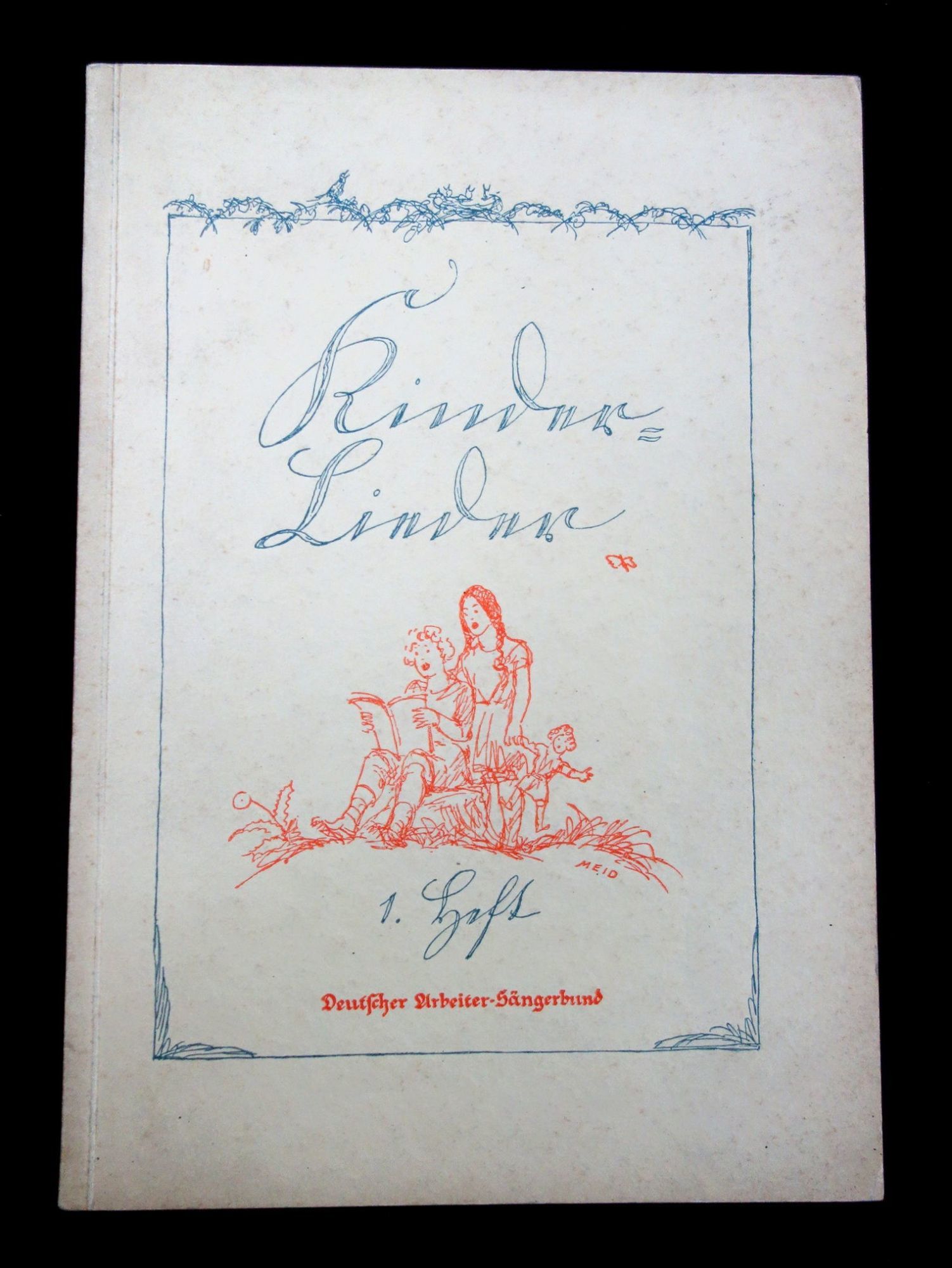 Berlin: Deutscher Arbeitersängerbund [German Workers' Singing Association], 1926. 24 pp, Kinder Lieder: Erstes Heft, zwei- und mehrstimmige lieder und Kanons für kleine und große kinder, which roughly translates to: First Edition, two- and three-part songs and canons for young and old children. The front cover is printed in two colors, with the title and border design in blue and a line drawing of three children of varying ages singing in red. Each song in the book also has illustrations depicting the song. Some of the songs in this book are: Alle Vögel sind schon da [All the Birds Are Already Here], A, B, C, die Katze lief im Schnee [A, B, C, The Cat Ran in the Snow], Ein Männlein steht im Walde [A Little Man Stands in the Forest], and Der Kuckuck und der Esel [The Cuckoo and The Donkey]. In German. Measures 9 1/2" x 6 1/2'. Minor toning and soiling due to age.