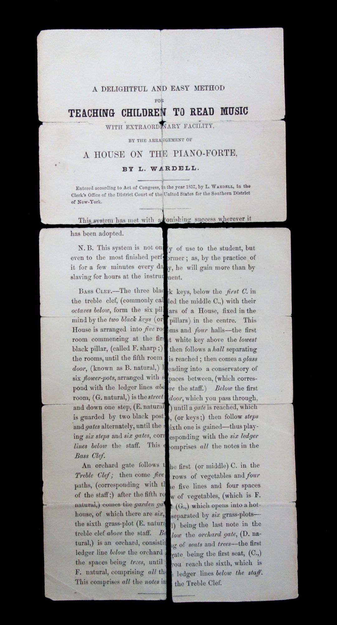 1857. A way of learning how to play the piano-forte by L Wardell in which he instructs the player to image a house over the keys. Each key represents a different room or pillar of the house. Wardell claims that "this system has met with astonishing success wherever it has been adopted." Measures 10 1/4" x 4 1/2" There are two separations.