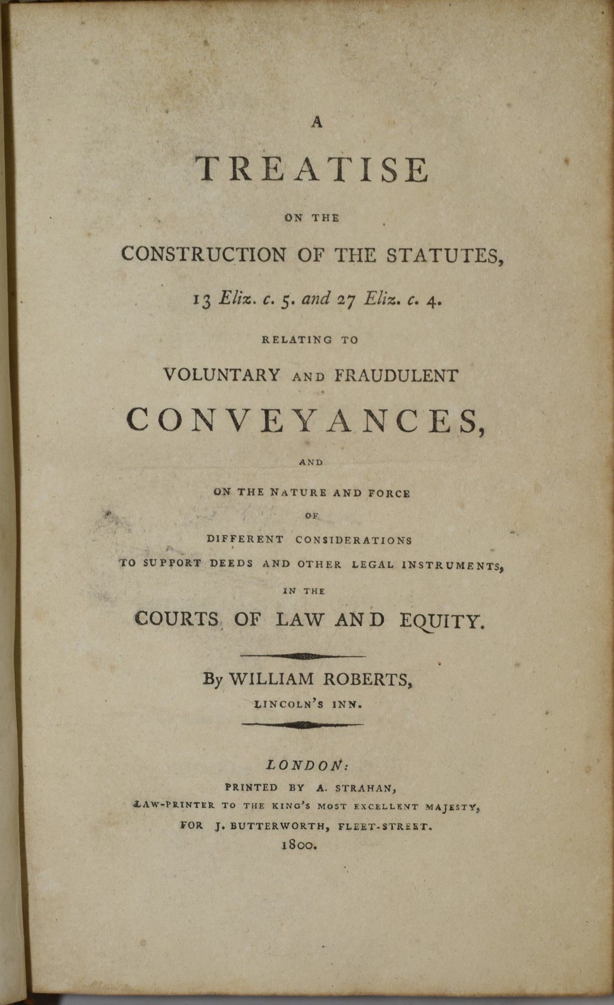 A TREATISE ON THE CONSTRUCTION OF THE STATUTES 13 Eliz. C. 5. AND 27 ELIZ. C. 4., RELATING TO VOLUNTARY AND FRAUDULENT CONVEYANCES AND ON THE NATURE AND FORCE OF DIFFERENT CONSIDERATIONS TO SUPPORT DEEDS AND OTHER LEGAL INSTRUMENTS ..