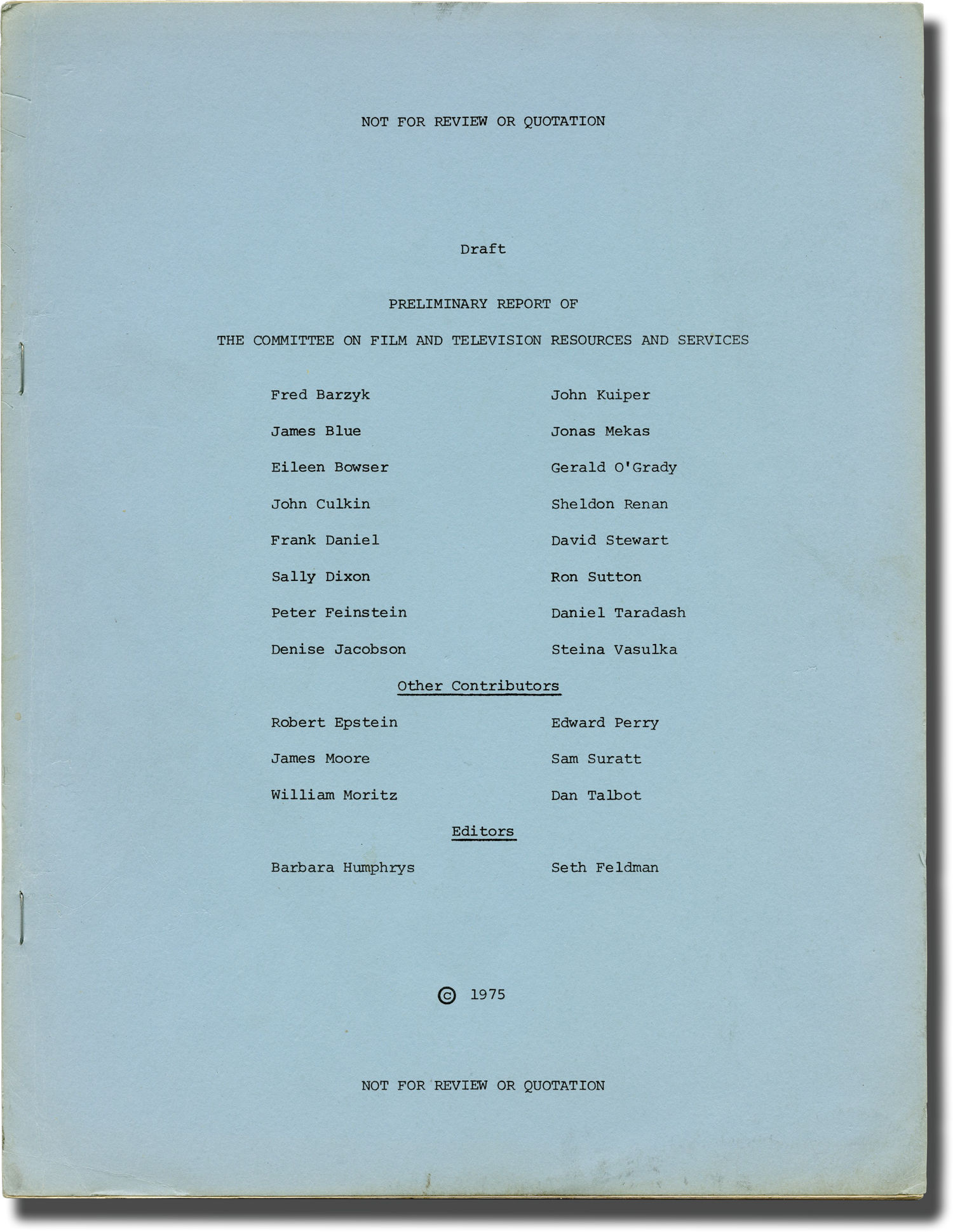 New York: Committee on Film and Television Resources and Services, 1975. First Edition. First Edition, noted as "Not for review or quotation / Draft" on the front wrapper.