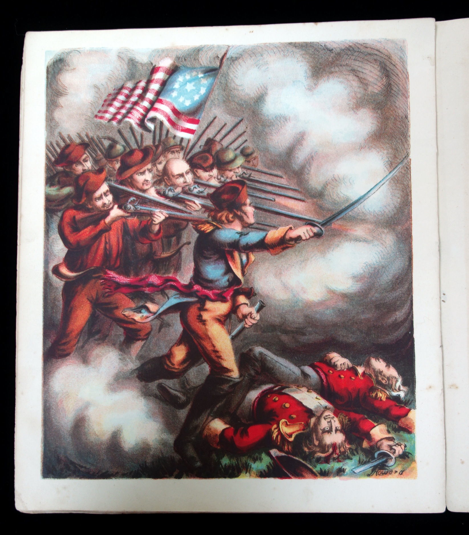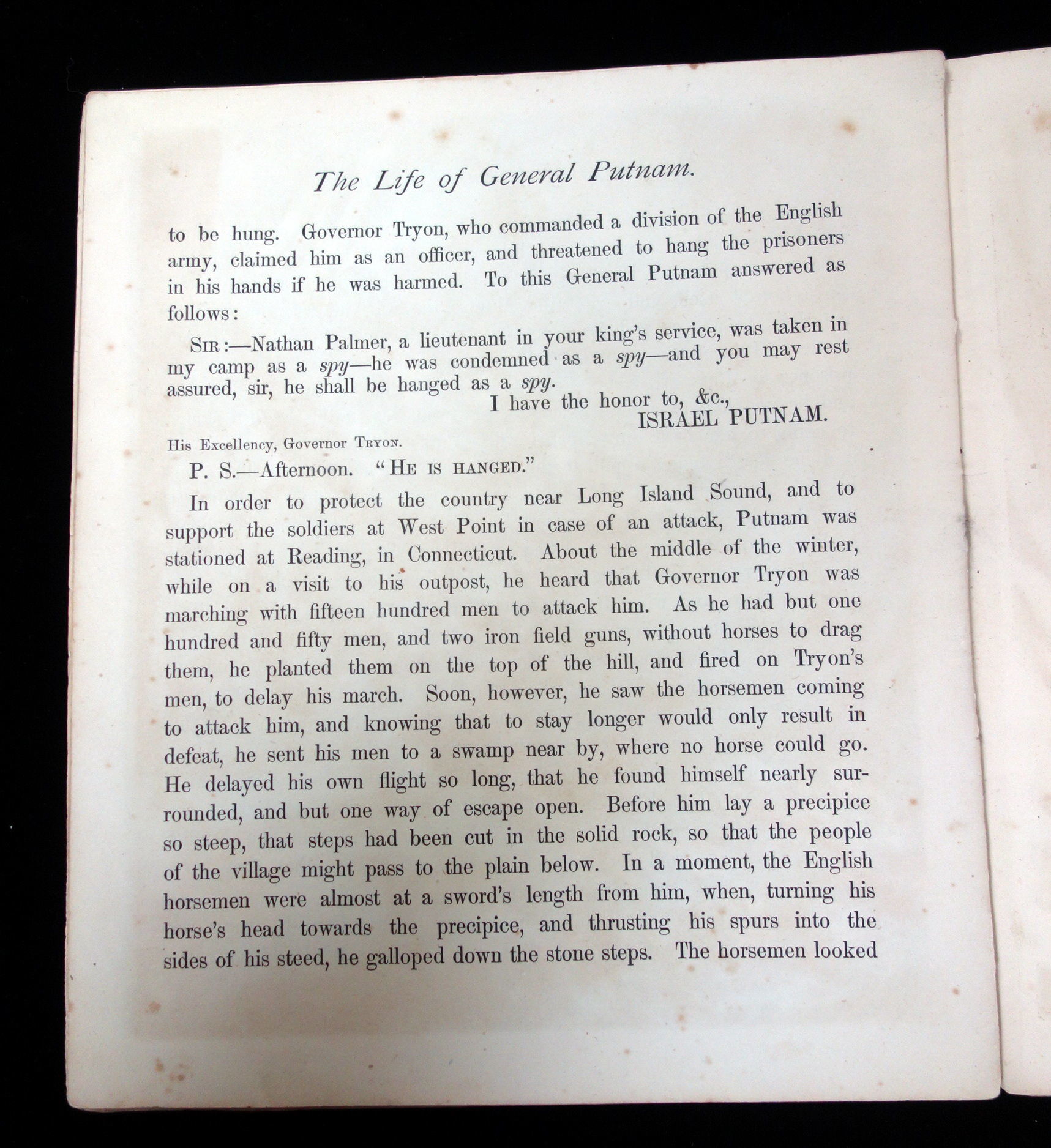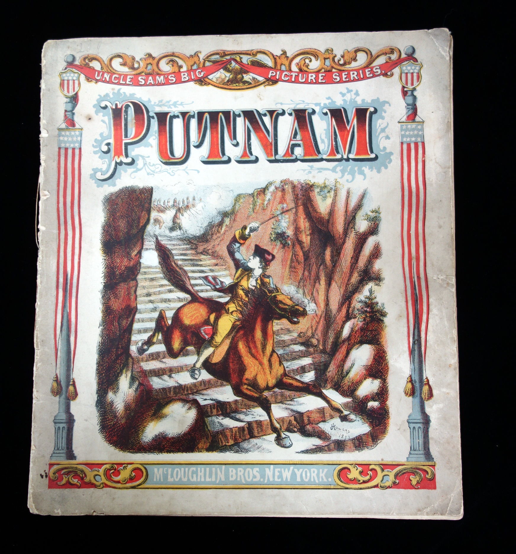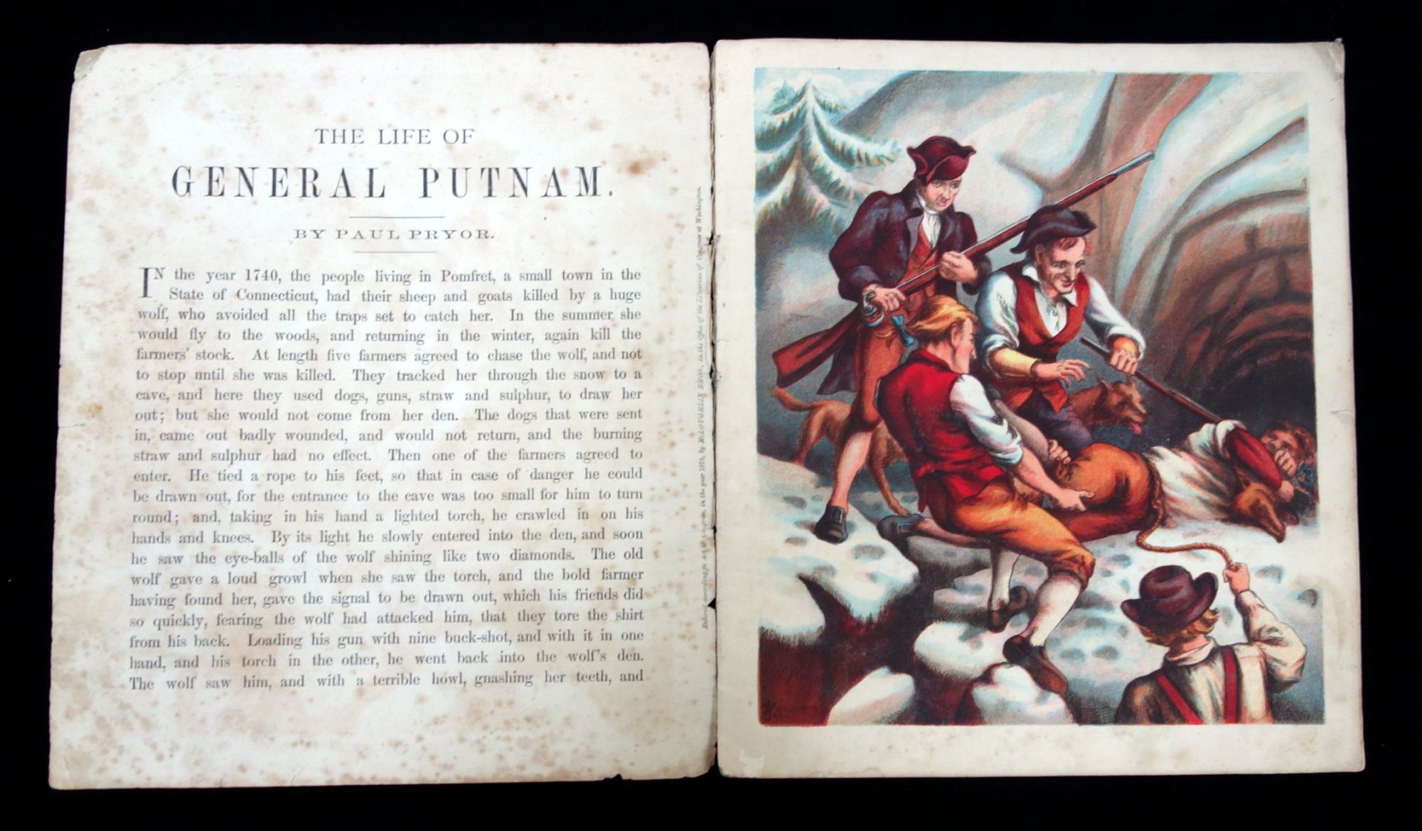 New York: McLoughin Brothers, 1873. 24 pp (including wrappers) The title page states The Life of General Putnam'. "The book tells the embellished story of the life of General Israel Putnam, starting as a young boy who slaughters a wolf, and his time in service during the French and Indian War and the Revolutionary War. There are six full page colored illustrations, rich in detail and color. The author is Paul Pryor, who is under the pseudonym of American writer E.T. Taggard. A part of Uncle Sam's Big Picture Series. Measures 10 1/2" x 9" Cover is mostly fully detached. The binding is loose by intact, and one page is fully detached. Edge wear. Soiling and toning to interior pages. The last few pages have foxing.