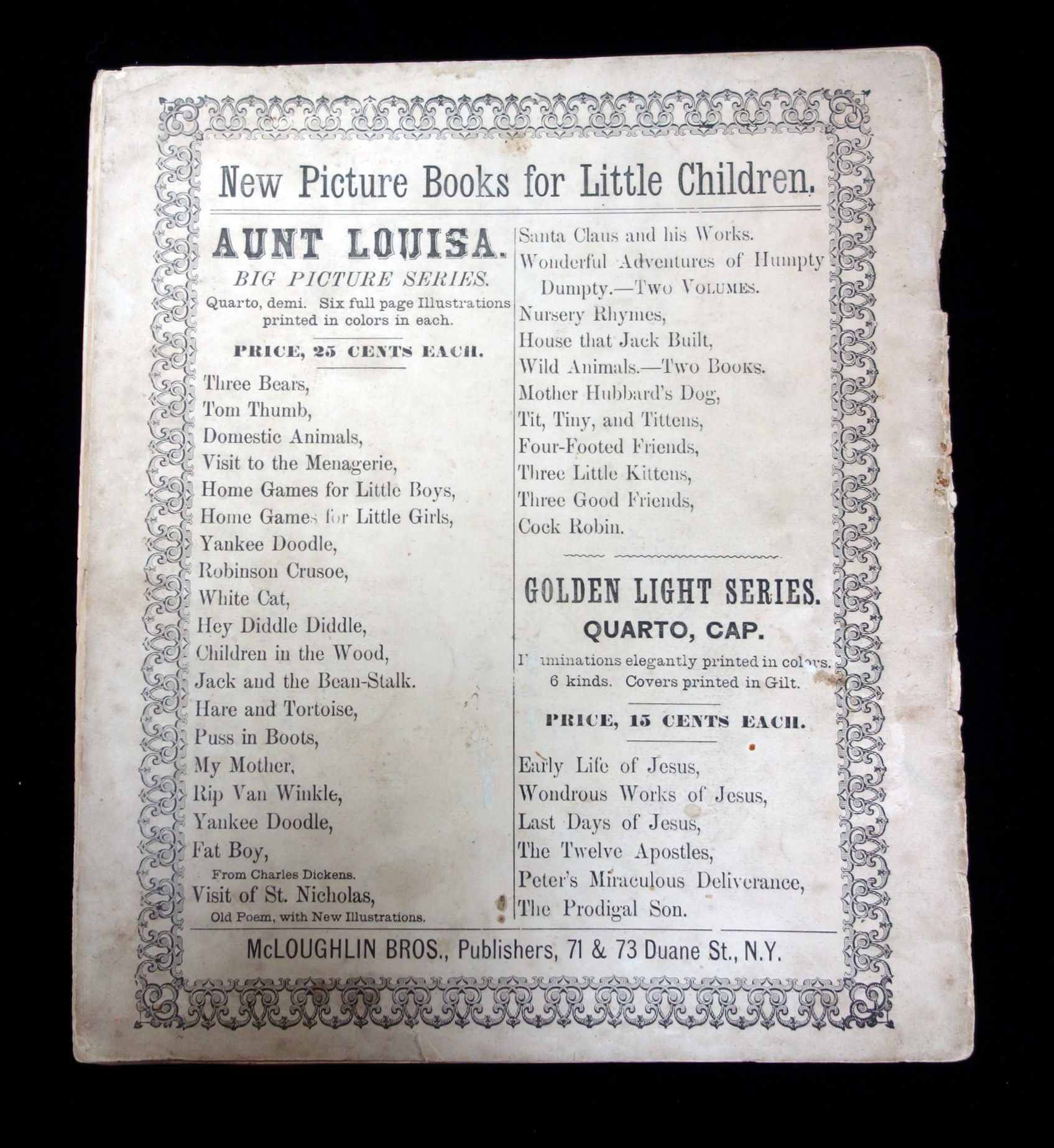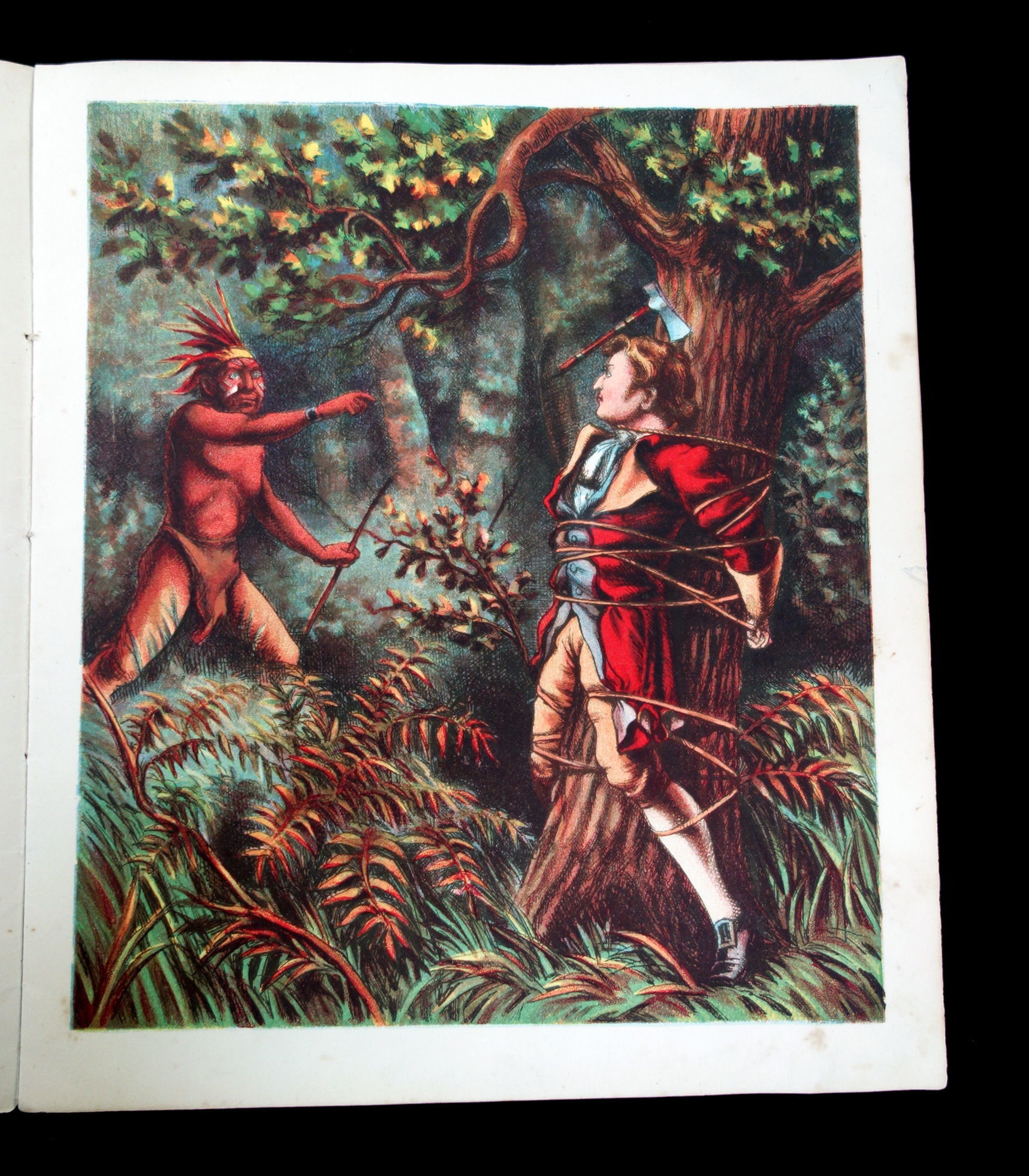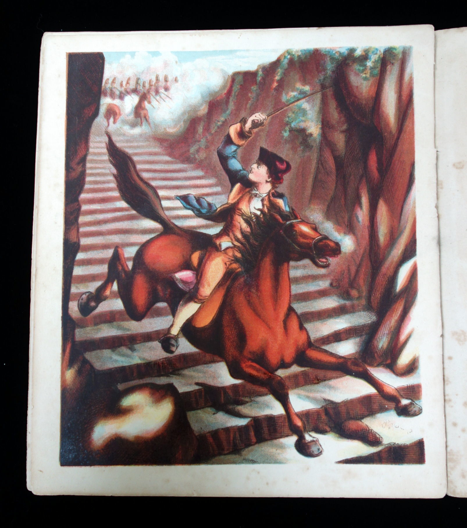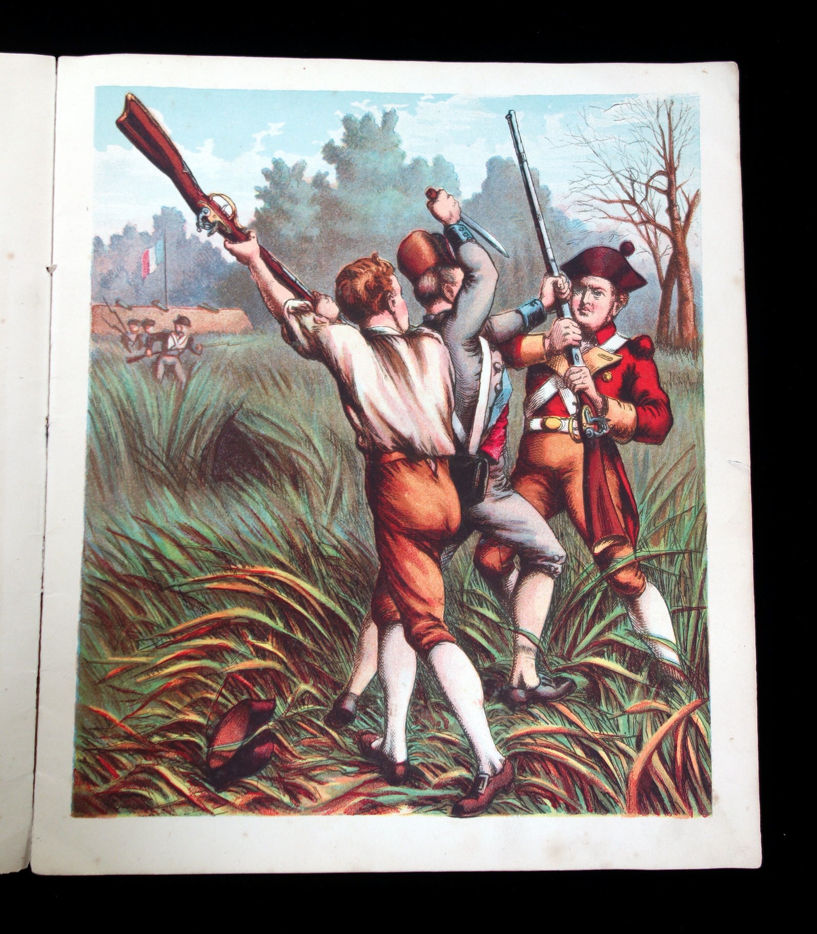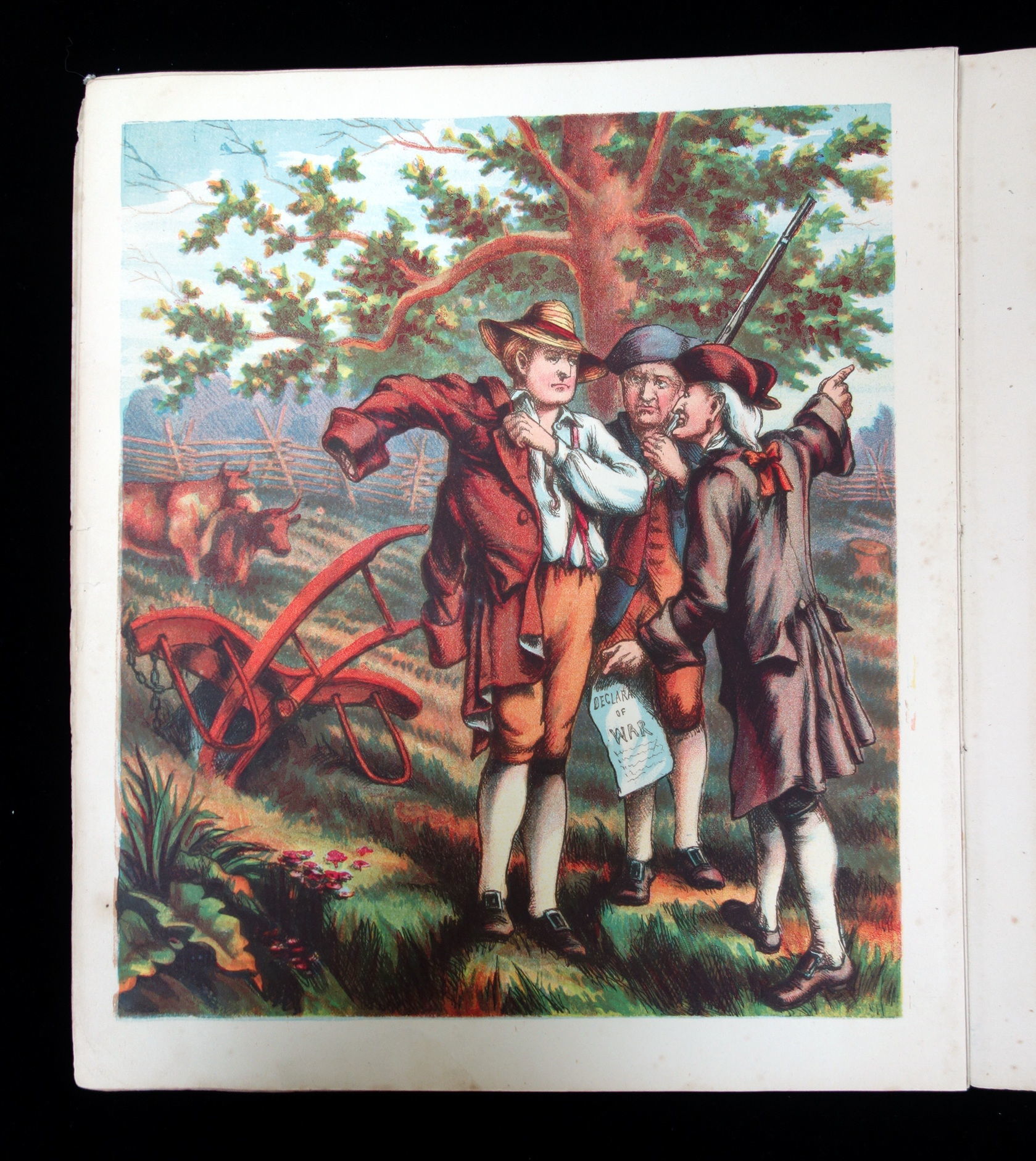New York: McLoughin Brothers, 1873. 24 pp (including wrappers) The title page states The Life of General Putnam'. "The book tells the embellished story of the life of General Israel Putnam, starting as a young boy who slaughters a wolf, and his time in service during the French and Indian War and the Revolutionary War. There are six full page colored illustrations, rich in detail and color. The author is Paul Pryor, who is under the pseudonym of American writer E.T. Taggard. A part of Uncle Sam's Big Picture Series. Measures 10 1/2" x 9" Cover is mostly fully detached. The binding is loose by intact, and one page is fully detached. Edge wear. Soiling and toning to interior pages. The last few pages have foxing.