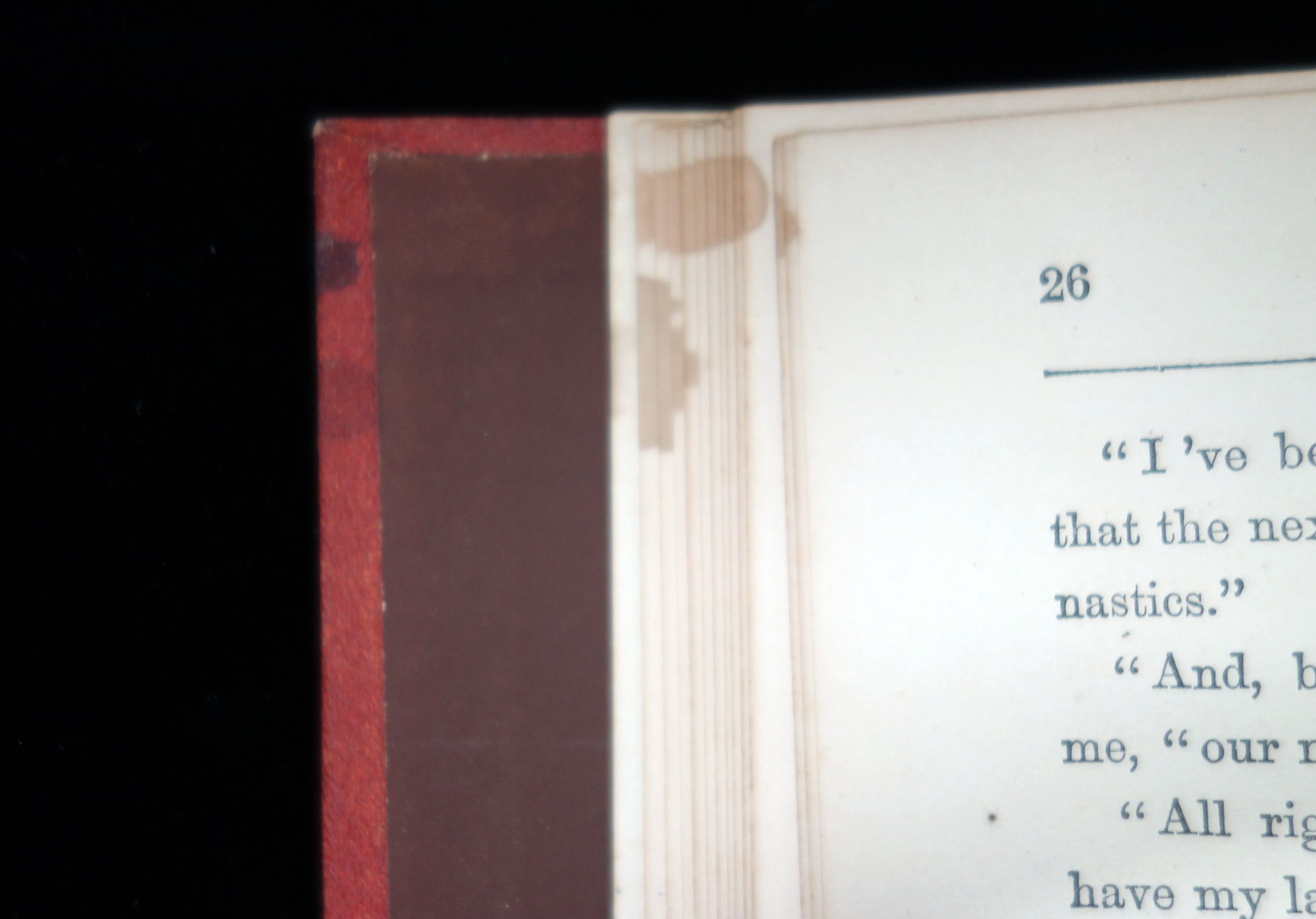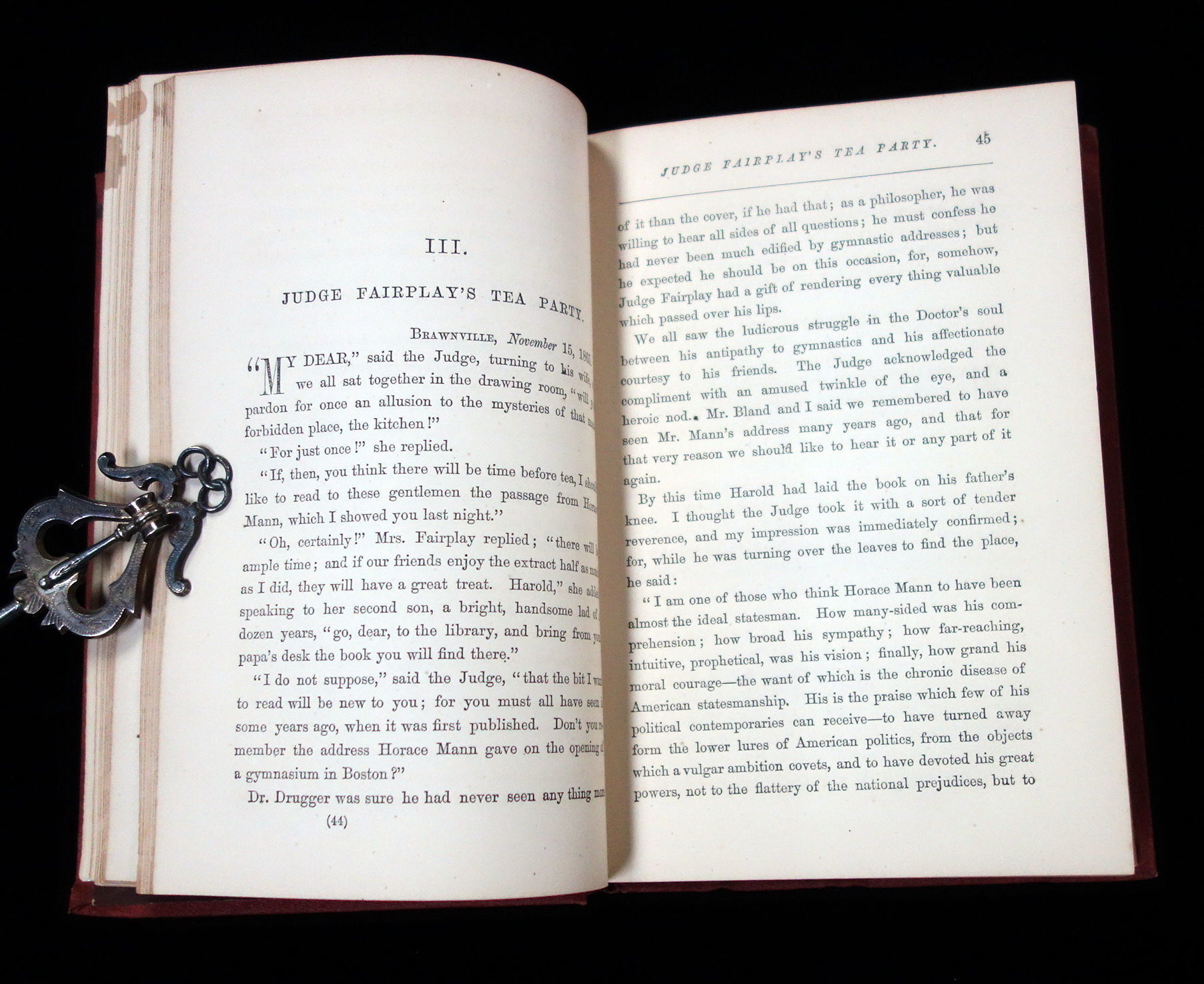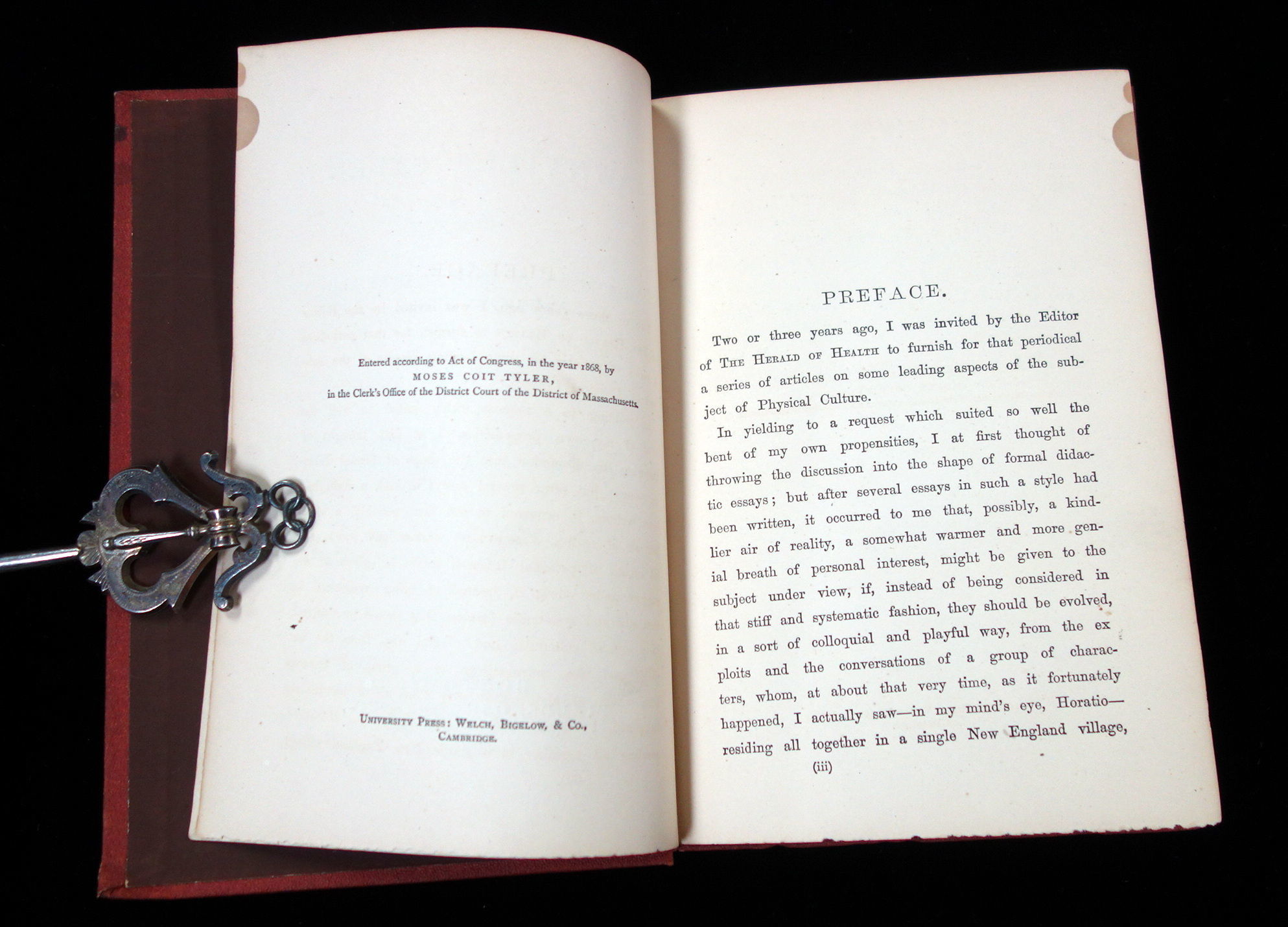 Boston: Fields, Osgood & Co, 1869. 215 page book, with gilt stamped covers. Twelve essays written on the subject of 'physical culture'. First appeared as articles in the Herald of Health Journal. While it might have first have been indended to be essays on 'physical culture' these articles have snowballed into commentary on life, as well as memoirs of the Brawnville Althletic Club. Measures 7 x 5 1/4" Edge wear, partially on the spine. The book is missing one page, it is evident that it was torn from the book. However it appears to have been the blank page before the title page. There is a small stain on the top corner of the first 25 pages or so, does not affect readability,
