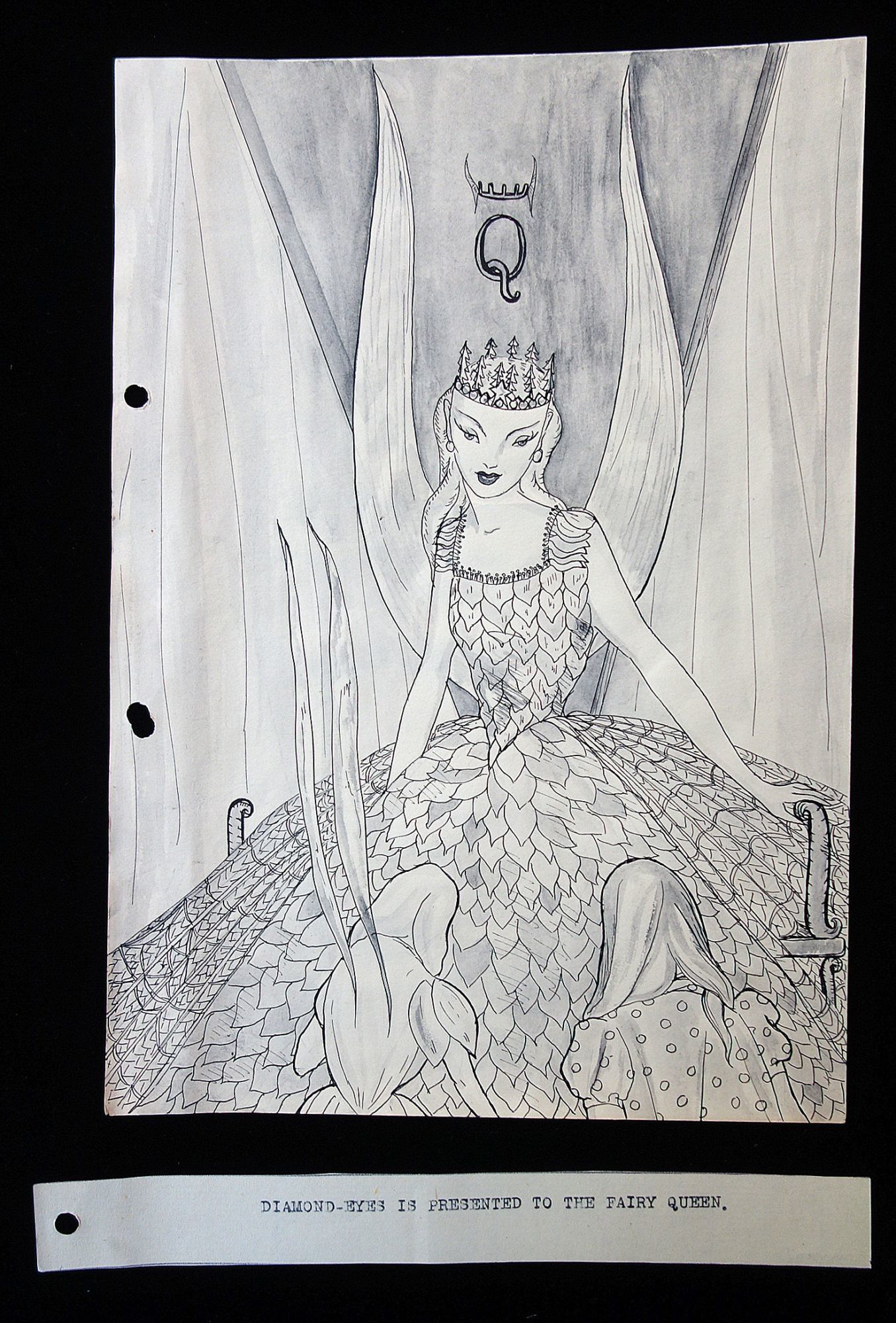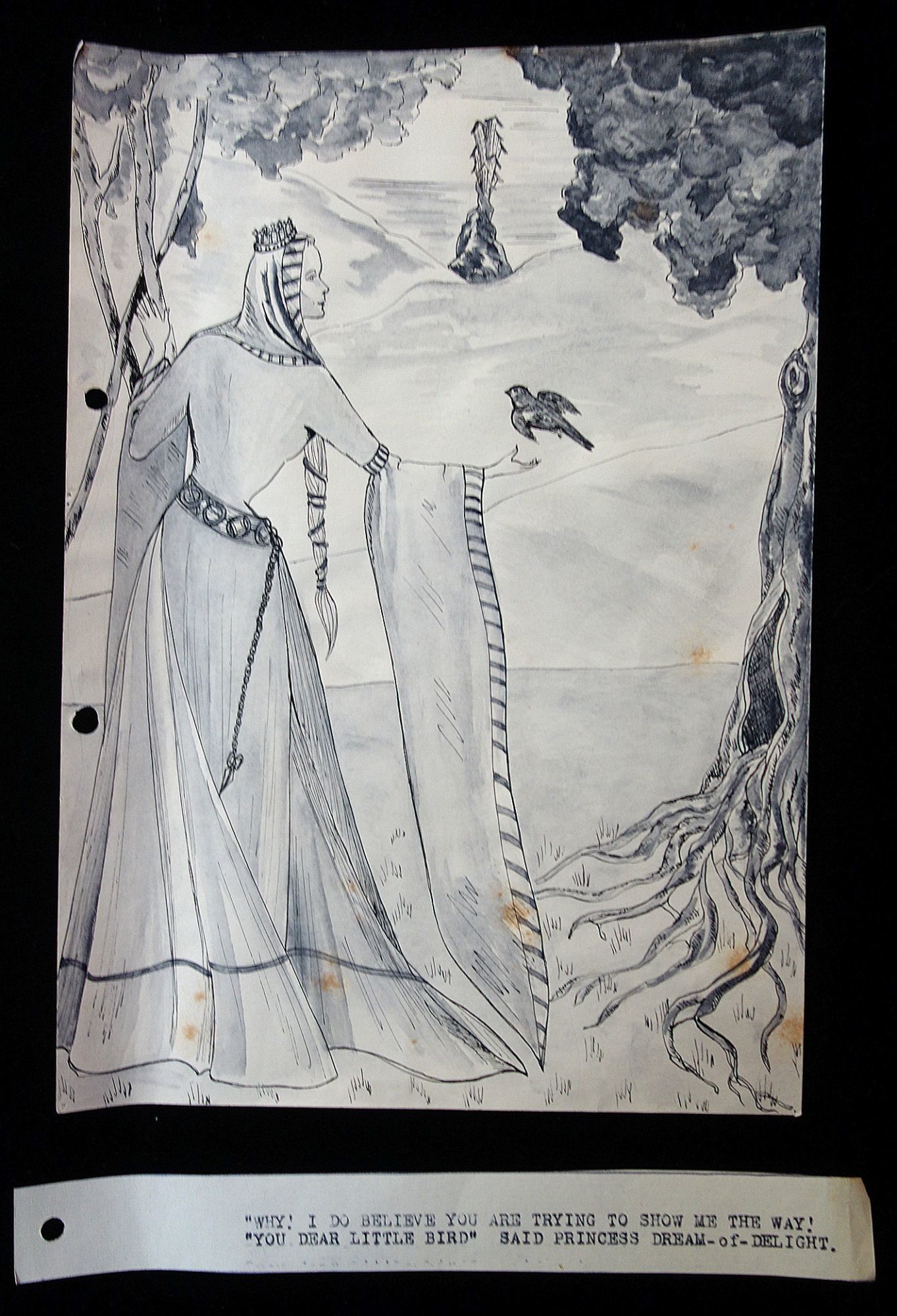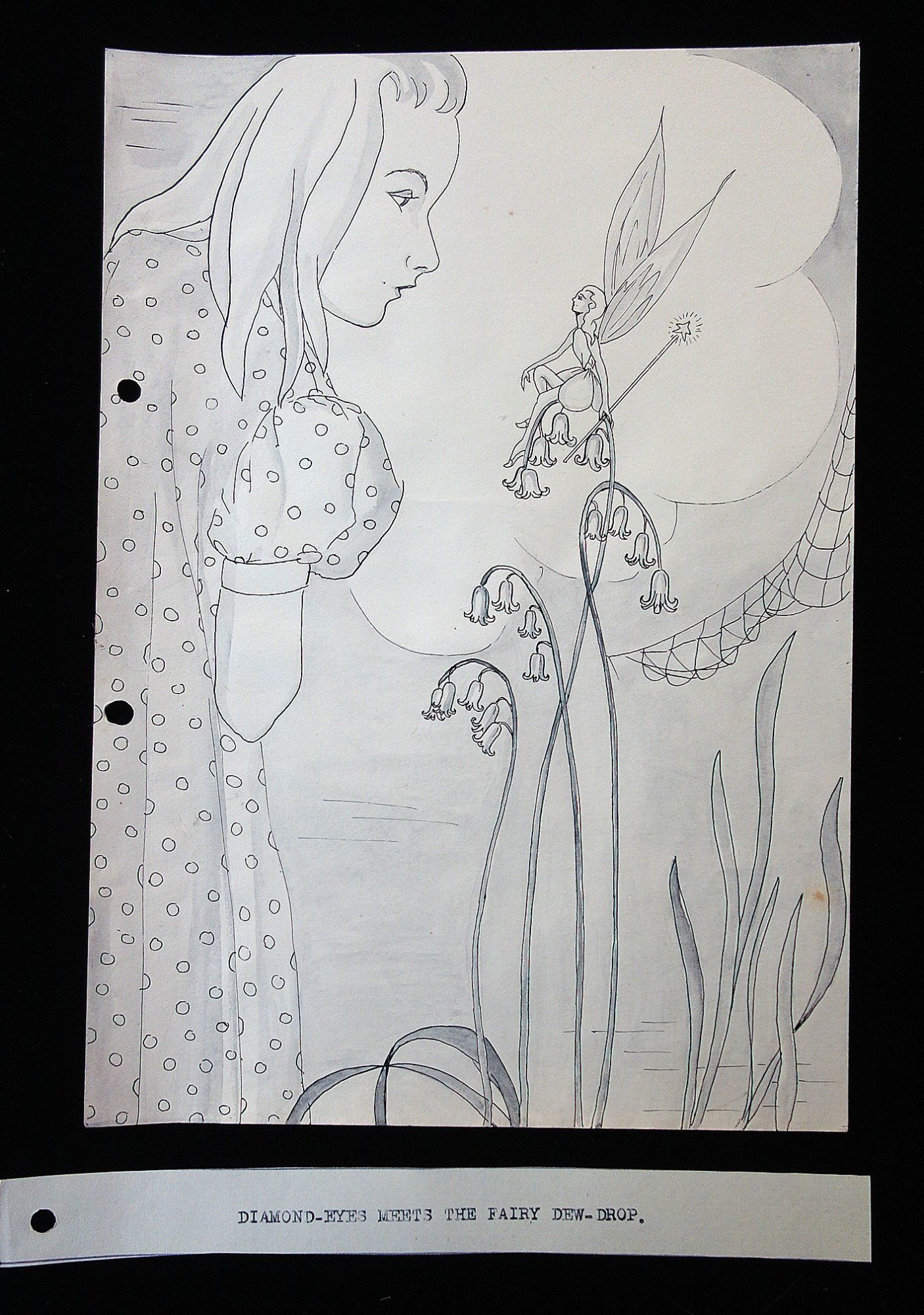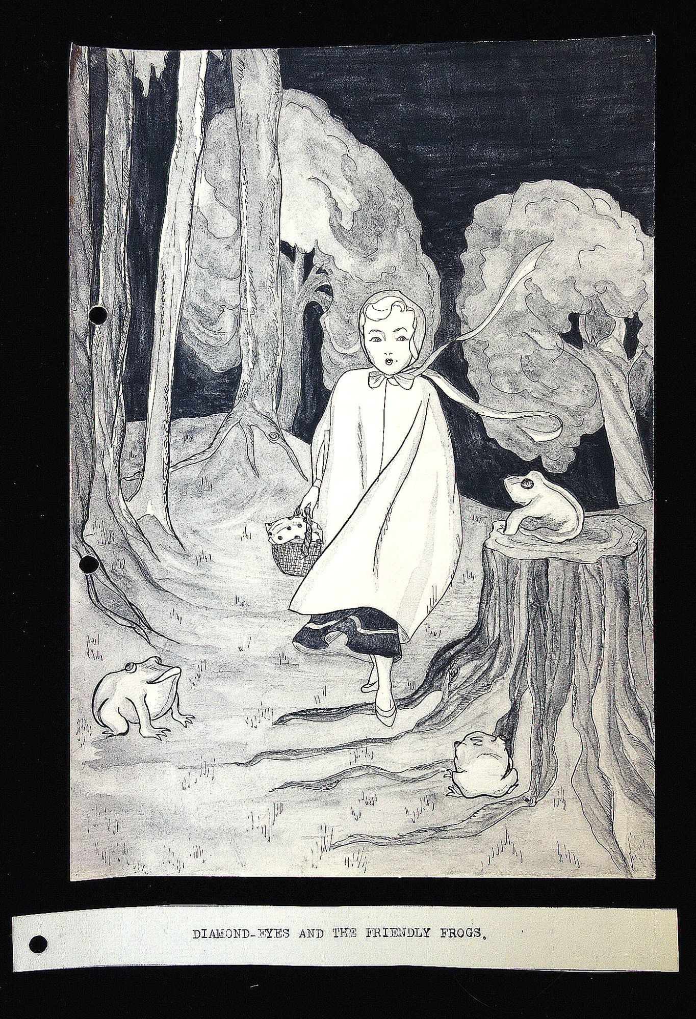 The second story is 18 pp. and tells of the adventures of a girl called Little Diamond Eyes including subplots of The Fairy Dewdrop and The Friendly Frogs, Dewdrop in Danger and A Peep into Fairyland. Includes 7 full page illustrations in black and white and gray-tones. Each with a printed captions. Measures 10 1/4" x 8 1/4". Loose-leaf.