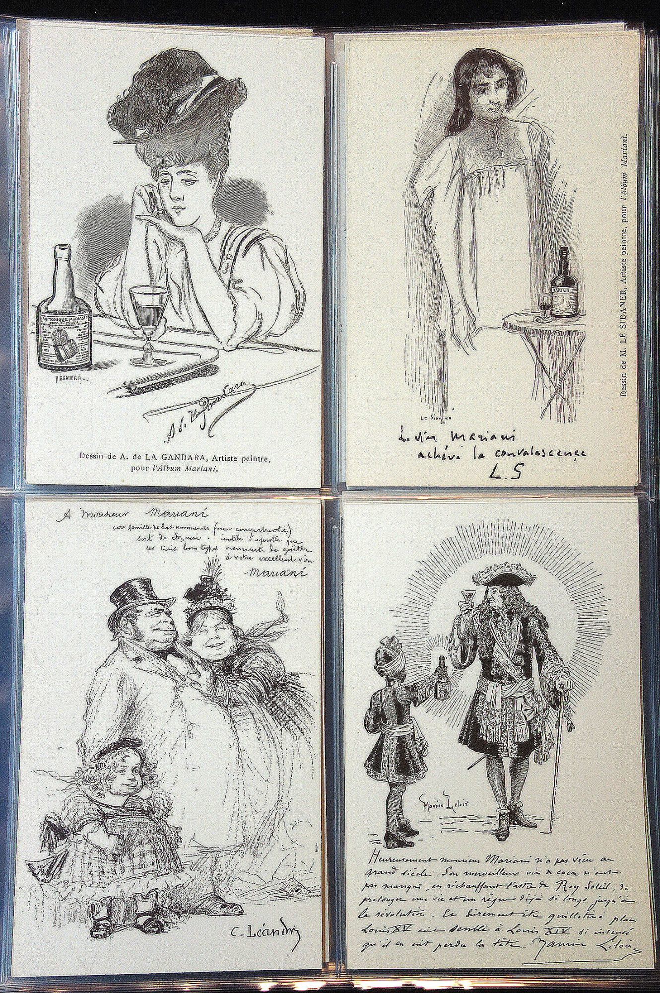 As an example, the artists in the first series Paul Avril, F. Roybet, Ch, Waltner, Lévy-Dhurmer, G, Meunier, Paul Renouard, H, Berteaux, Muenier, Mucha, Hermann Paul, Eug, Murer, Lacault, Ribéra, K, Adler, Léon Glaize, Le Sidaner, Paul-Albert Laurens, Louis Noël, Ferigoule, A, Lalauze, Hagborg, Atalaya, W, Bouguereau, A, Maignan, J, Cheret, De Richemont, Bigot, Sem, Léandre and L, Vallet. At age 25, in 1863, Angelo Mariani marketed a patent medicine called Vin Tonique Mariani a la Coca de Perou. Based on Bordeaux wind infused with three varietals of coca leaves in the bottle. It was immediately applauded as an ideal stomach stimulant, analgesic on the air passages and vocal chords, appetite suppressant, antidepressant and treatment against anemia. Dosed as a small glass to be taken 3 times a day, 30 minutes before meals. Each ounce contained 6 mg of cocaine. Loved by kings and queens, popes and presidents, scientists and inventors, writers and dancers and more. Testimonials filled 15 leather -bound published volumes.
