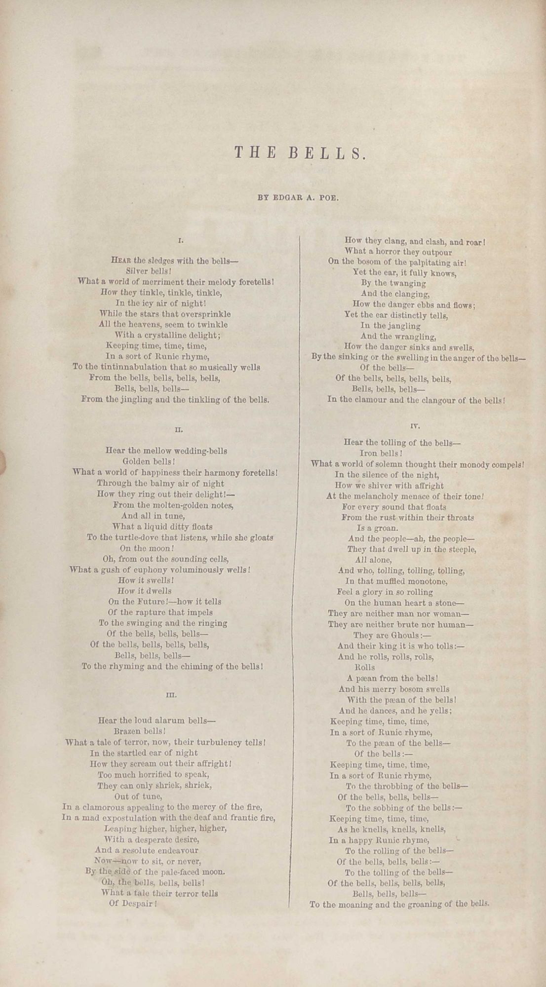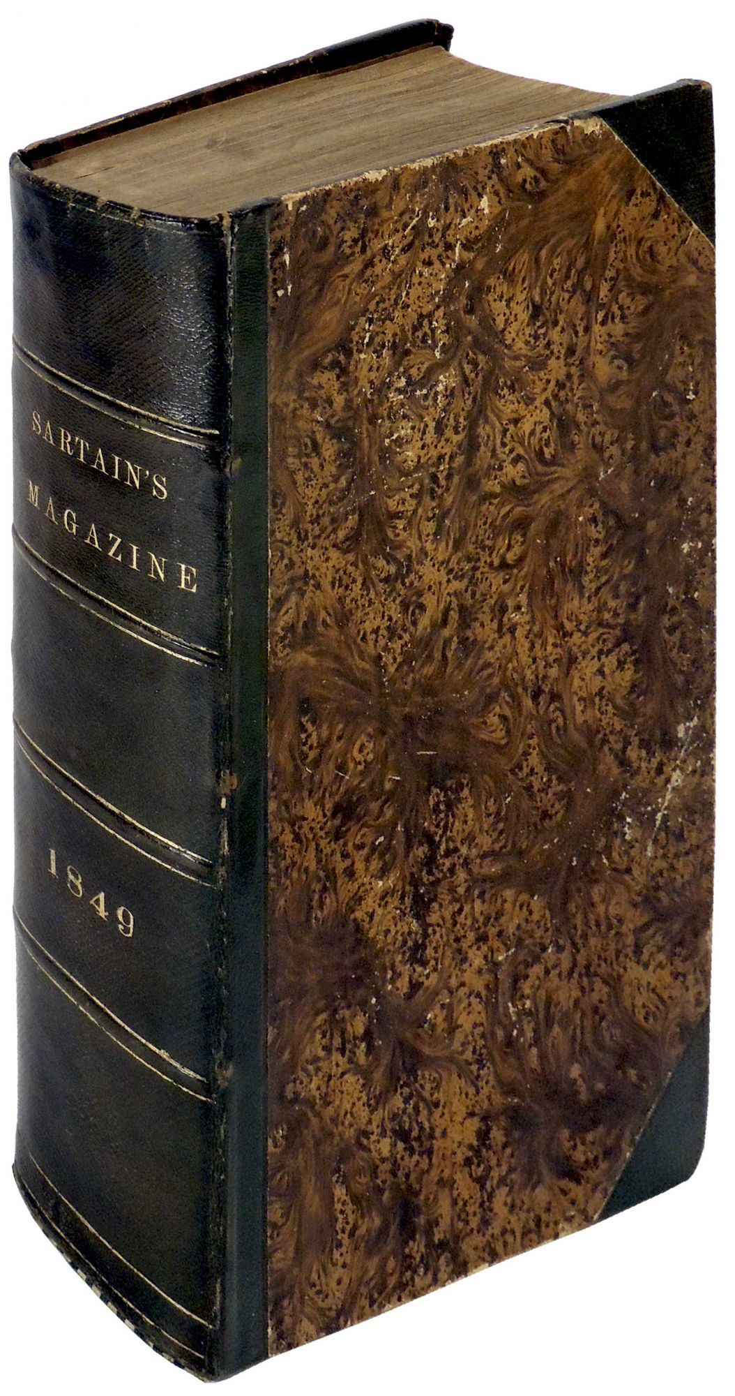 Philadelphia: John Sartain & Co, 1849. Hardcover. Very Good. Hardcover. Includes “A Valentine" on page 173 of Volume 4 and “The Bells” on page 304 of Volume 5. Also contains a review of Rufus Griswold’s “Female Poets of America,” on page 415. This is the first printing of “The Bells”; however, “A Valentine” was originally printed in the Evening Mirror in 1846 under the title "To Her Whose Name is Written Below." Both volumes are bound together in three-quarter dark green leather with brown and black marbled paper covered boards, titled in gilt on the spine. There are four raised bands ruled in gilt to the spine. There is a three inch split to the head of the front joint and it appears that the binding has been repaired (amateurly) at some point. Both interior hinges are cracked; however, the boards and textblock remain firmly attached. Rubbing to boards with a few small open tears to the marbled paper on the rear cover. Wear to edges of the boards and corners. Spots of foxing and soiling to interior. Both volumes include numerous full page engravings, some colored. The indexes for both volumes appear at the end of the book. Attractive despite the noted wear. Volume 4 has 416 pages; Volume 5 has 389 pages. PER/011118.