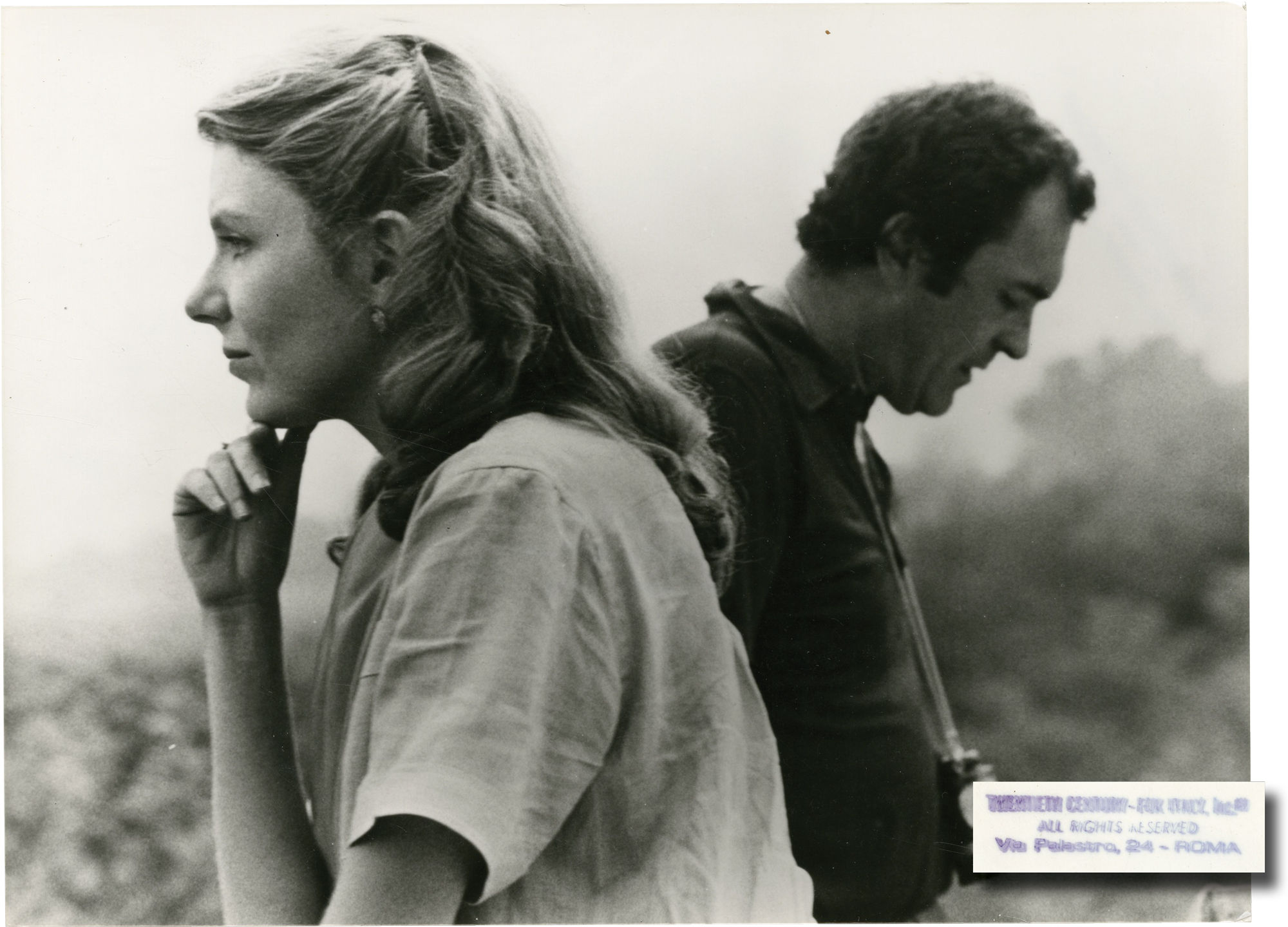 Italy / US: Twentieth Century-Fox, 1979. Vintage borderless photograph showing actor Jill Clayburgh and director Bernardo Bertolucci in a pensive moment during on outdoor shoot from the set of the 1979 film. With the stamp of US co-producer Twentieth Century-Fox and identifying manuscript notation on the verso.