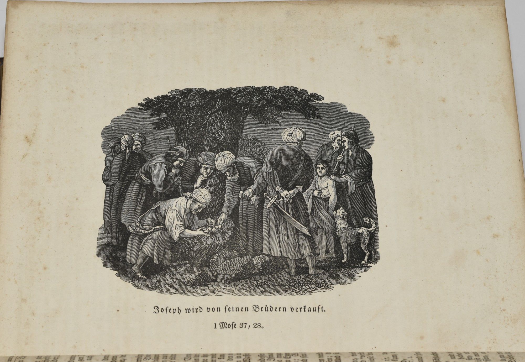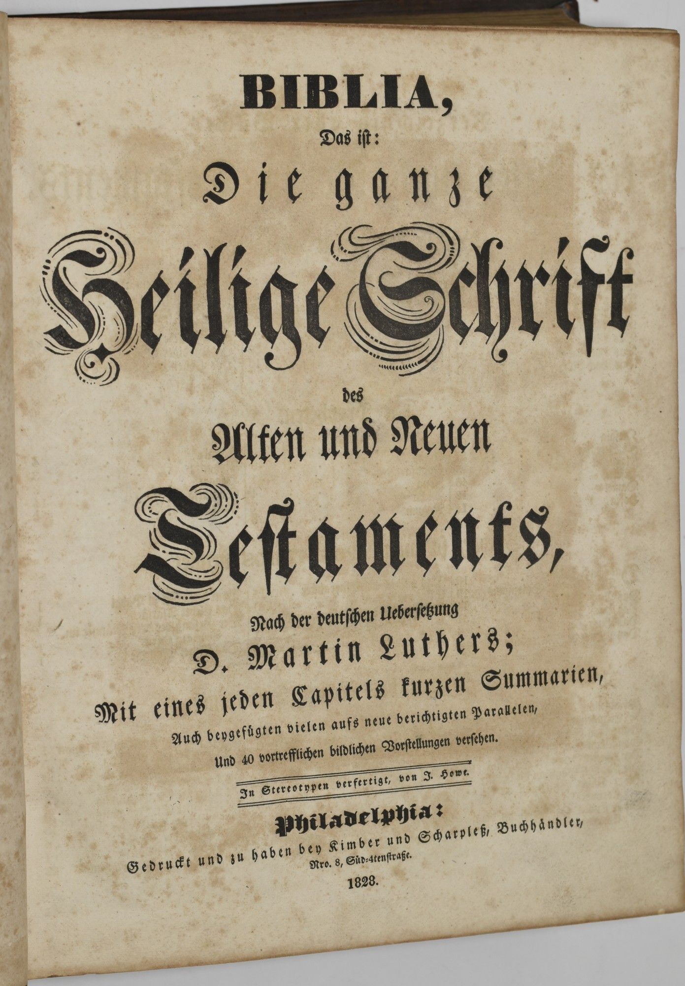 Philadelphia: Kimber und Scharpless, 1828. Full Leather. Very Good binding. A Luther Bible, with 40 "excellent plates" called for, of which 39 appear to be present. Some plates are numbered and some are not, but the numbered plates appear to skip from plate 30 to plate 32 (though there is no evidence of excision) With a separate title page for "Das Neue Testament", and a two blank leaves with elaborate borders of "Familien Register"between the testaments. 932 pages; bound in mottled calf with raised bands and morocco label; lacking the leather clasps. Very Good binding.