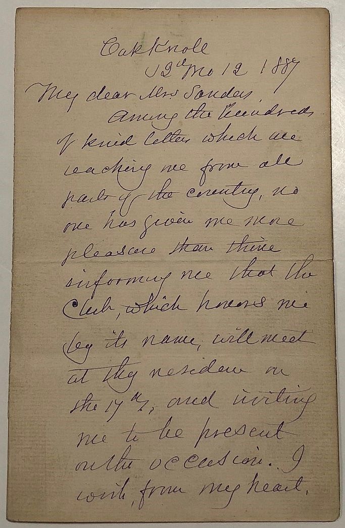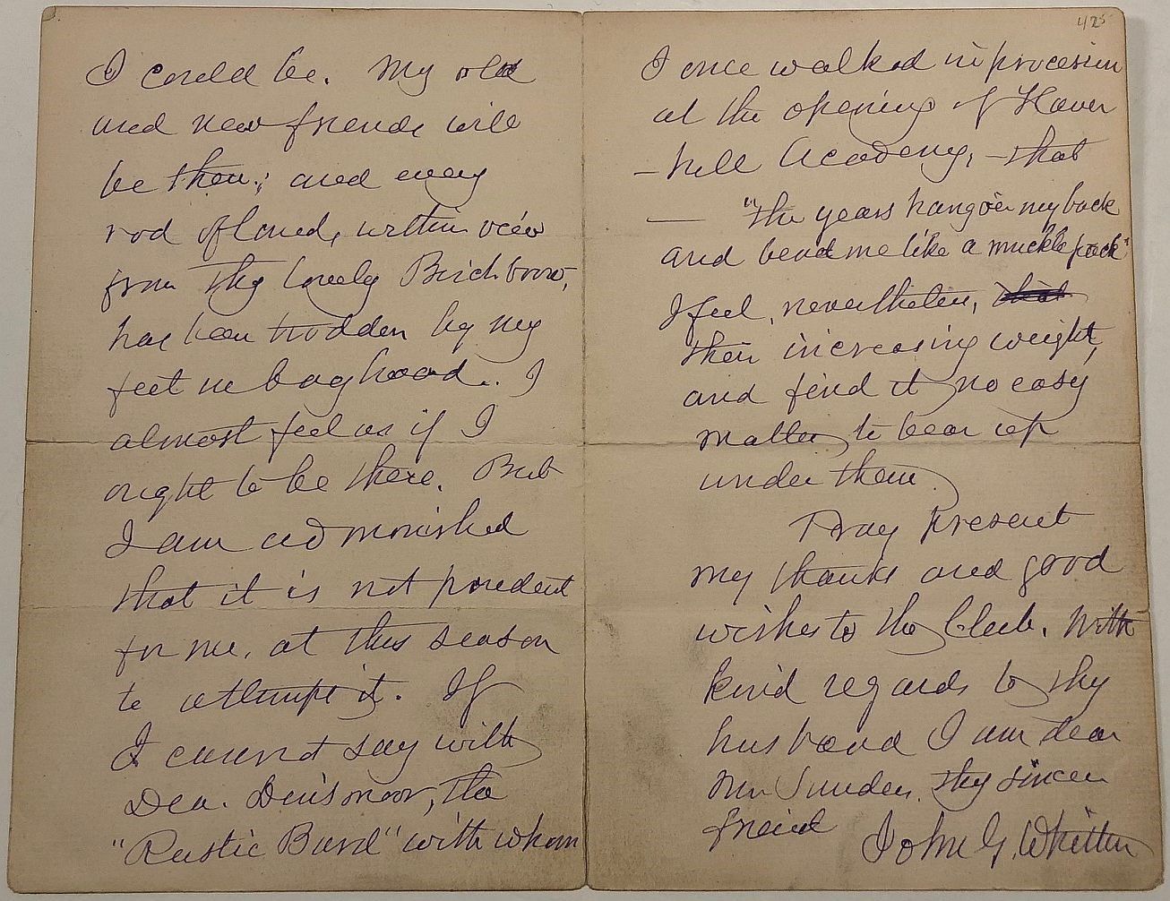 Oak Knoll, 1887. unbound. very good. 3 pages (front and back) each measuring 7 x 4.5 inches, Oak Knoll, February 12, 1887, declining an important invitation due to bad health, in part: "...Among the hundreds of kind letters which are reaching me from all parts of the country, no one has given me more pleasure than thine informing me that the club, which honors me by its name, will meet at thy residence on the 17th, and inviting me to be present on the occasion. I wish, from my heart, I could be. My old and new friends will be there...I almost feel as if I ought to be there. But I am so admonished that it is not important for me at this season to attempt it. If I cannot say to Dear Garrison, that 'Rustic Bard' with whom I once walked in procession at the opening of Haverhill Academy that: 'the years hang on my back and bleed me like a muckle pack.' I feel nevertheless (my feet), their increasing weight, and find it no easy matter to be up under them..." Horizontal folds; very good condition.
