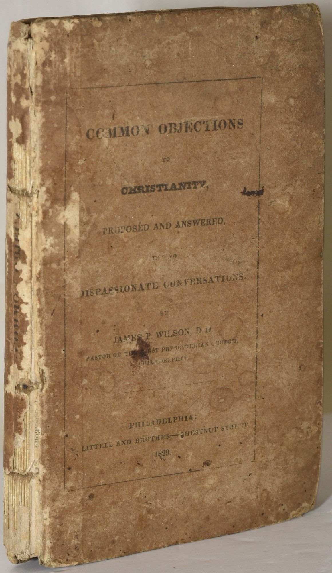 Philadelphia: E. Littell and Brother, 1829. First Edition. Good binding. An apologetical work written in an interesting format: two conversations between a missionary returning from the field -- The Rev. Jedediah Andrews, the first Presbyterian pastor in Philadelphia -- and a ship's captain and his mate. In the publisher's boards which are worn, especially at the spine. The boards are holding well. There is a 19th century gift inscription. Foxing throughout. (Shoemaker 41560). Good binding.