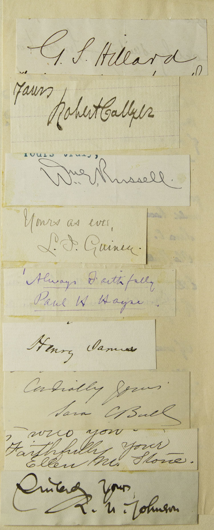On the back of the sheet onto which the signatures are laid down is a note identifying each of the signatories, which ends, "All except R.N.J.––who is merely a literary acquaintance of the Century office––are or were personal frineds. That is, W.E.R. was once my pupil, and so, a friend