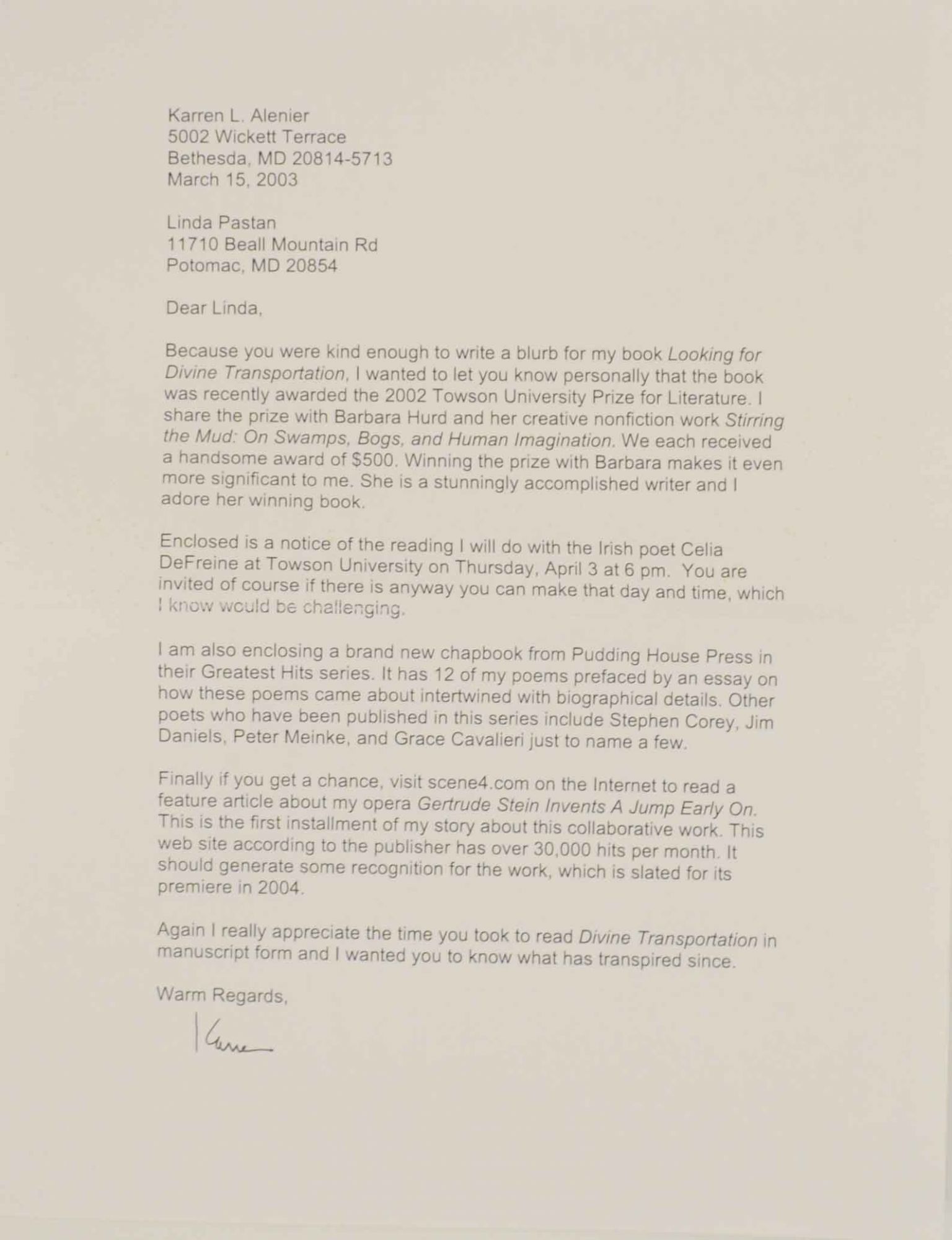 Johnstown, OH: Pudding House Publications, 2003. First edition. Softcover. Features 12 poems by Alenier along with an essay by her on how they came about. An about very good copy in wrappers with some creasing throughout and some fading to the rear panel. Signed and inscribed by Aliener to poet Linda Pastan and with a laid in letter from Alenier to Pastan presenting this book and thanking her for previously writing a blurb for a different book. Scarce, with only 6 copies listed in OCLC.