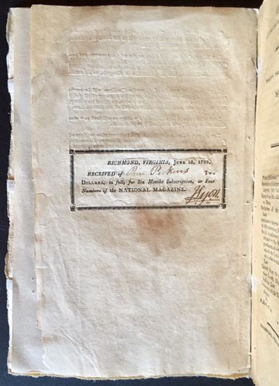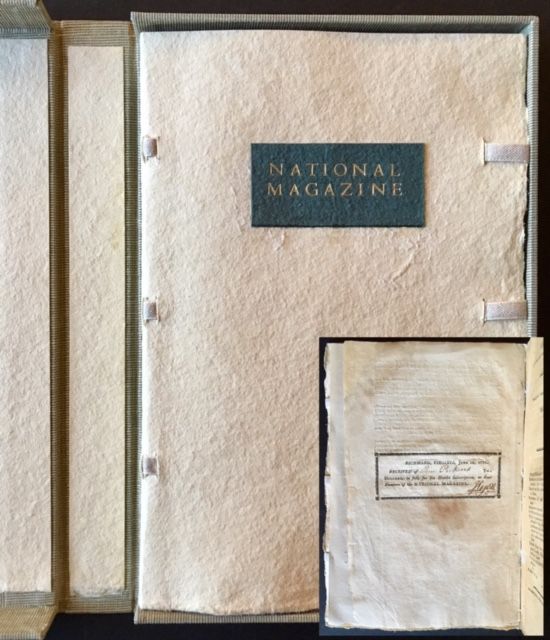 Richmond, Virginia: James Lyon, 1799. Original wraps. Good +. The June 1st, 1799 maiden issue of "National Magazine", which represents the first magazine ever published in Virginia, the first magazine printing of the Virginia Constitution and Kentucky Resolutions, and "an extraordinary contemporary resource for the anti-Federalist, Jeffersonian, Strict Constructionist philosophy of the Virginia School, a philosophy that Virginians developed to oppose the policies of Alexander Hamilton and the Washington-Adams administrations " (from "The Remnant Trust"). This, the "first National Magazine", was issued in Richmond by its young publisher and editor, James Lyon, and was printed semi-quarterly. Six issues all told were published in Richmond, "after which Lyon removed to the new seat of the Federal government". This orginal issue has been beautifully and skillfully re-bound (in 1998) by the Thistle Bindery of Florence, MA and has had both its original light-brown wrappers seemlessly bound-in. The wrappers show chipping along the edges and a degree of inevitable wear but, miraculously, almost no loss to the titling. Crisp new endsheets and thick card wrappers nicely protect the fragile original text, which has held up surprisingly well. There's a bit of light, forgivable offsetting to the body --and along the original endsheets-- and the Subscription page, which shows that one "Prin Perkins" is to receive a six month subscription for the price of two dollars, INCLUDES JAMES LYON'S STRONG SIGNATURE IN INK AS AFFIRMATION. Octavo, 107 original pgs. plus an itemized laid-in letter from Thistle Bindery and a wonderful handwritten 2 pg. example of "Binder's Notes" along the new rear endsheets, mapping out the care --and the technical processes-- that went into both creating such an elegant re-binding and protecting the original text. An impressive, important piece of Americana.