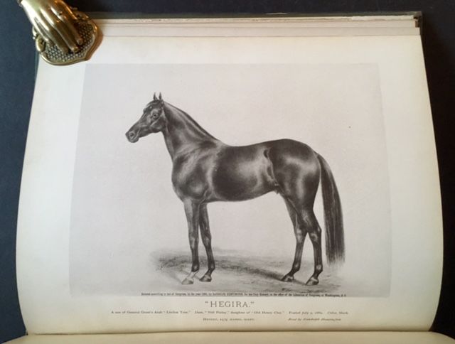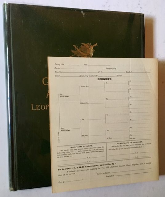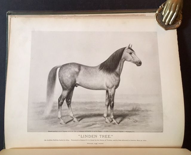 Philadelphia: J.B. Lippincott, 1885. Cloth. Very Good. The uncommon 1885 1st edition of this wonderful look at General Ulysses Grant's beloved Arabian Stallions "Leopard" and "Linden" and their sons "Beale", "Hegira" and "Islam". A fragile book, given its age, but this copy has held up very well: Solid and VG in its green cloth, with bright gilt-titling and insignia along the front panel. A degree of scuffing to the rear panel and very light chipping along the edges of the title page, otherwise very clean. Lovely sketch of "Leopard" (by H.S. Kittredge) at the frontispiece and additional sketches of "Linden Tree" (also by H.S. Kittredge), "General Beale" (by A.J. Schultz), "Hegira" (by R. Vandusen) and "Old Henry Clay" (by H.S. Kittredge) thru the text. All of the portraits are in pristine condition and include their original tissue-guards. Tall quarto, all edges gilt, very informative, 66 pg. narrative by Randolph Huntington. Also includes a laid-in period "Pedigree" sheet, which is unmarked. A fascinating piece of Americana and late 19th century equine history.