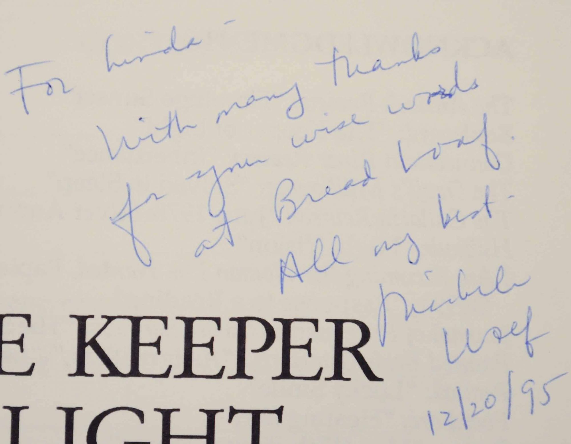 Philadelphia, PA: Painted Bride Quarterly, 1995. First edition. Softcover. 24 pages. A slim colection of poetry that was the 1995 Painted Bride Quarterly Poetry Chapbook Winner. A close to near fine copy in stapled wrappers with some slight foxing. Signed and warmly inscribed by Wolf on the title page to poet Linda Pastan in the year of publication. Uncommon.