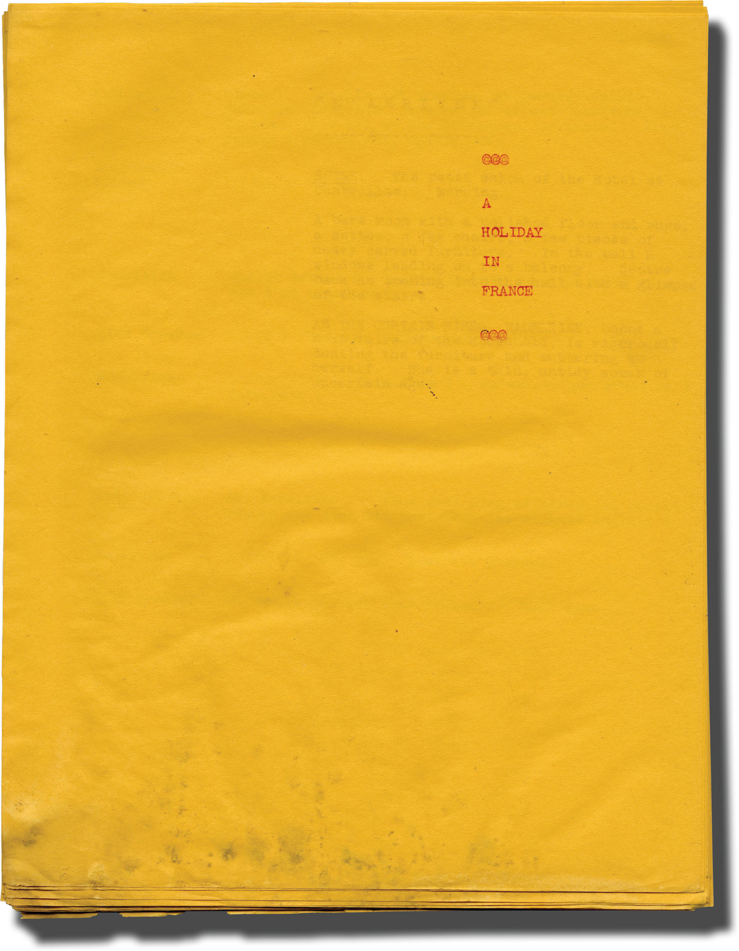 N.p.: N.p., 1950. Treatment script for an unproduced film. Ribbon copy typescript, with type in black and red.