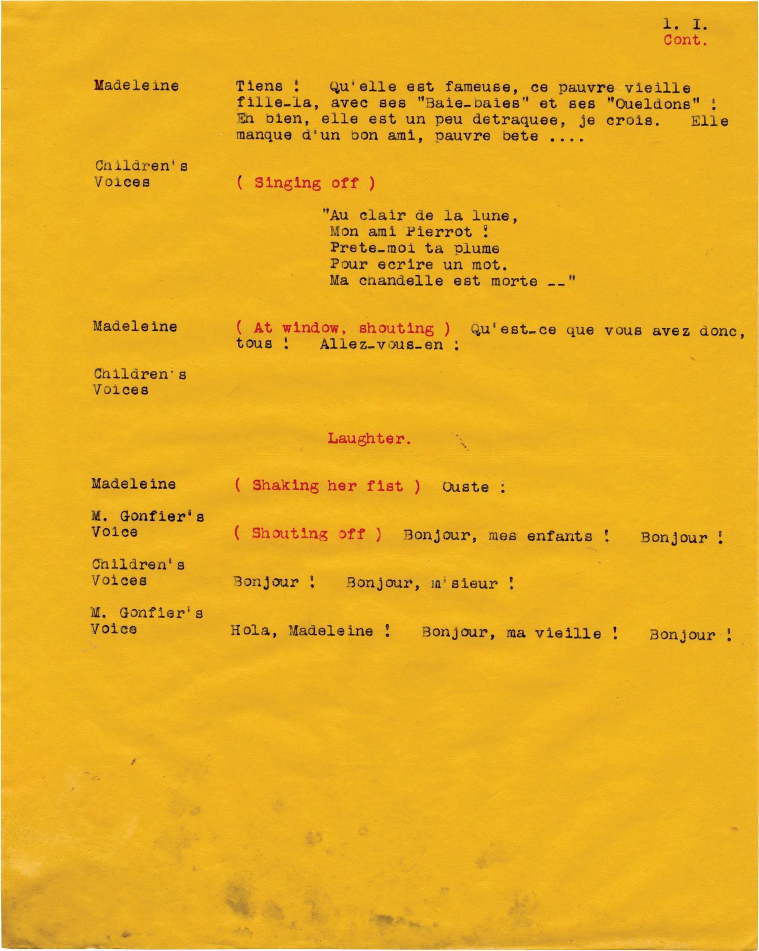 A family visits France and deals with all sorts of upper class conveniences and distractions, including eating dinner and being invited for tea. Text in English and French.