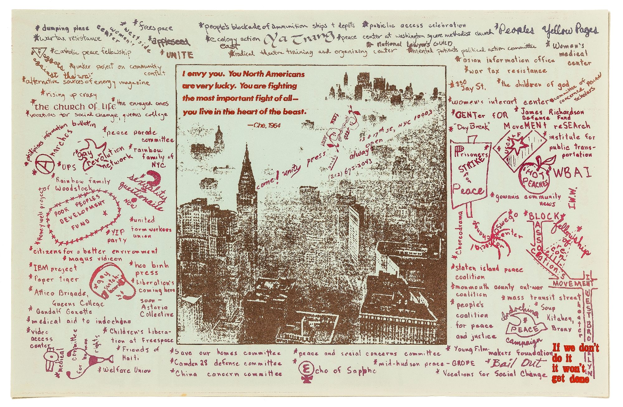 New York: Come!Unity Press, 1972. Unbound. Fine. Quarto measuring 17" x 11" on blue paper. Fine. A reproduction of a hand-written explanation of the mission of the Come!Unity Press, the costs of running the press, etc, over an illustration of machine drums, verso with an illustration of the Manhattan skyline with a Che Guevara quote inset and surrounded by the names of dozens of local collectives and the motto “If we don’t do it / it won’t get done.”.