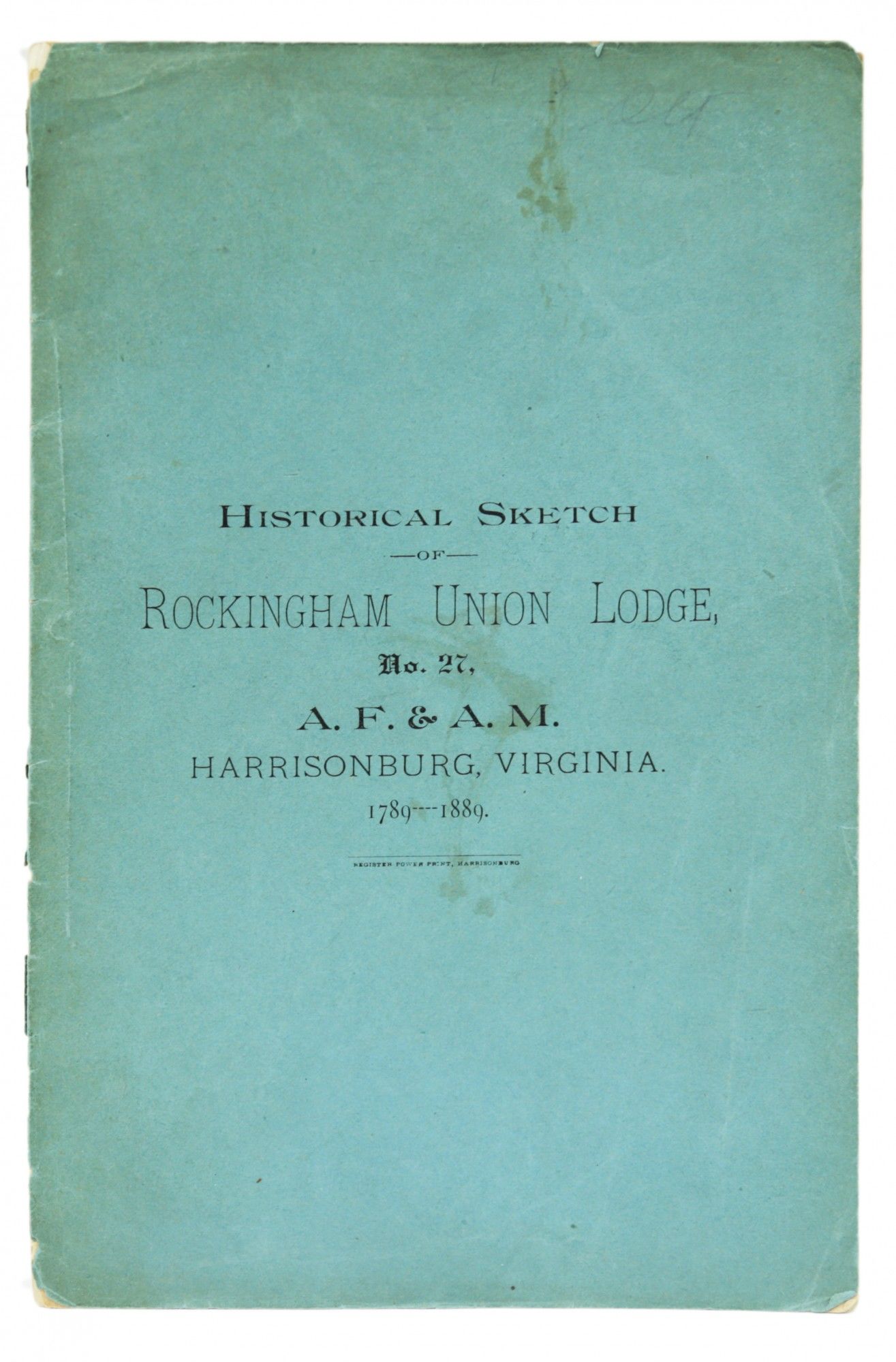 [MASONIC] HISTORICAL SKETCH OF ROCKINGHAM UNION LODGE, No. 27, A.F. & A.M., HARRISONBURG, VIRGINIA. 1789-1889