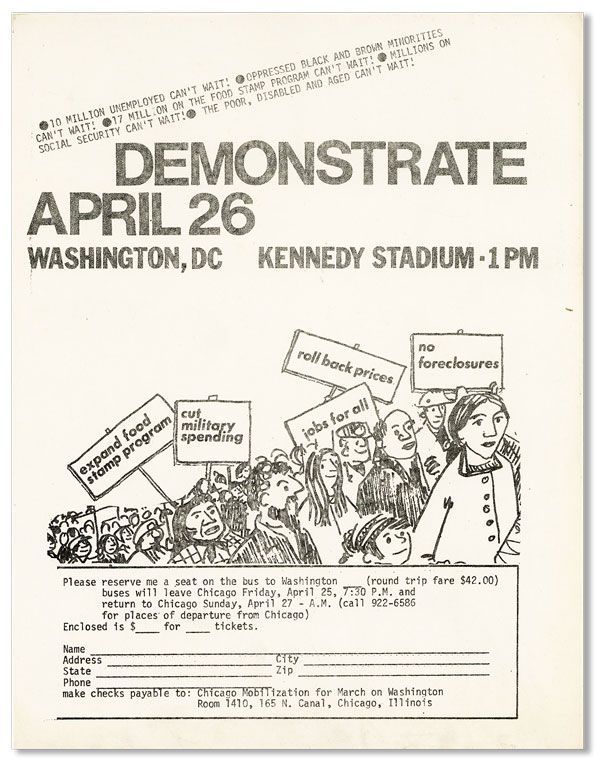 Chicago: Chicago Mobilization for March on Washington, N.d. [1975?]. Broadside (bulletin-board flyer), 11" x 8-1/2". Mimeographed; printed recto-only on standard white bond. Near Fine. Protest flyer, announcing a March on Washington DC to protest unemployment, inflation, military spending, and welfare roll-backs. With reservation blank (unused) at bottom margin.