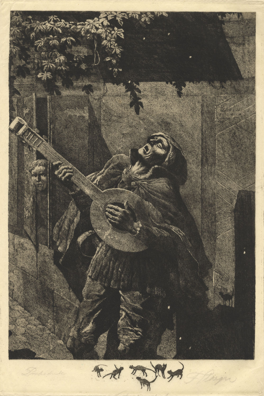 370 x 249 mm + wide margins. Titled "Ständchen" in pencil and signed by the artist in pencil at lower right, just within platemark, with "Probedrucke" (proof) in pencil at lower left; remarque of six cats to center. Printed on japan paper. A fine, strong impression.