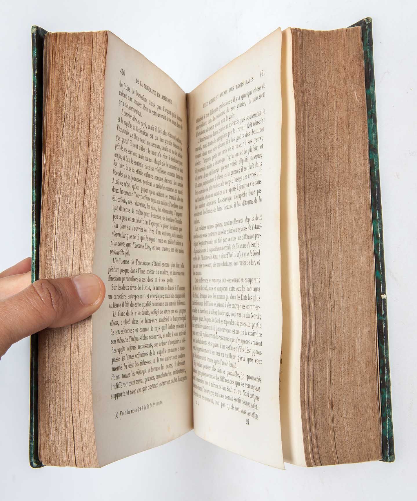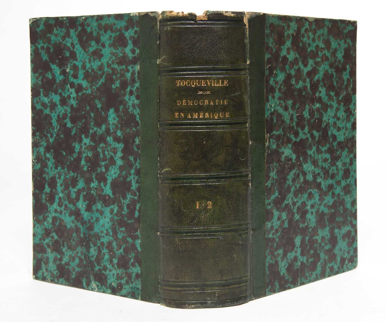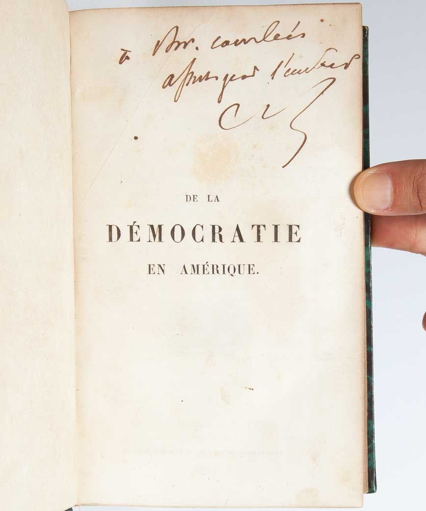Paris: Pagnerre, 1850. Thirteenth Edition. Revised, corrected and augmented with a comparative examination of democracy in the United States and Switzerland, and an appendix. Text in French. Inscribed by the author: "à M. Courbis offert par l'auteur AT." Bound in a contemporary French binding of green quarter morocco over paper boards, marbled end-papers. Two volumes bound together in one, collating: viii, 512; viii, 476. Binding with slight chipping at the head of the spine, otherwise in excellent condition. Besides the present example, only one other inscribed copy of this 1850 revised edition can be found in the auction record, selling for 11,875 euro in 2013.