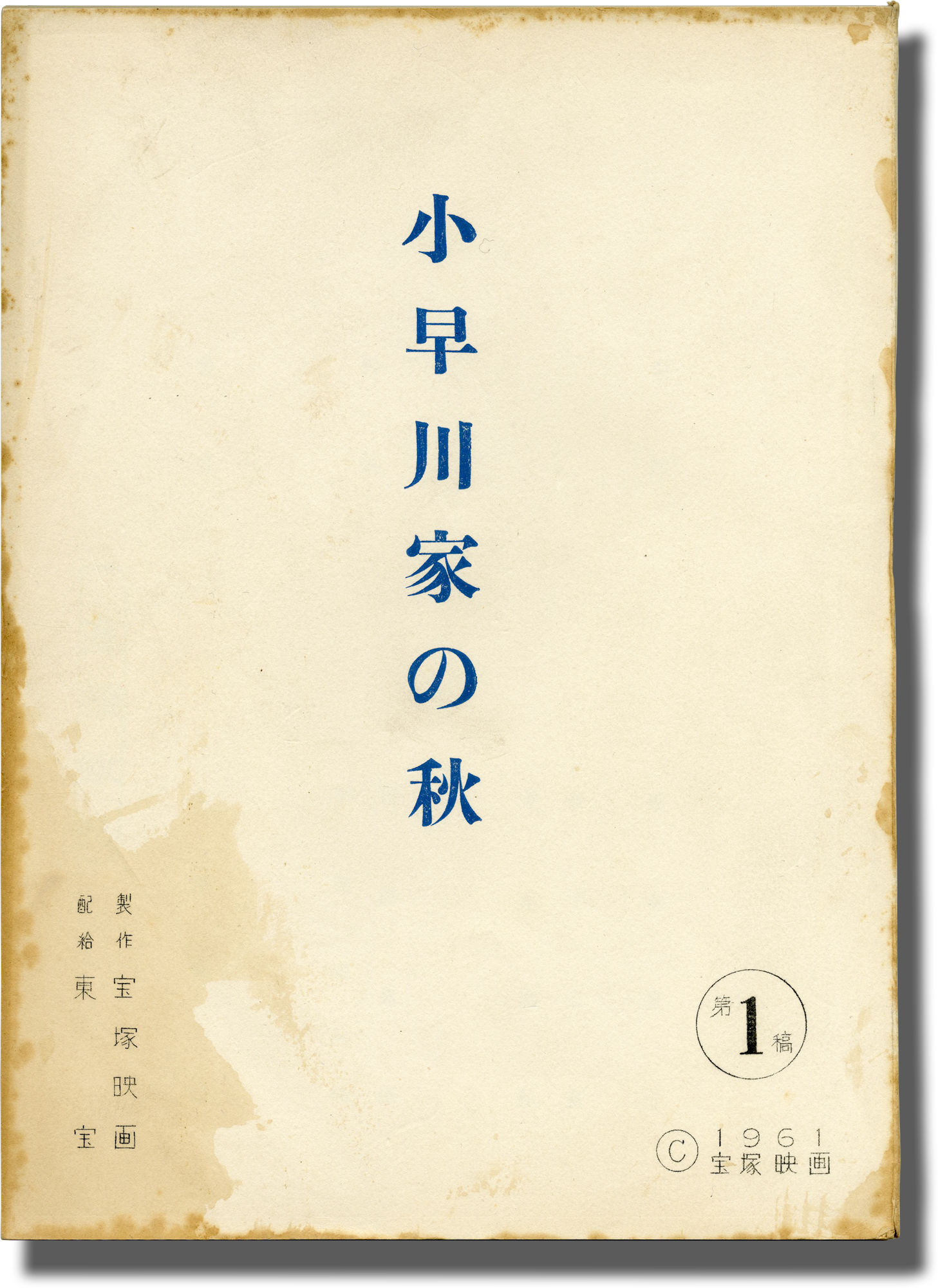 Tokyo: Takarazuka Productions, 1961. First Draft script for the 1961 film. Working copy belonging to uncredited crew member Takahashi Toshihiro, with his name rubber stamped on the first leaf and the last page of text.