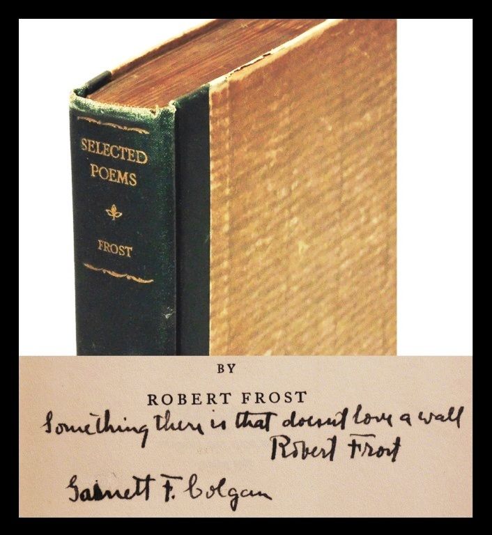 New York: Henry Holt and Company, (1928). First Edition. Hardcover. Two facing pages tanned from a previously laid in newsclipping, another two facing pages with old adhesive stain at the gutters; slightly shaken. Very Good, lacking the dustwrapper. Cloth-backed boards. This copy is INSCRIBED "Garnett F. Colgan" and SIGNED by the poet on the title page with one of his most famous first lines, from "Mending Wall" from his collection NORTH OF BOSTON: "Something there is that doesn't love a wall."