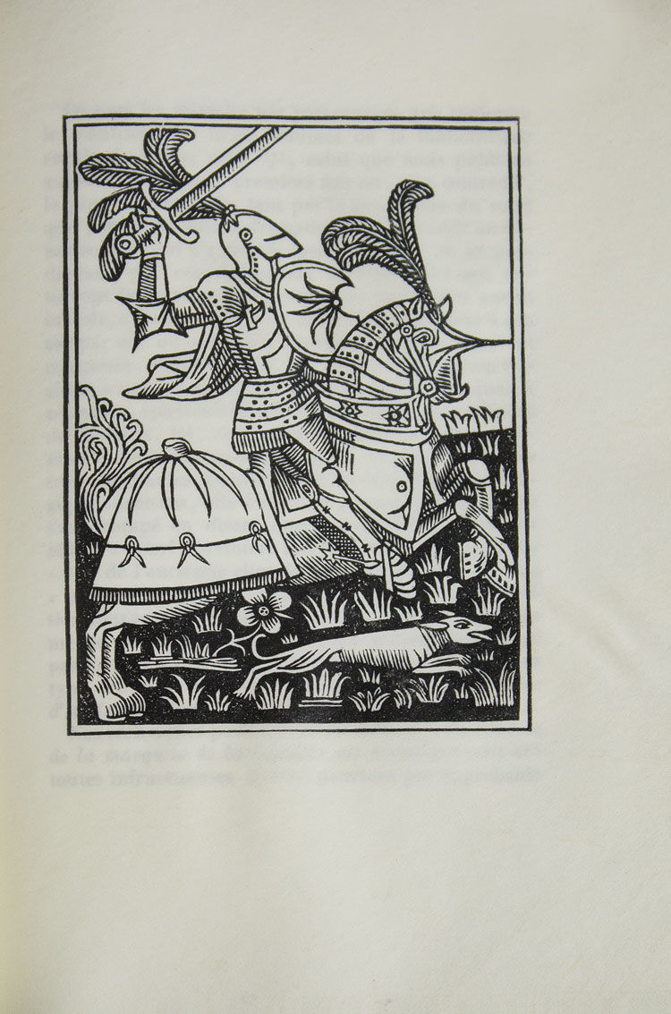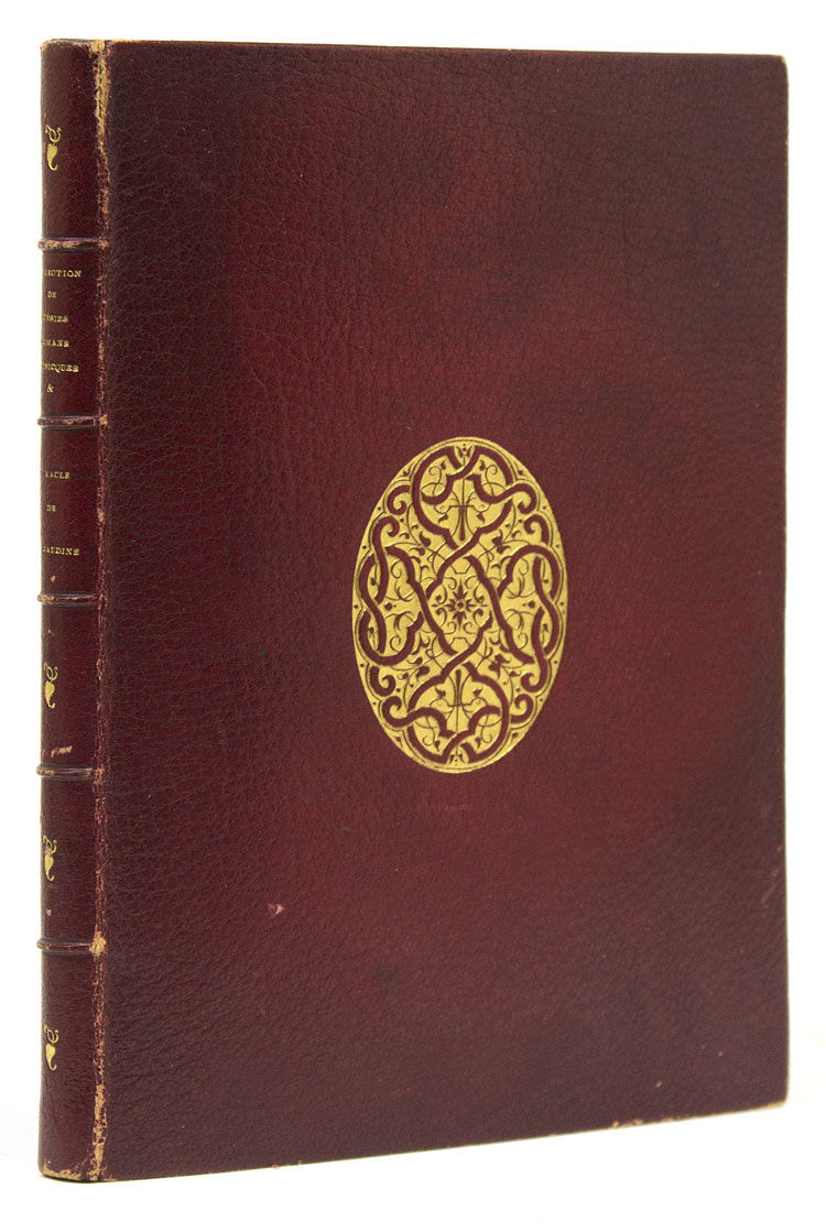 [Paris: Printed by Crapelet for Silvestre, 1841. First printed edition, one of 4 copies on vellum. Woodcut vignette on title, full page woodcut at end. [64], [2] pp. Gothic type. 12mo (6 x 4-1/2 inches; 15 x 11.5 cm.). Full red morocco with central strapwork medallion by Capé. Some rubbing to joints, but fine. First printed edition, one of 4 copies on vellum. Woodcut vignette on title, full page woodcut at end. [64], [2] pp. Gothic type. 12mo (6 x 4-1/2 inches; 15 x 11.5 cm.). A fine example of vellum printing by Crapelet, being volume 11 in the series, published by Silvestre, titled "Collection de poésies, romans, chroniques etc. publiée d'après d'anciens manuscrits et d'après des éditions des XVe et XVIe siècles." The first printed edition of an anonymous 14th century poem that employs a favorite medieval trope, that of the falsely accused wife. "The uncle of the marquise seeks in vain to seduce her during her husband's absence. Desiring revenge for his repulse, he puts a dwarf in her bed while she sleeps, pretends to find him there, murders him, and accuses the marquise of adultery. The husband on his return condemns her to be burned alive. Fortunately a knight whom she has formerly befriended arrives at this juncture, proclaims her innocence, and challenges whosoever may deny it. The uncle accepts the challenge, is conquered, and admits the falsity of the accusation. The marquis and marquise are reunited, while the knight is rewarded with half the former's lands. The rôle of Nostre Dame is subordinate as she descends from heaven only to comfort the marquise and assure the knight of her innocence" (Lancaster, "The French Tragi-Comedy" p 9). The woodcut vignette on the title, showing the marquise being carted off to her punishment, was based on the miniature in the original manuscript in the Bibliothèque Royale. The final full page woodcut shows an armored knight on horseback. Brunet notes that the editions in this series were especially cherished by bibliophiles "par sa belle exécution typographique" Brunet III, 1743 and II, 138. Provenance: Robert Hoe (morocco bookplate; Catalogue of Books Printed in Foreign Languages ... in the Hoe Library, Vol III, p. 236)