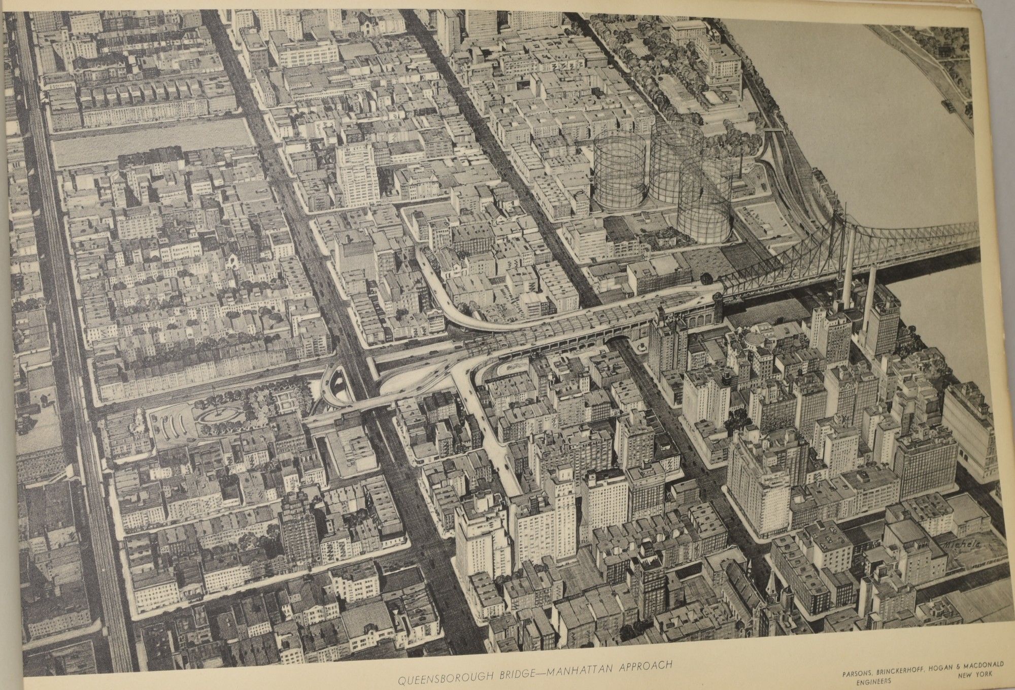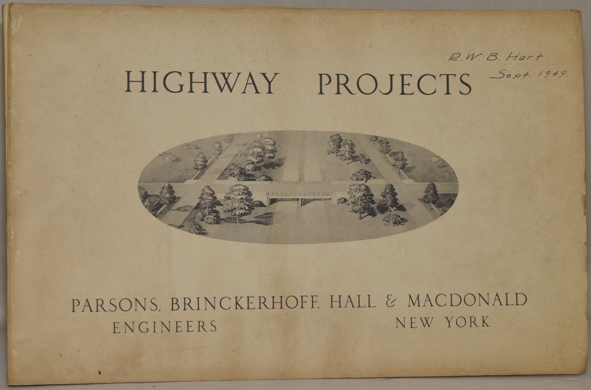 [New York], 1949. Ten plans prepared by the engineering firm, Parsons, Brinckerhoff, Hall & MacDonald in New York, and demonstrating the remarkable expansion of infrastructure during the immediate post-war economic boom years in the United States. Dated from 1946 to 1949, the plans are (1) Queensboro Bridge-Manhattan Approach. Plan for the Alleviation of Traffic; (2) Lynchburg Distribution Road. General Plan. (3) Plan for Toledo Waterfront Expansion; (4) Susquehanna River Bridge; (5) Plans of Proposed New Hampshire Turnpike; (6) Route 100. Secaucus to Ridgefield, General Plan; (7) Allegheny County [Pennsylvania] Bridges; (8) Wilbur Cross Parkway, Twin Bore Tunnel. West Rock-New Haven; (9) Northern-Sagtikos State Parkway Extension; and (10) Prospect Avenue Expressway, Bureau of Brooklyn. General Plan. Substantial oblong folio -- 11" x 17" - 51 leaves; with illustrations, maps, sketches and plans. The leaves are mostly printed on the versos, but some printed on both sides.