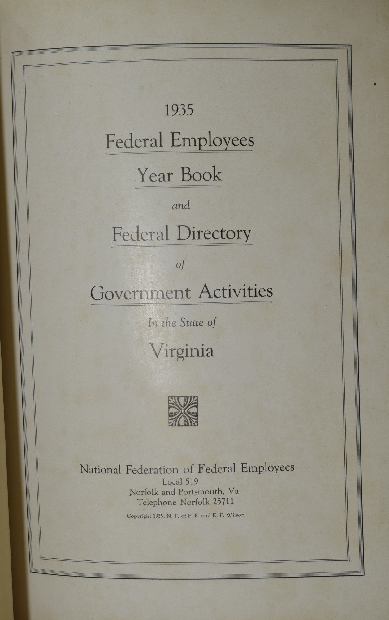1935 FEDERAL EMPLOYEES YEAR BOOK AND FEDERAL DIRECTORY OF GOVERNMENT ACTIVITIES IN THE STATE OF VIRGINIA