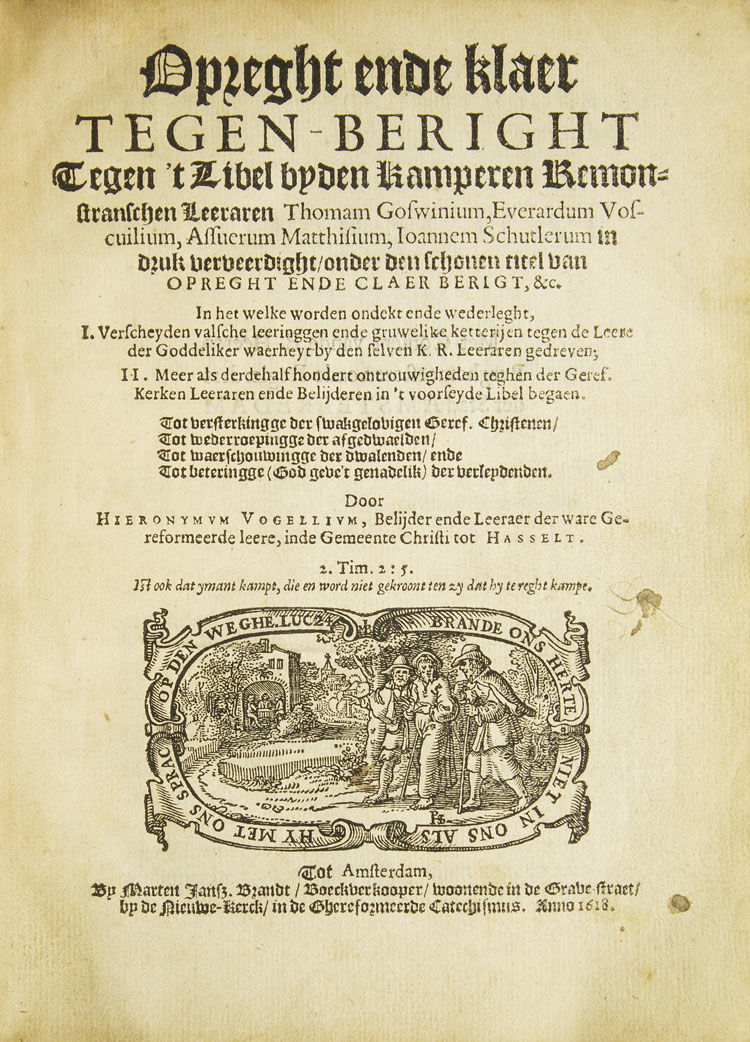 Opreght ende Klaer Tegen-beright Tegen 't Libel by den Kamperen Remonstranschen Leeraren Thomam Goswinium, Everardum Voscuilium, Assuerum Matthisium, Joannem Schutlerum in druk verveerdight, onder den schonen titel van Opreght ende Claer berigt, etc ... Belijder ende Leeraer der ware Gereformeerde leere, inde Gemeente ... tot Hasselt .
