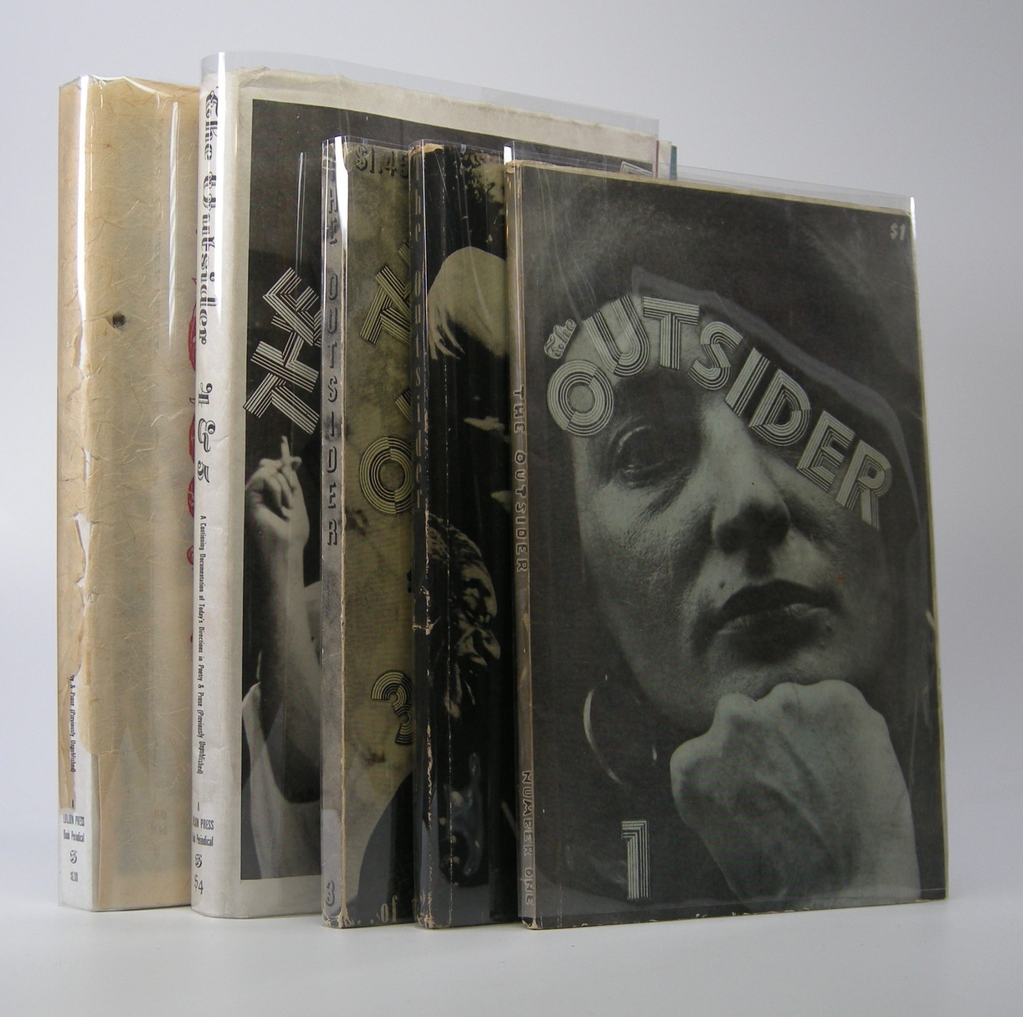 New Orleans: Loujon Press, 1961. All published. Fine copies with just the slightest rubbing to extremities; delicate and scarce dust jacket on the clothbound volume with tears and chips to spine and folds. Five volumes in four, 8vos, 101, 112, 138, [198]pp; wrappers; with a second copy of the final double number in cloth. The complete run of this unique and important magazine, best known for publishing the early work of Charles Bukowski. Each issue was hand set and printed by letterpress and reflected publishers Jon and Louise "Gypsy Lou" Webb's distinctive sense of quirkiness in design, using multiple stocks and colors of paper, as well as a variety of fonts and type-sizes. In addition to Bukowski, The Outsider also published a who's who of Beats and key figures of early '60s literature and poetry, including: Russell Edson, Gregory Corso, Gary Snyder, Allen Ginsberg, Lawrence Ferlinghetti, Robert Creeley, William S. Burroughs, Diane Di Prima, Michael McClure, Jack Kerouac, and many many others. The final issue incorporates "Homage to Kenneth Patchen" featuring tributes from numerous poets and acolytes. Laid into this number is the separate insert of pressed, dried flowers picked from "inside a mile of Geronimo's grave. . ." included as a good luck charm with this volume and with an explanatory leaf affixed with a paper clip. The cloth issue was limited to 500 copies. A truly complete set, in excellent condition, and scarce thus.