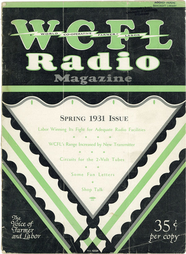 Chicago: WCFL Radio Magazine Co, 1931. First Edition. Quarto. Printed wrappers; 34pp. External rubbing and wear; withdrawn duplicate from the Bancroft Library, with small ink hand-stamp to front wrapper; Very Good. Quarterly journal devoted, oddly, to equal parts technical aspects of radio broadcasting and farmer-labor politics. Current issue contains lengthy feature article by Paul Stephens, outlining the potential of radio for labor organization, as well as technical articles on television and radio servicing and repair. Extremely uncommon; OCLC notes just a single location (Chicago Historical Society).