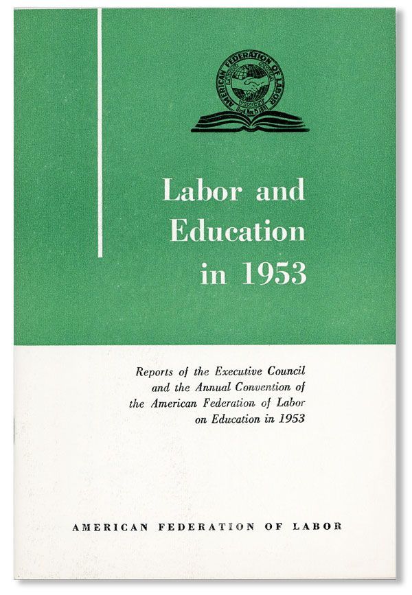Washington DC: American Federation of Labor, 1953. First Edition. 12mo. Staple-bound pamphlet; printed card wrappers; 80pp. Fine. Report of the AFL Education Committee to the 72nd Convention of the American Federation of Labor. Photo-illustrated.